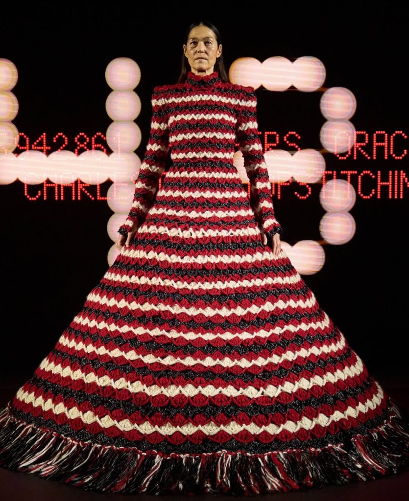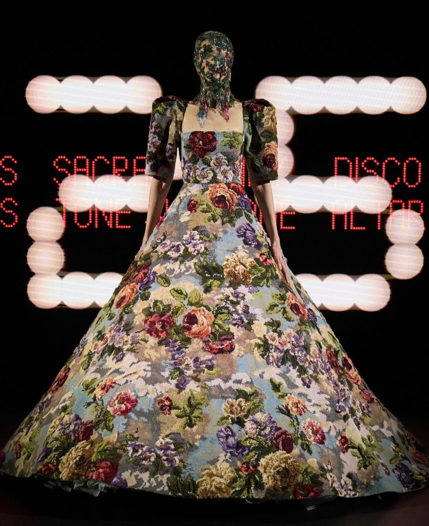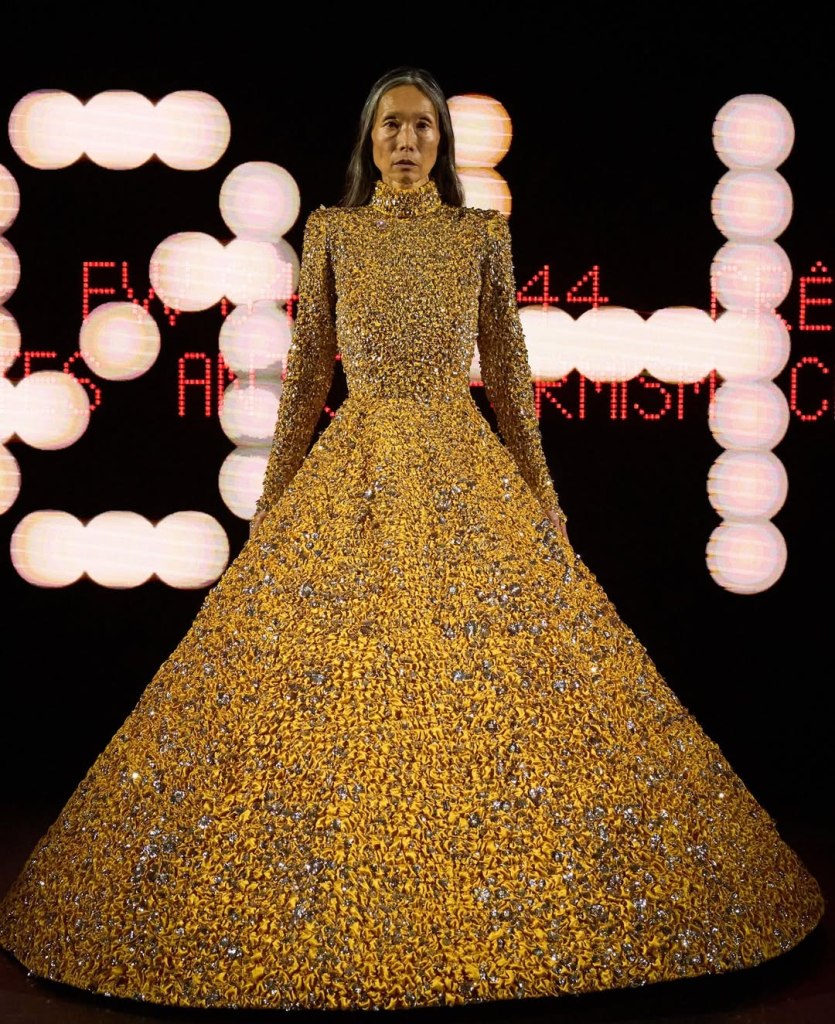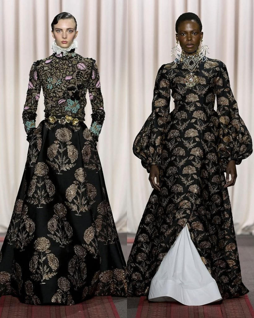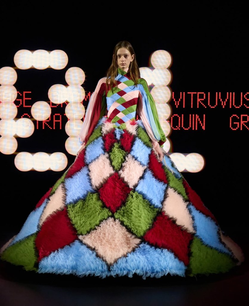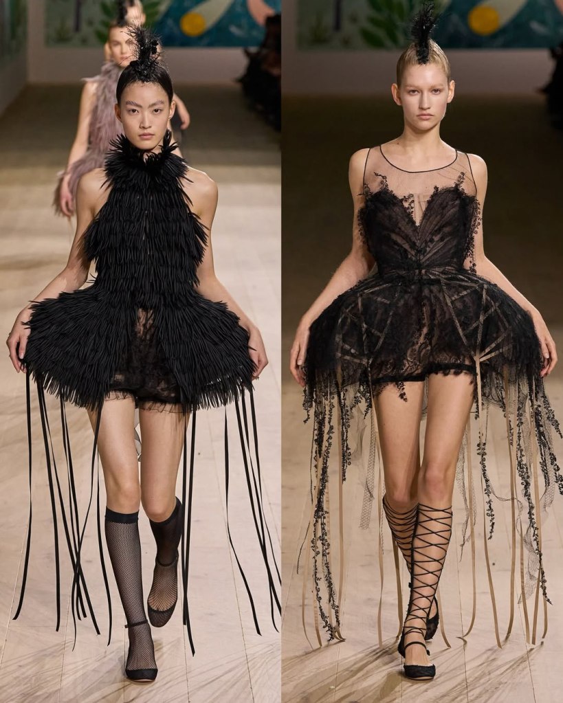 Valentino: Alessandro Michele’s haute couture debut for Valentino, “Vertigineux,” was a dizzying, intellectual meditation on fashion as history, narrative, and spectacle. Michele is known for his maximalist tendencies, and he did not hold back. The collection was an exploration of Valentino’s rich archives, historical silhouettes, and an obsessive attention to detail. Inspired by Umberto Eco’s philosophy on lists, Michele structured the show as an endless catalogue of references—Venetian carnivals, medieval nuns, 18th-century crinolines, and silent film stars all found a place within his tapestry of influences. Each look was accompanied by scrolling text that detailed its inspirations, a fitting touch for a designer who thrives on narrative.