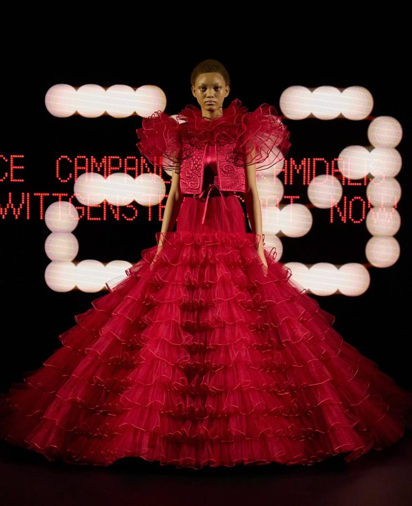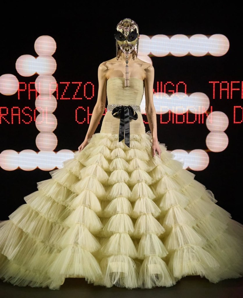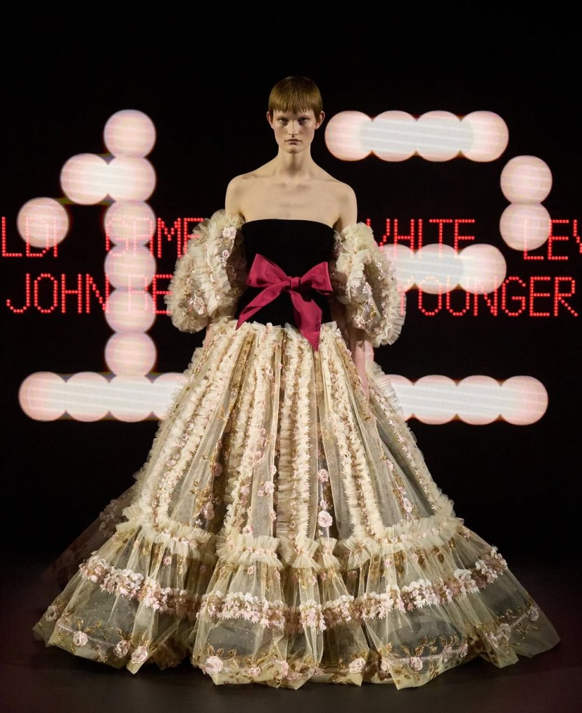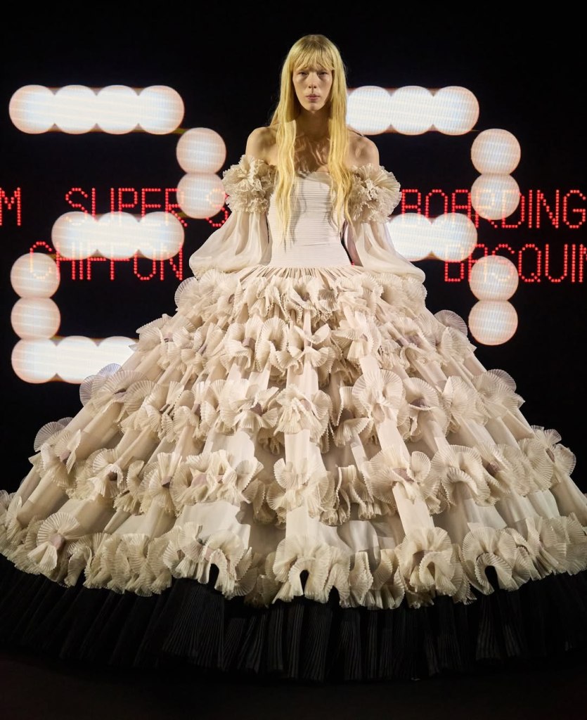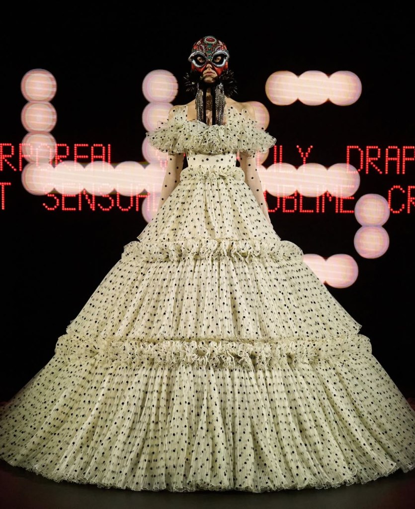 The collection’s standout features were the intricate bamboo crinolines and lace-edged gowns that combined couture craftsmanship with theatrics.