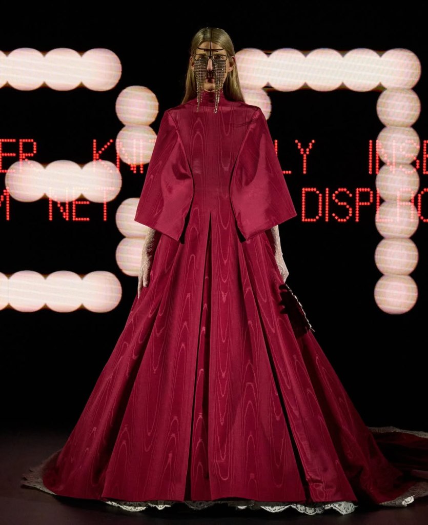 The collection featured armor-like sequined gowns, baroque opera coats, dramatically voluminous crinolines, and exquisitely tailored mourning dresses. The Valentino red—a house signature—was reinterpreted in dramatic forms, including a voluminous scarlet crinoline and a Pope-inspired moiré robe. Lace, ruffles, and intricate beading adorned everything, Michele’s ability to blend different historical periods into something both cohesive and dreamlike was on full display. One moment, we were in 18th-century Versailles; the next, in 1930s Hollywood.