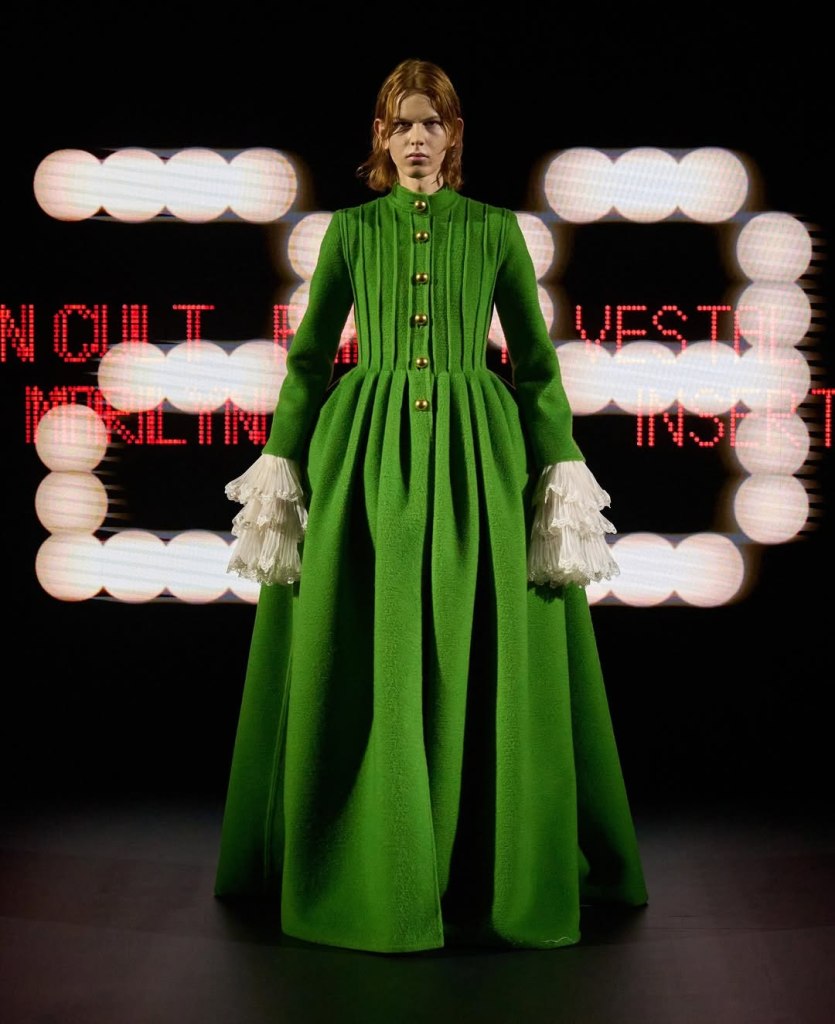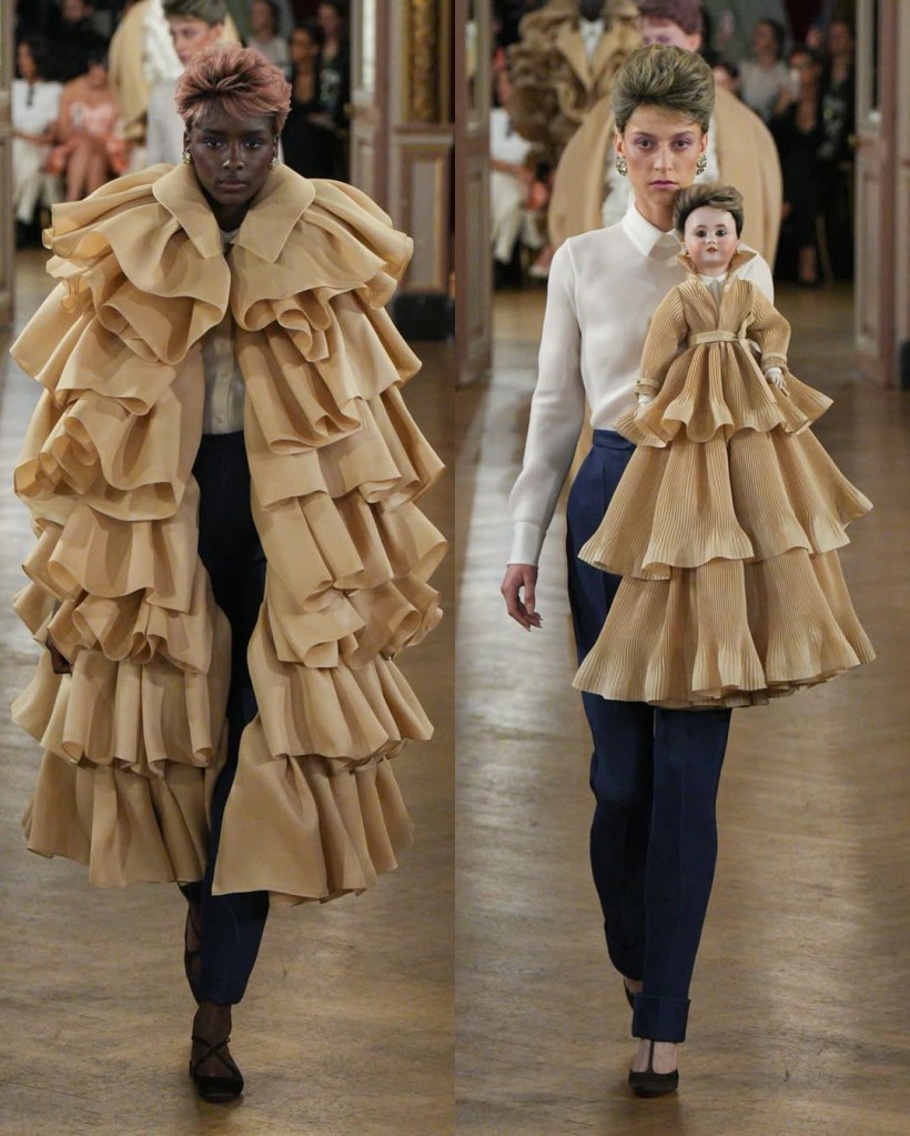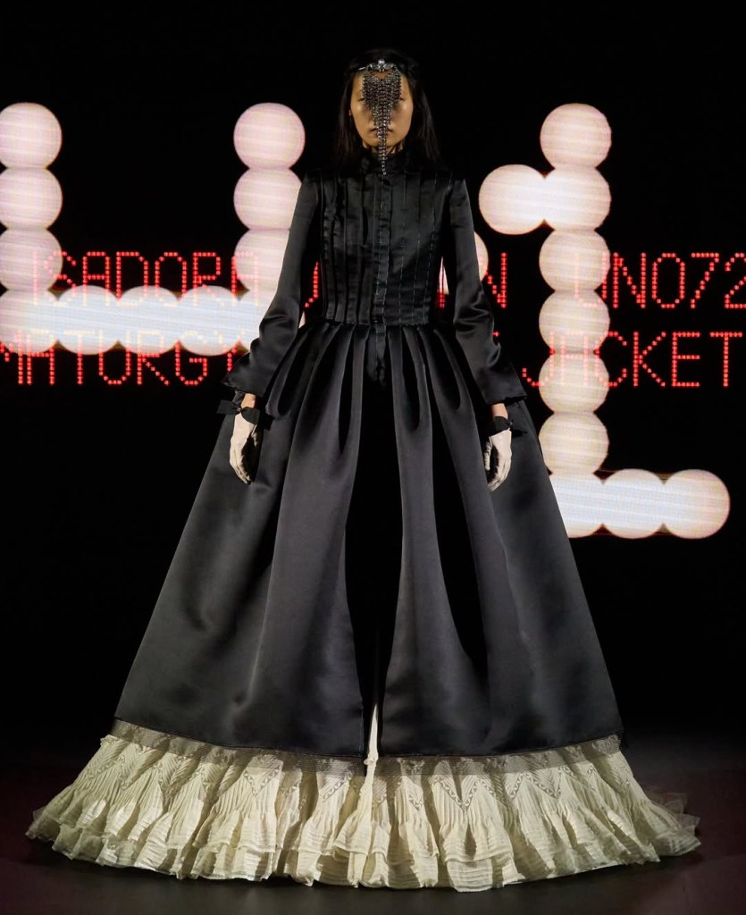 Some pieces were sleek and tailored, emphasizing sharp lines and crisp silhouettes, while others exploded with volume, featuring exaggerated ruffles, oversized collars, and grand, sculptural shapes. One standout look included a trench coat with raw edges curling naturally, adding an organic, unfinished quality to the otherwise polished presentation. A life-sized recreation of a Victorian doll dress added an unexpected theatrical twist, while other designs played with layering and structured draping. The concept? AI’s ability to endlessly remix and reinterpret a single idea—except, as the designers put it, “we are our own AI.”