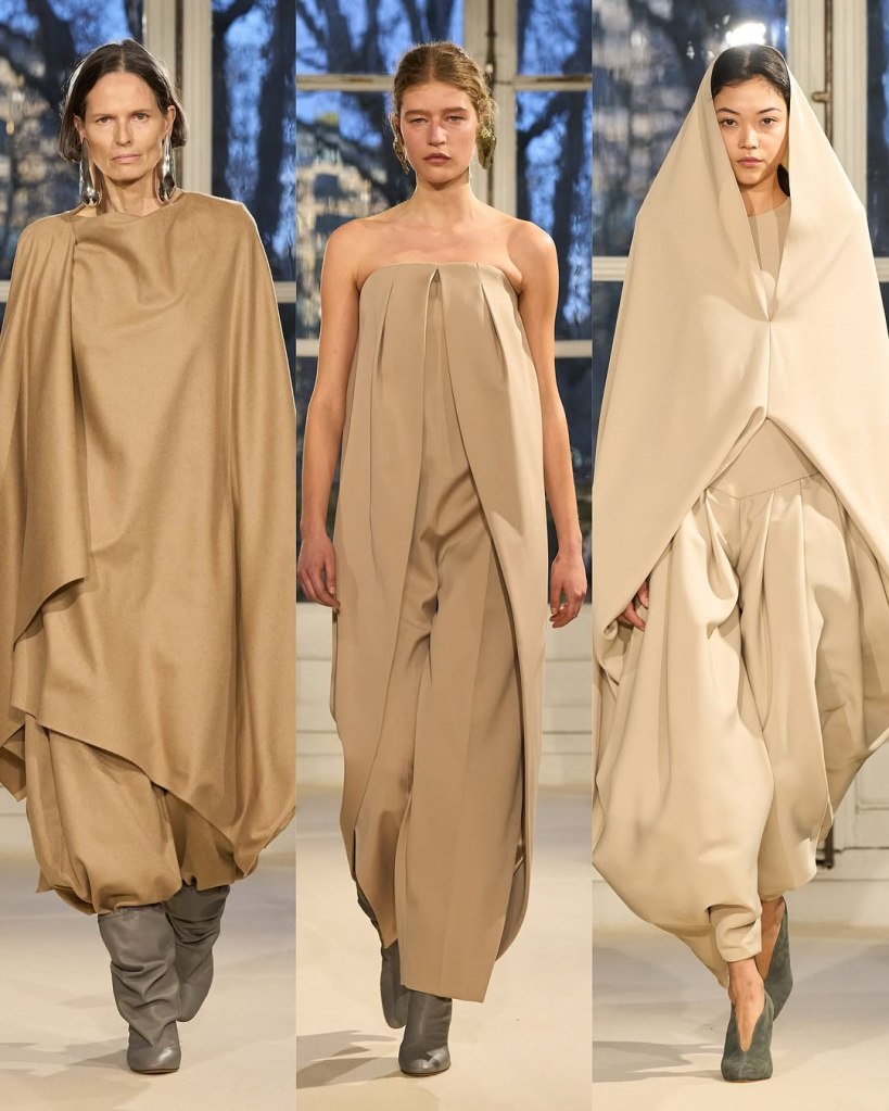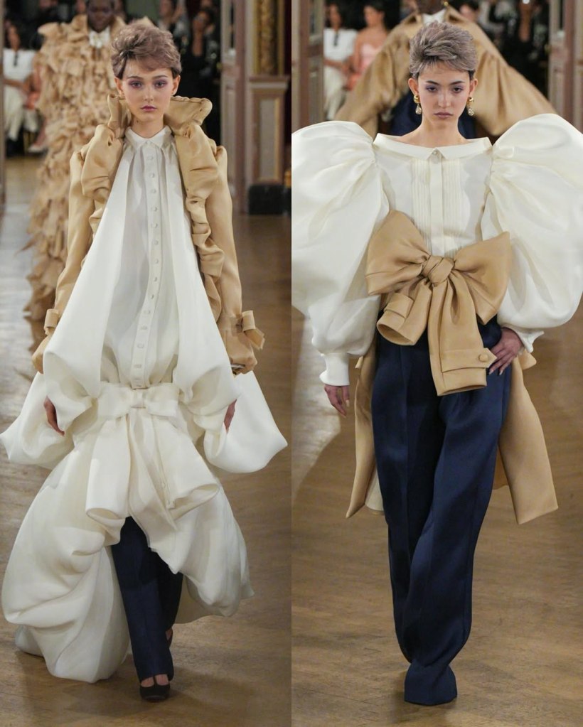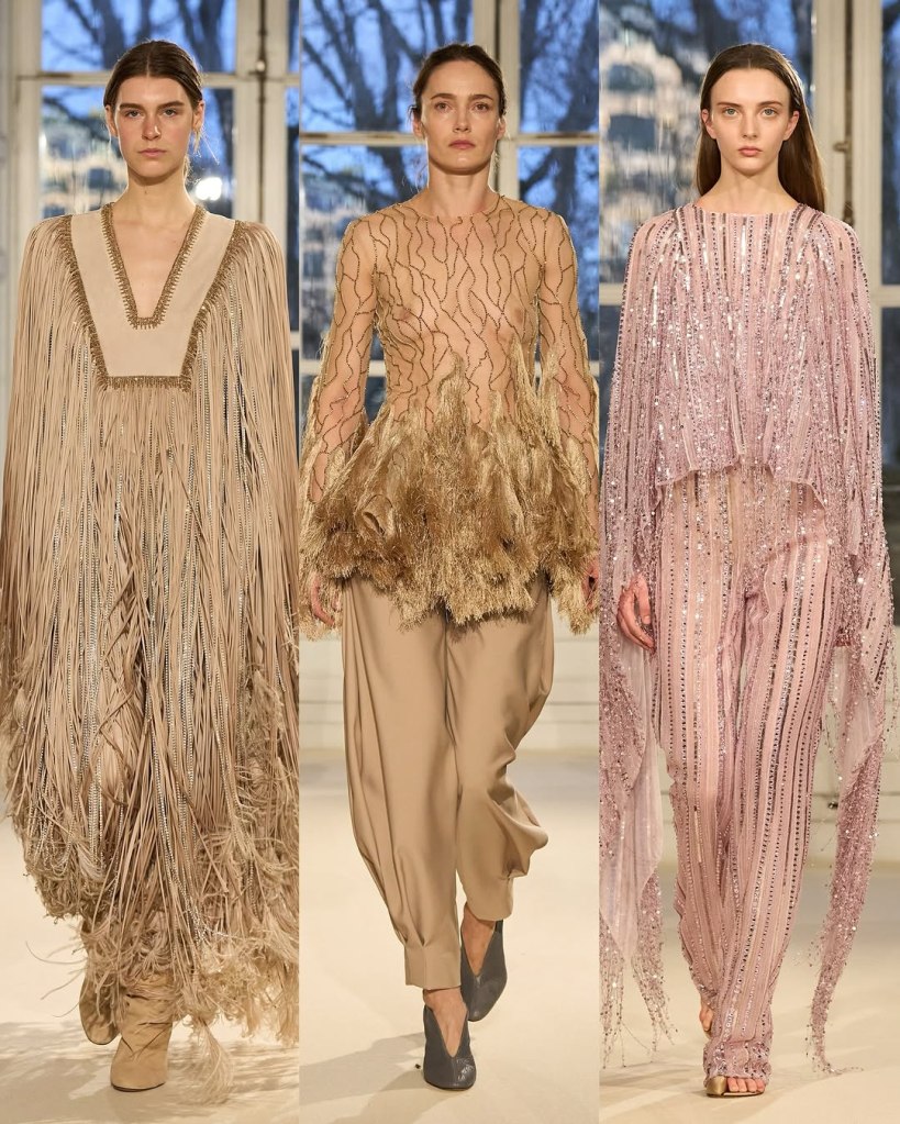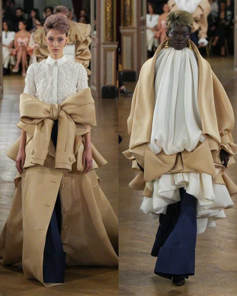The opening look—a sand-colored draped cape over trousers tucked into boots—perfectly captured his new vision: timeless elegance with a modern edge. Blazers, pant suits, and impeccably cut silhouettes dominated the collection, reinforcing the idea that couture is as much about personal experience as it is about spectacle. But Vauthier still delivered statement moments.