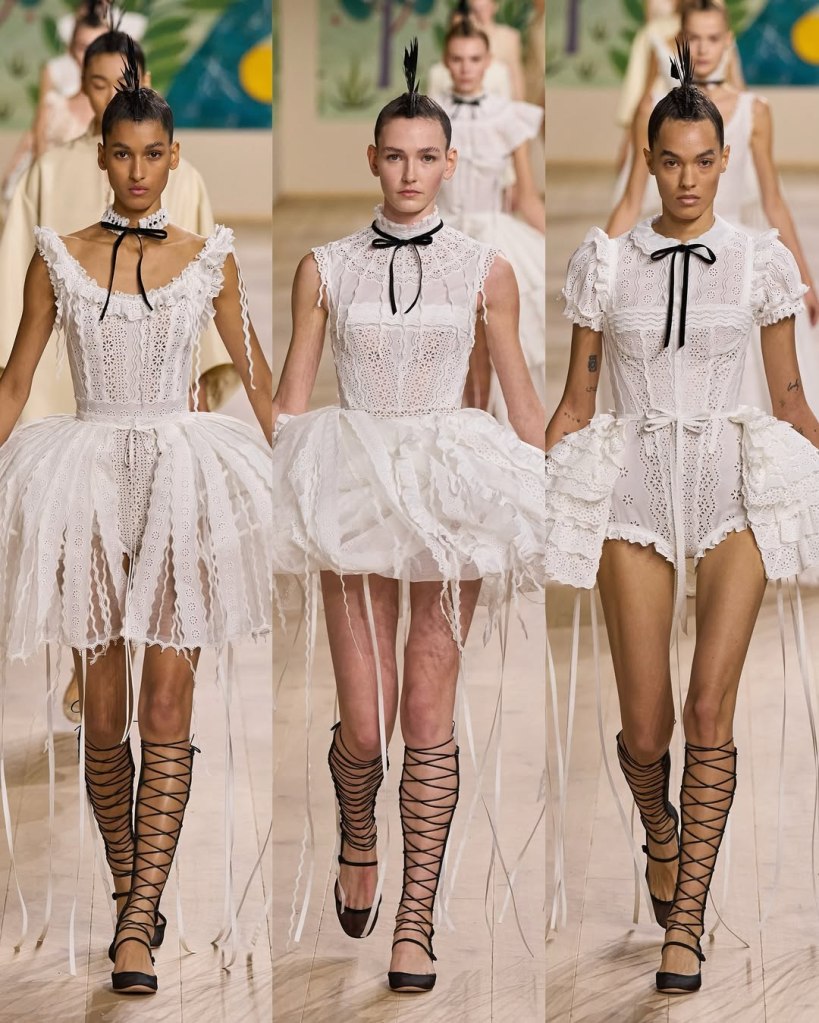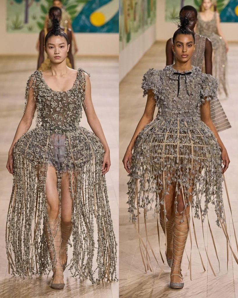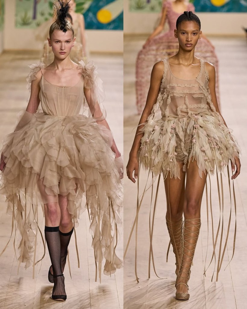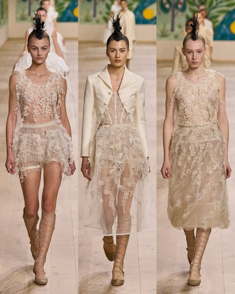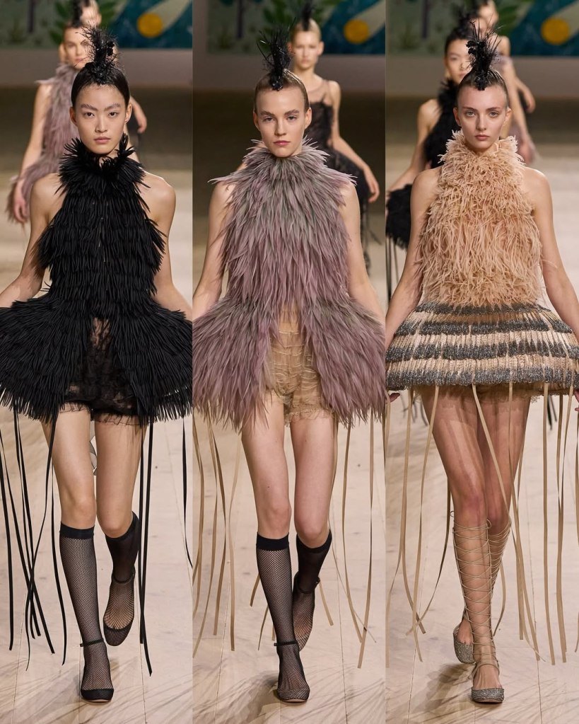 Textures played a starring role, with tulles, organza, and raffia adding depth and movement to the pieces. Floral embroidery, sequins, and ribbon accents elevated the collection, imbuing it with a rustic charm. Chiuri’s knack for layering historical references with edgy details was evident in the juxtaposition of feminine silhouettes with punk-inspired styling, such as the mohawk headpieces adorned with feathers.