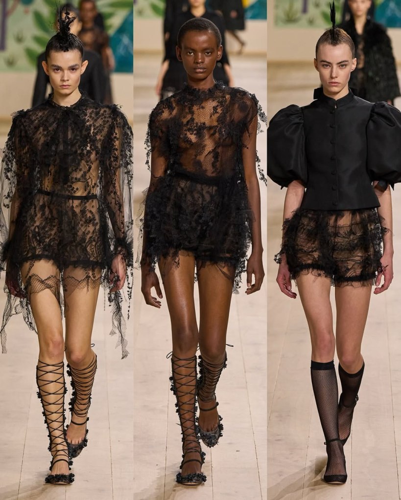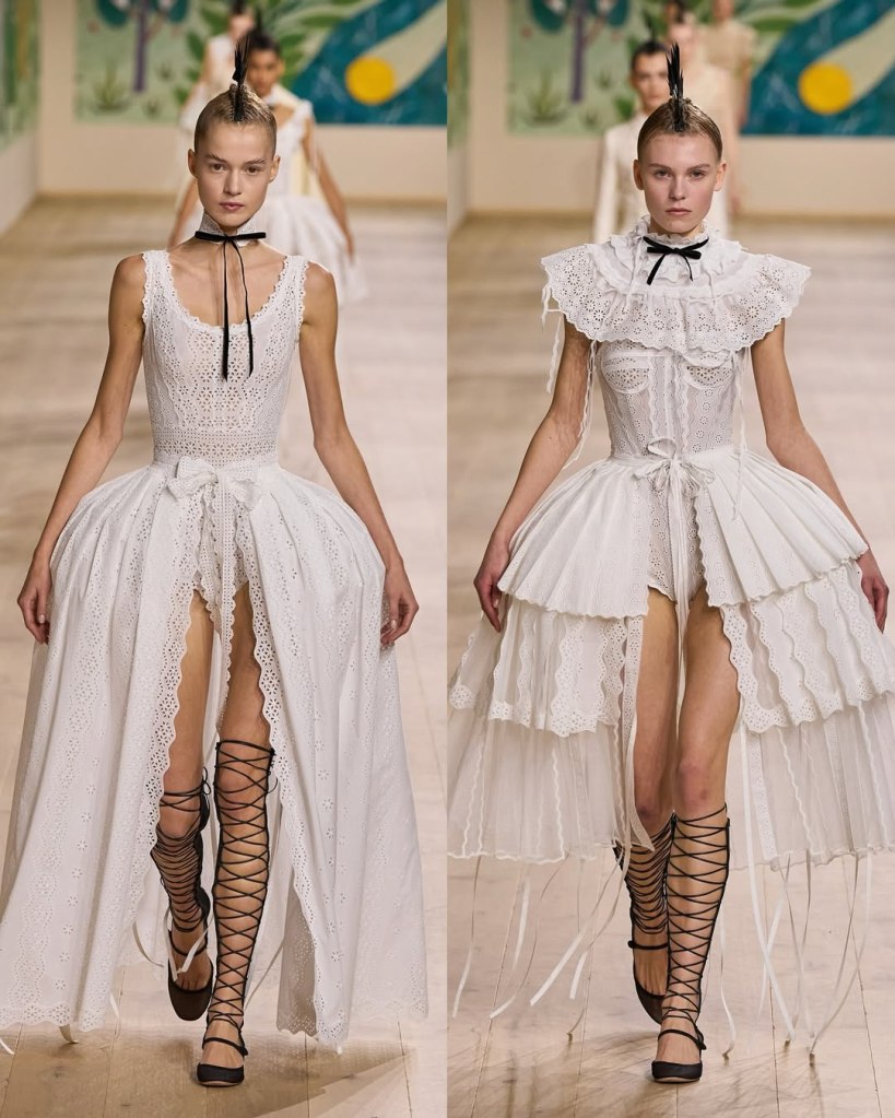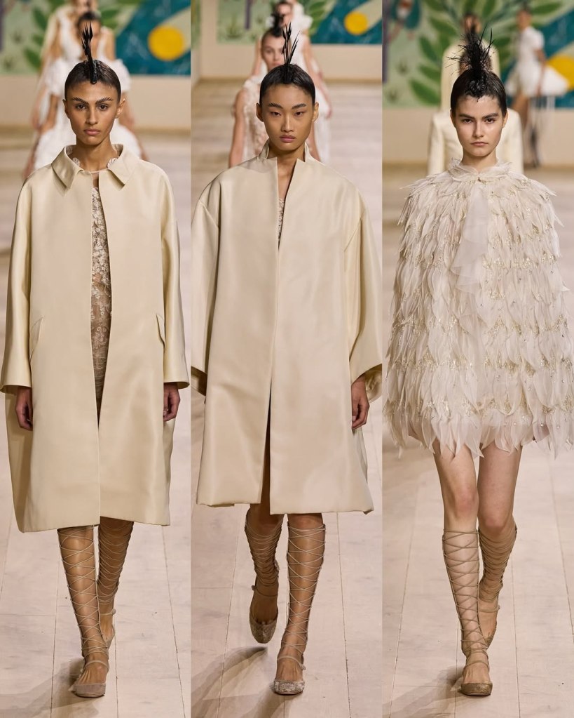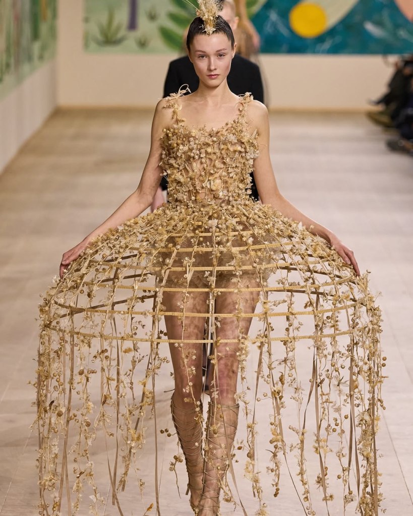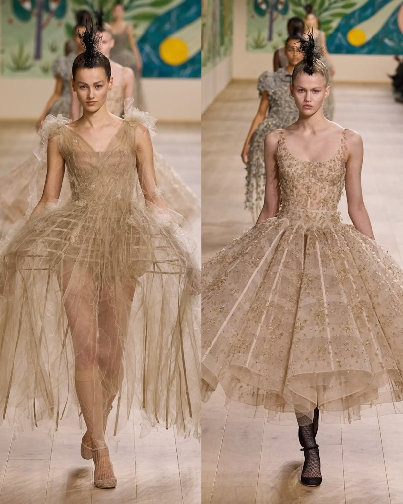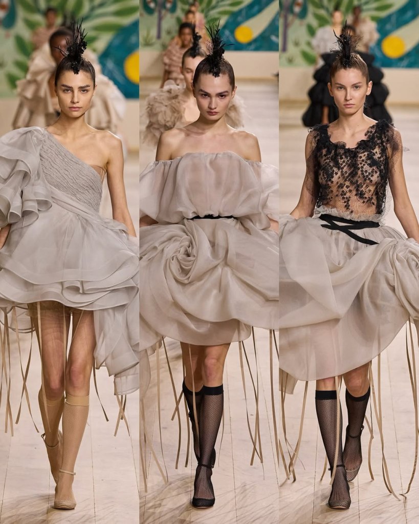 Textures played a starring role, with tulles, organza, and raffia adding depth and movement to the pieces. Floral embroidery, sequins, and ribbon accents elevated the collection, imbuing it with a rustic charm. Chiuri’s knack for layering historical references with edgy details was evident in the juxtaposition of feminine silhouettes with punk-inspired styling, such as the mohawk headpieces adorned with feathers.