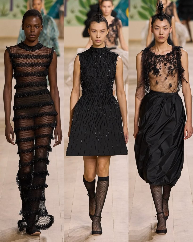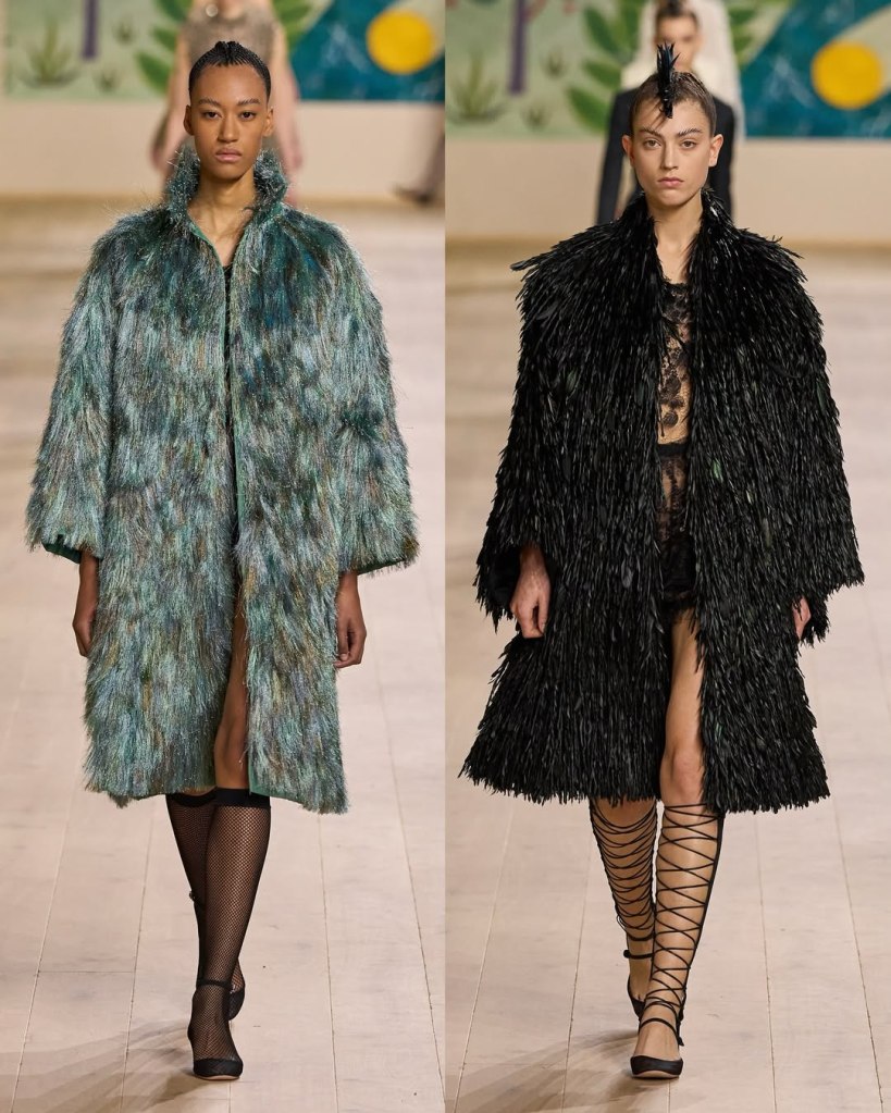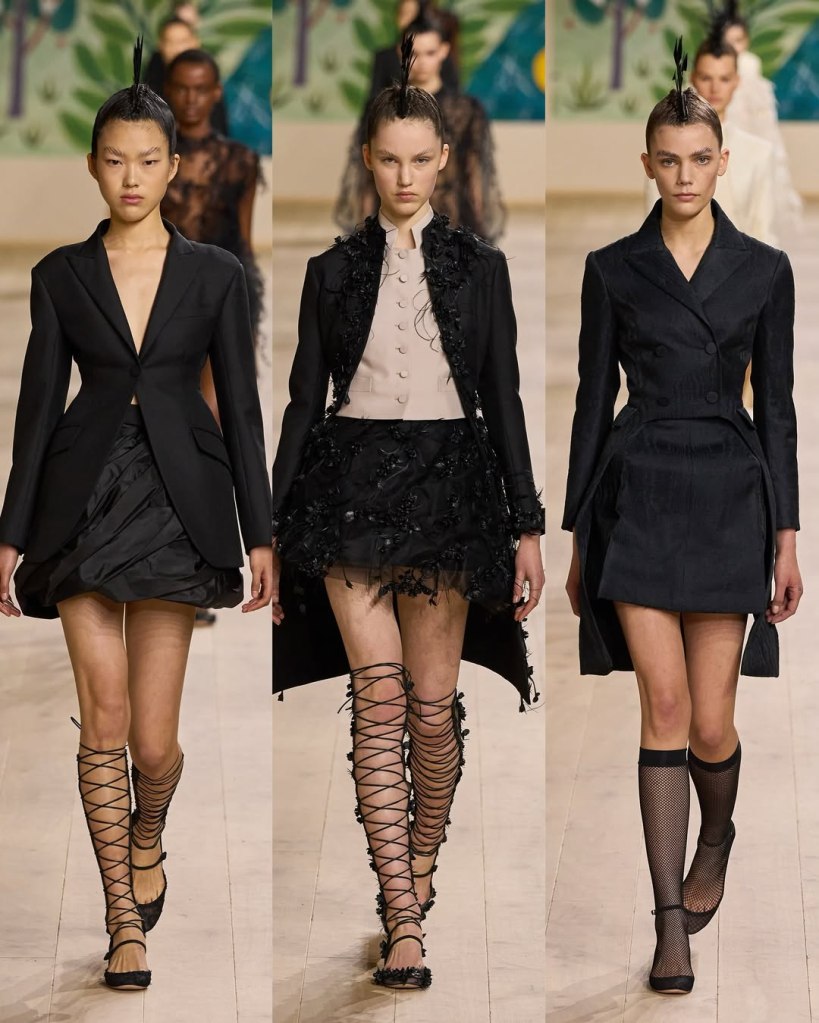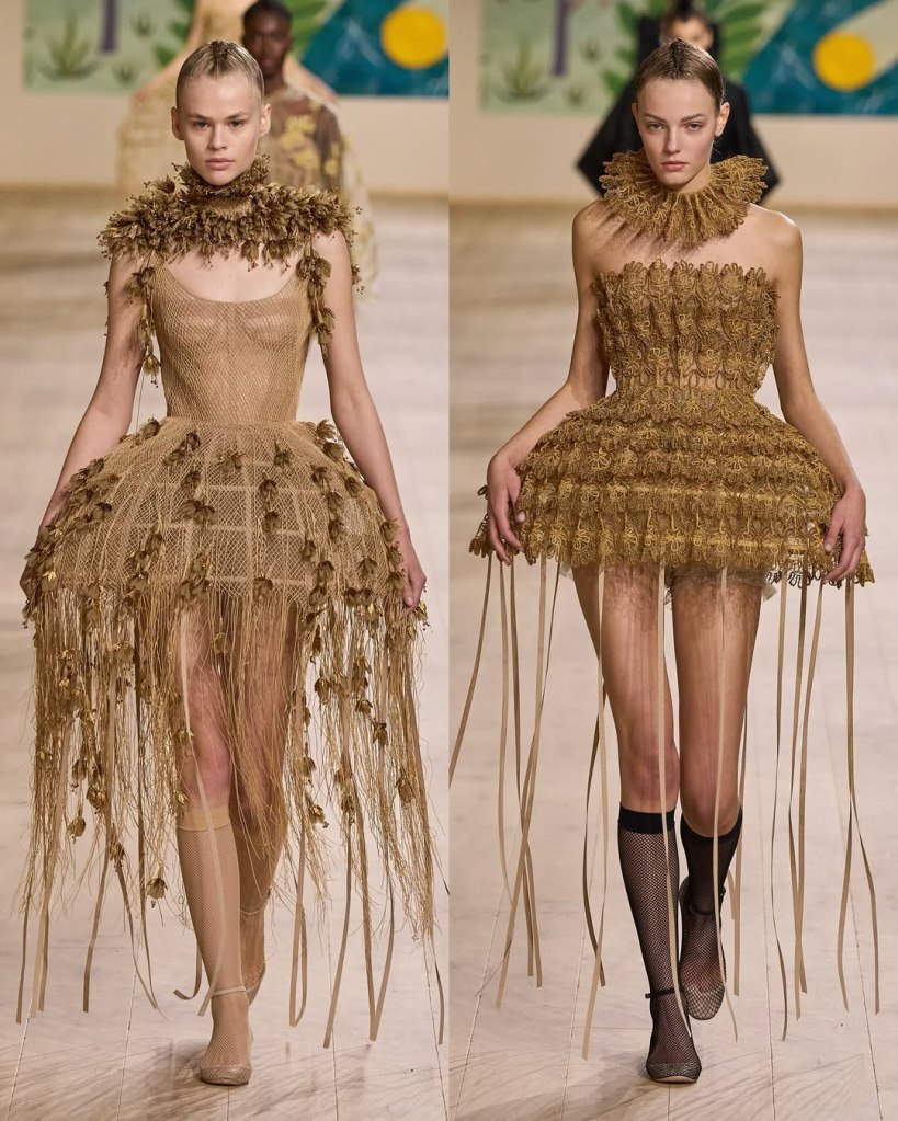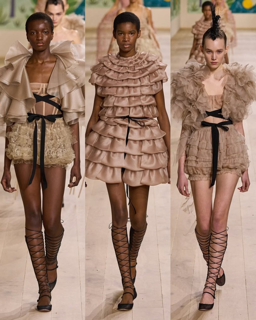 Textures played a starring role, with tulles, organza, and raffia adding depth and movement to the pieces. Floral embroidery, sequins, and ribbon accents elevated the collection, imbuing it with a rustic charm. Chiuri’s knack for layering historical references with edgy details was evident in the juxtaposition of feminine silhouettes with punk-inspired styling, such as the mohawk headpieces adorned with feathers.