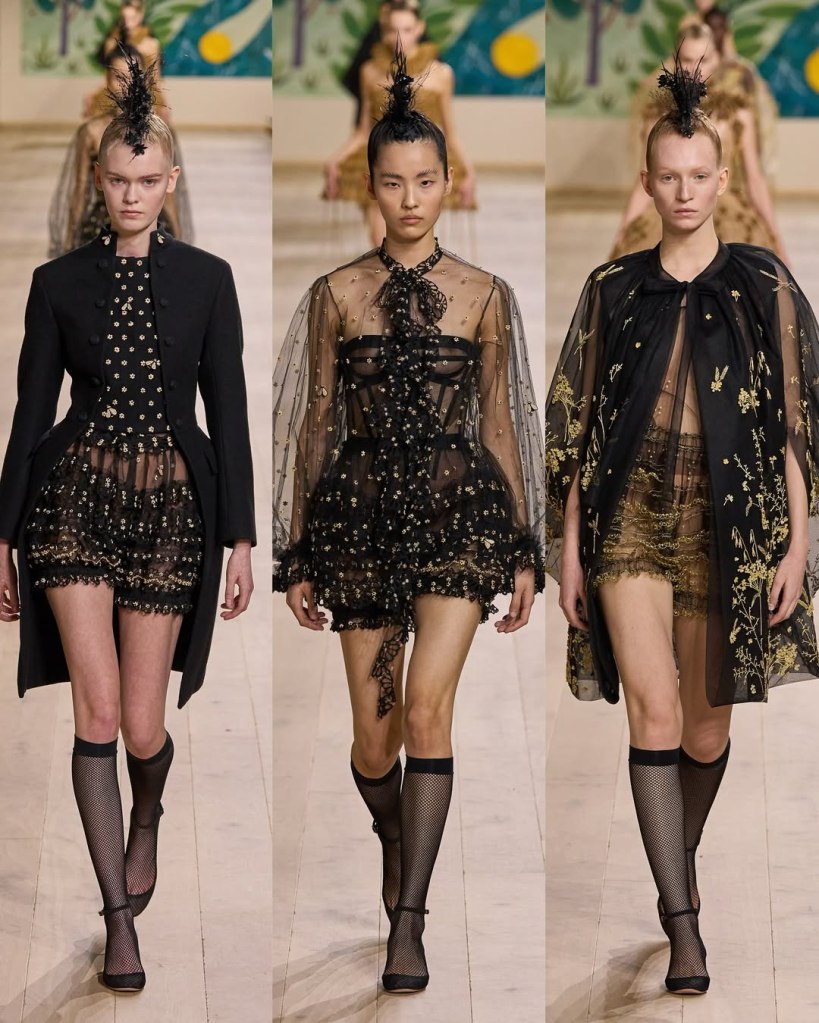 The garments paid homage to Dior’s rich history while embracing a playful, contemporary twist. Chiuri reimagined iconic silhouettes like the 1952 “La Cigale” and Yves Saint Laurent’s 1958 Trapèze line, morphing them into airy, youthful designs. Short crinolines, trapeze coats, and skirts trimmed with delicate lace were paired with sheer bodices, visible bustiers, and bloomers, creating a mix of structure and lightness.