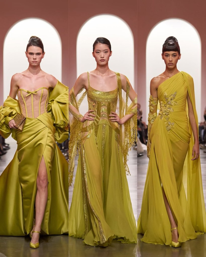 The gowns featured midcentury-style fitted bodices paired with delicate balloon skirts, cinched at the waist with black velvet bows. A standout piece was a creamy silk sheath with an exaggerated Bardot neckline, oozing sophistication. Another took the sweetheart neckline to new heights, draping buttery silk in a way that felt both regal and effortless. It was refreshing to see Murad explore fuller, more flowing shapes while maintaining his signature luxurious touch. The collection’s color palette was inspired by tropical islands, with shades of kiwi green, pineapple yellow, and bright pinks. Embroidered palm leaves, hibiscus flowers, and vines added beautiful detail, while beads, sequins, and pearls made sure everything shimmered under the lights. That said, the shimmer was a bit much at times, making some looks feel overdone rather than refined. Some looks veered towards the tacky, with loud embellishments and shapes that didn’t quite land. The fabrics also felt a little under-refined in places, missing that effortless lux touch.