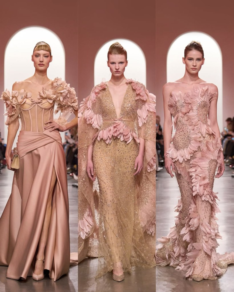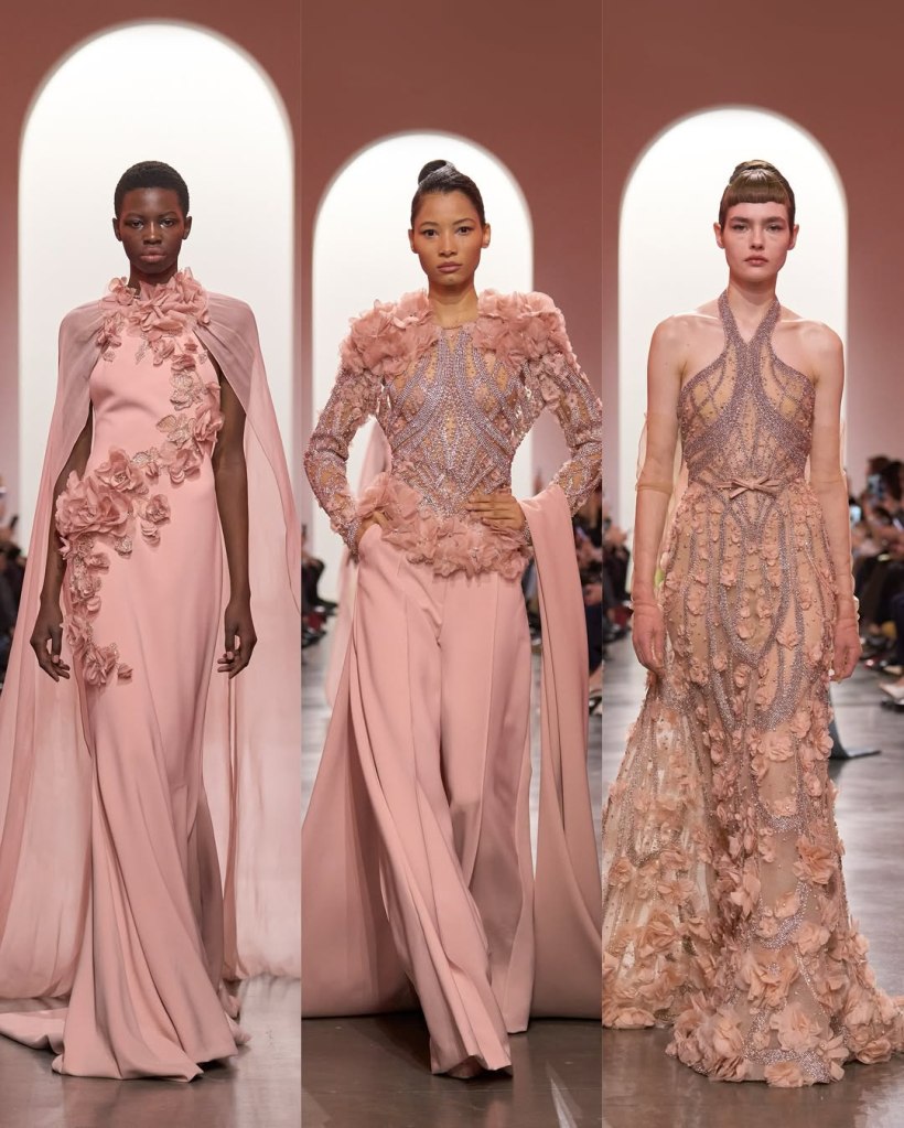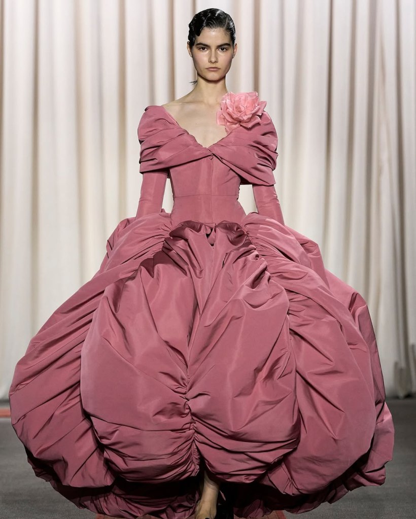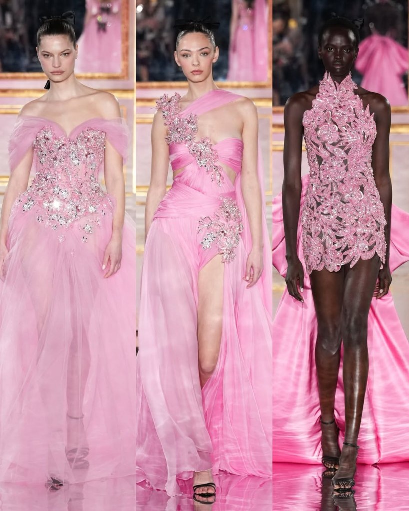 There was a parade of sculptural silhouettes, from massive ruched skirts to sleek, draped gowns. There was a sense of movement in every piece, with fabrics billowing as if caught in a breeze. Candy pink, deep scarlet, and soft ombré hues dominated the palette, while intricate embroidery and delicate embellishments added layers of richness. If couture is about dreaming, we saw some of the most dreamiest looks.