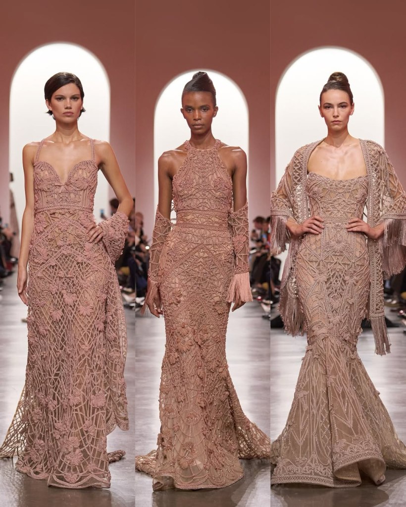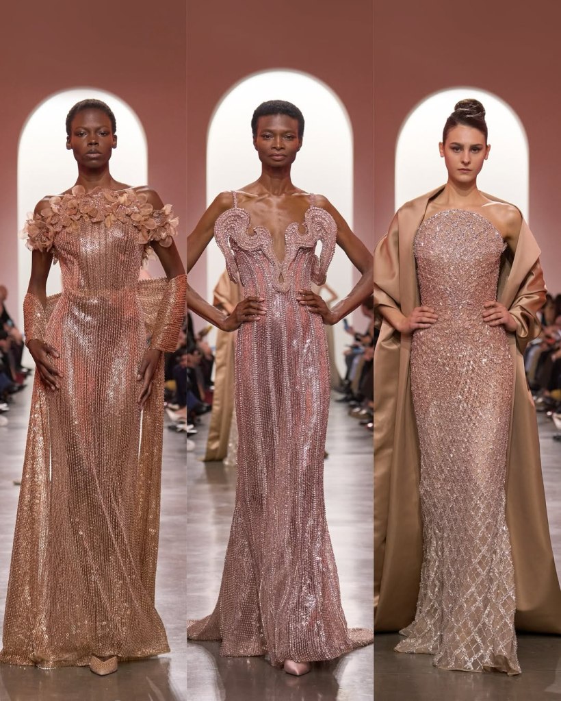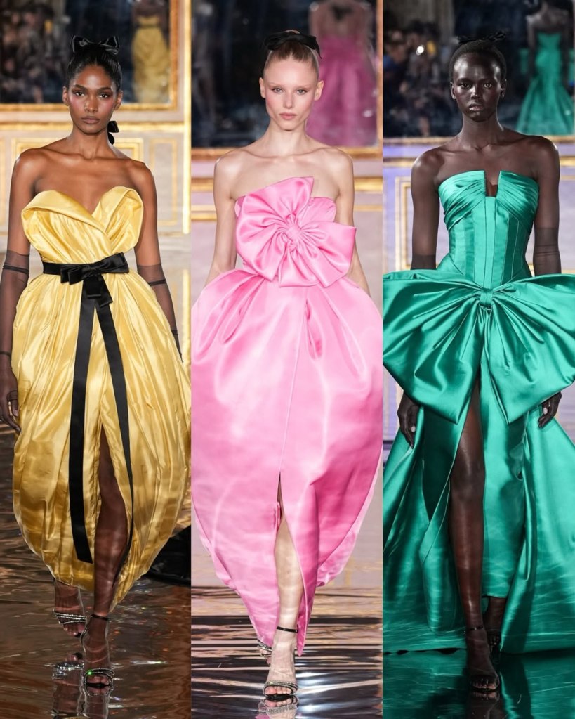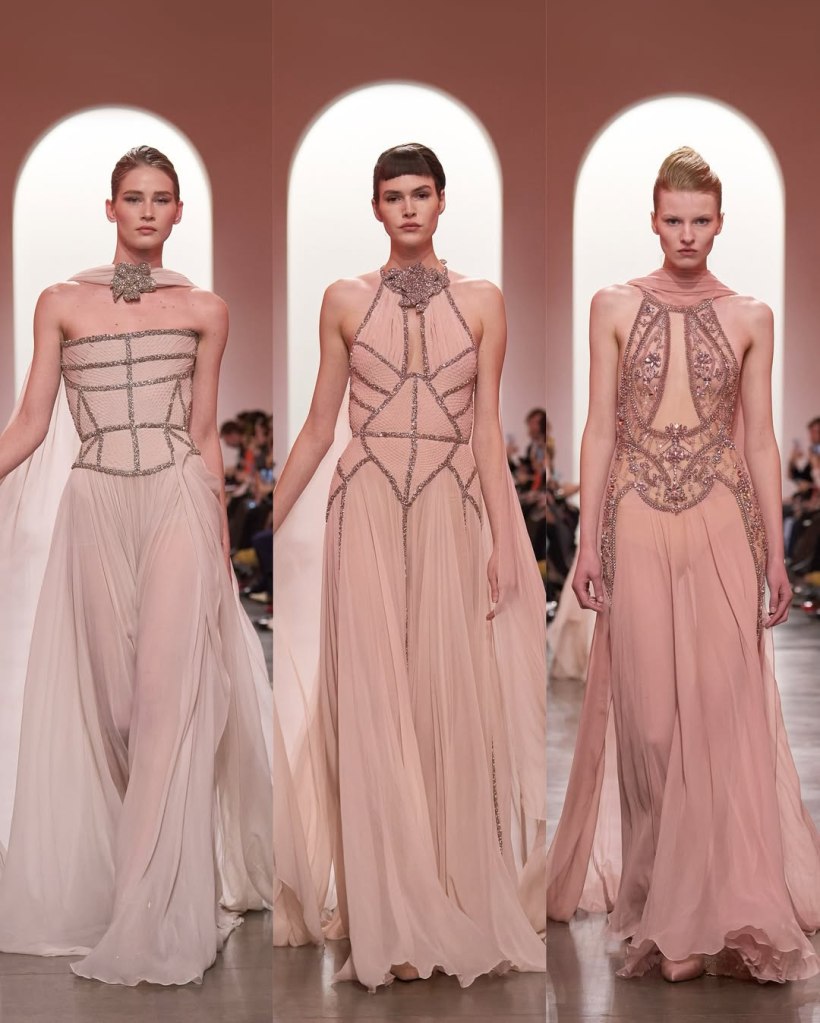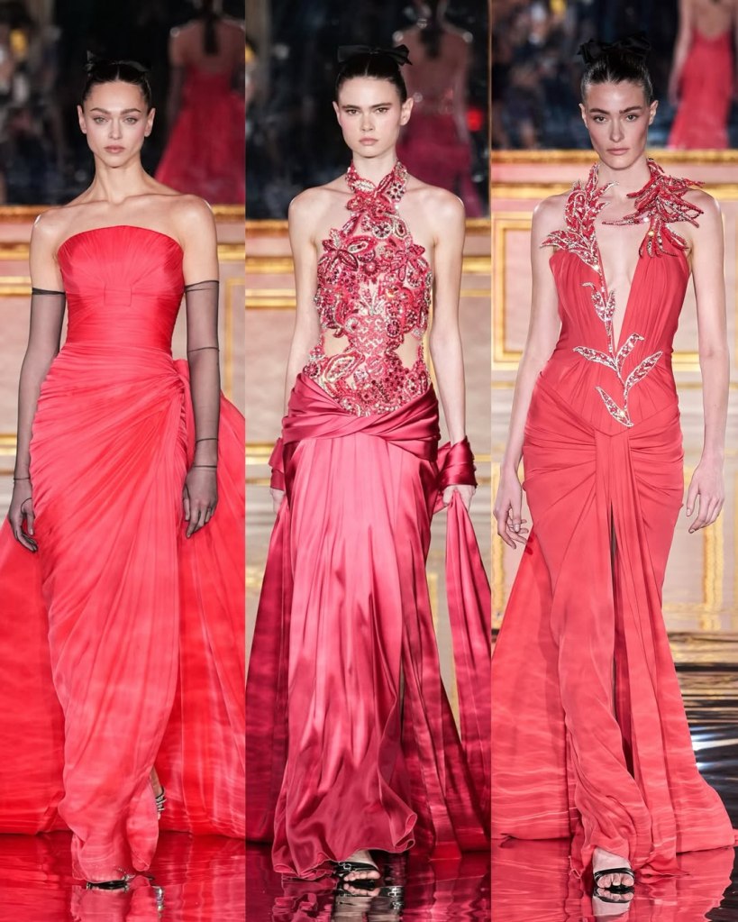 There was a parade of sculptural silhouettes, from massive ruched skirts to sleek, draped gowns. There was a sense of movement in every piece, with fabrics billowing as if caught in a breeze. Candy pink, deep scarlet, and soft ombré hues dominated the palette, while intricate embroidery and delicate embellishments added layers of richness. If couture is about dreaming, we saw some of the most dreamiest looks.