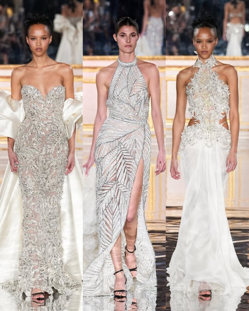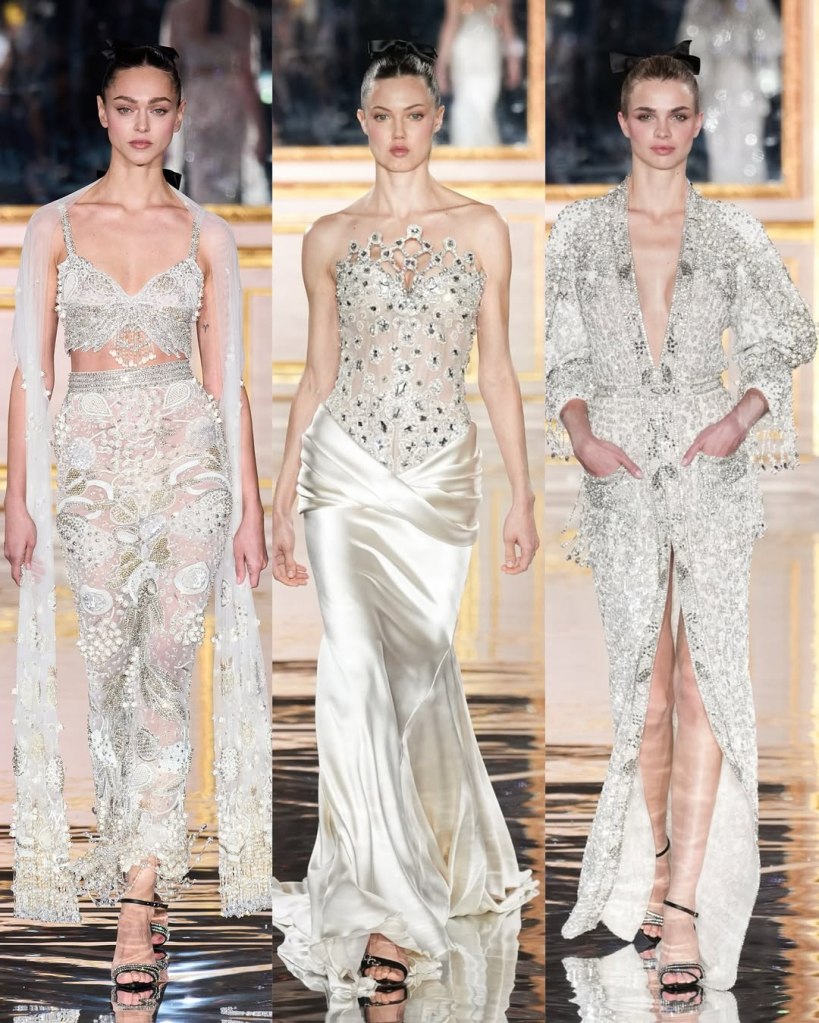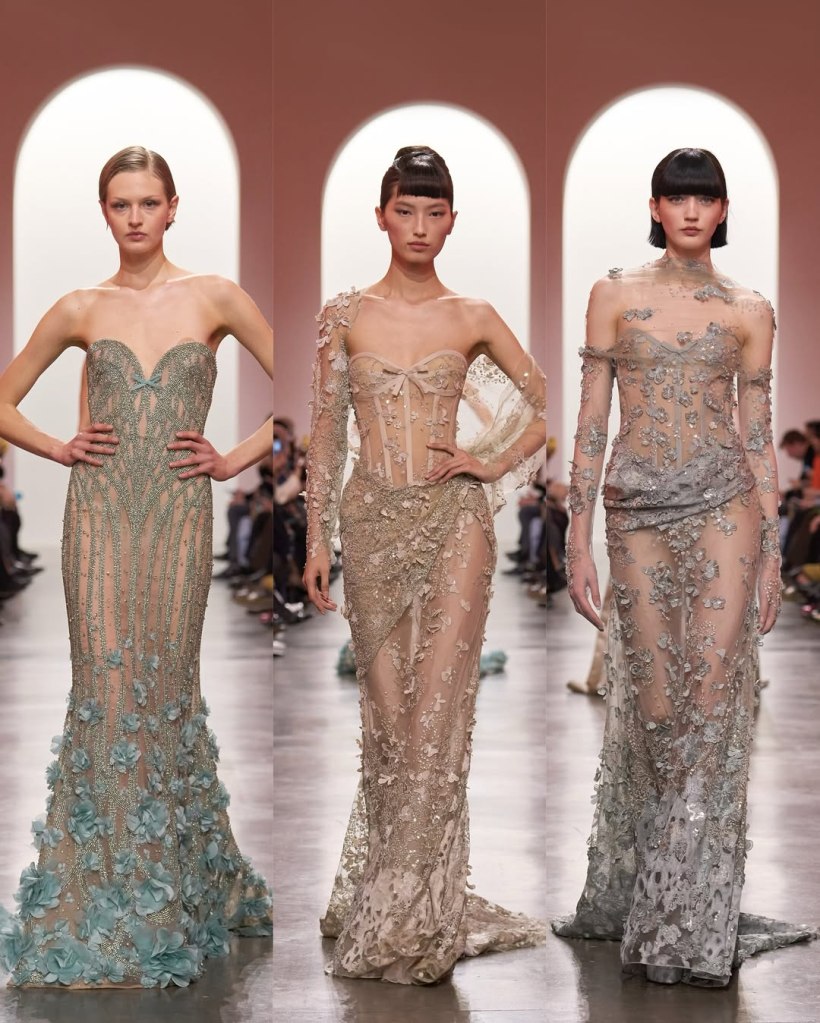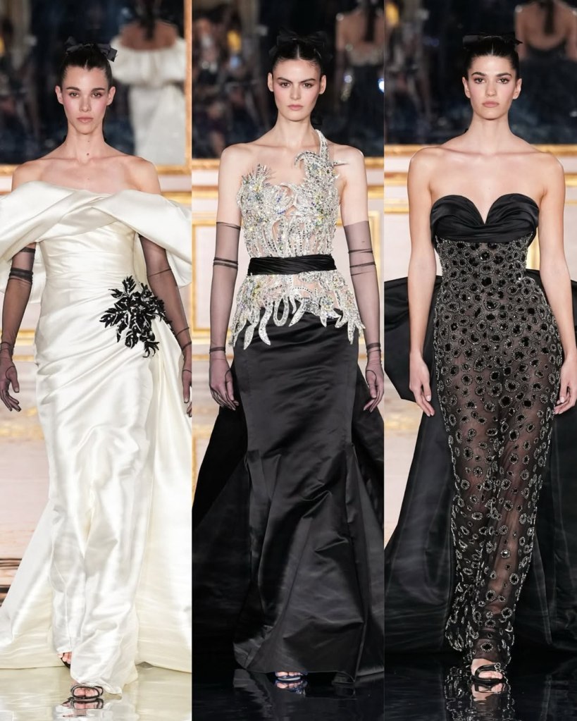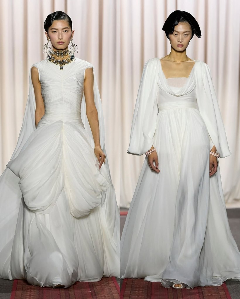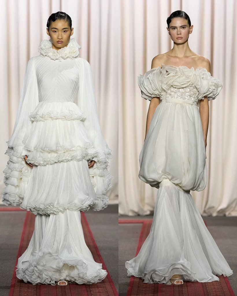 Zuhair Murad: This season, Zuhair Murad took a step back from his signature body-hugging silhouettes and instead embraced softer, more classic shapes. Think Audrey Hepburn in “Breakfast at Tiffany’s”—elegant, refined, and timeless.
