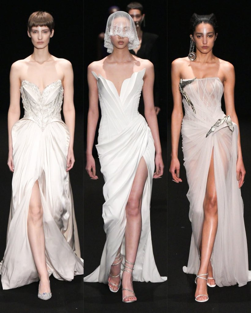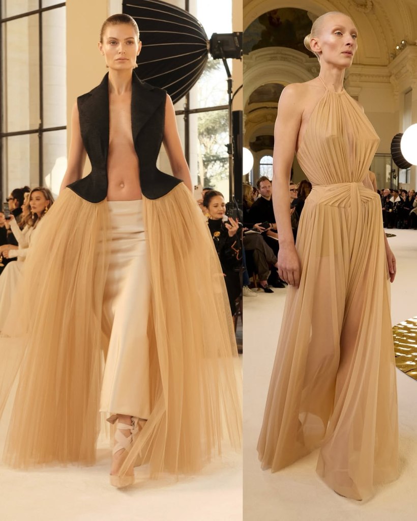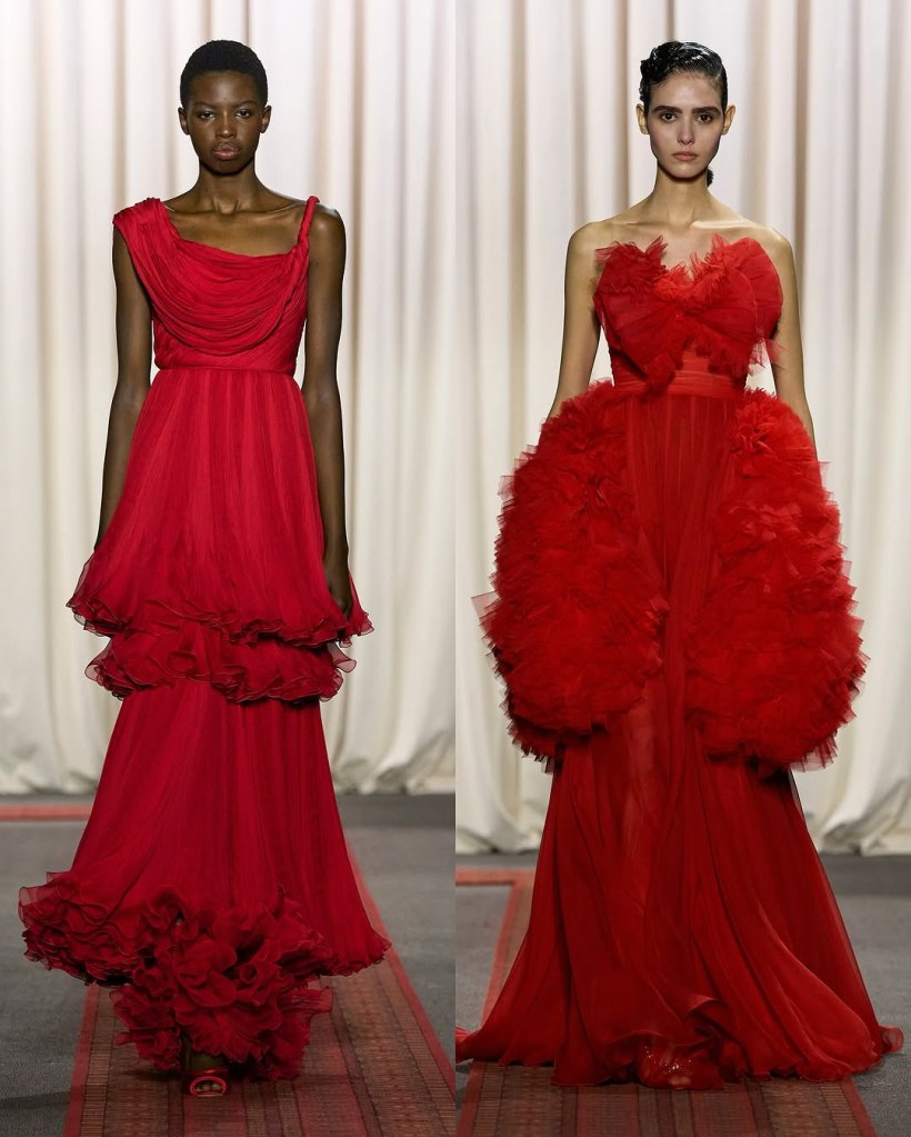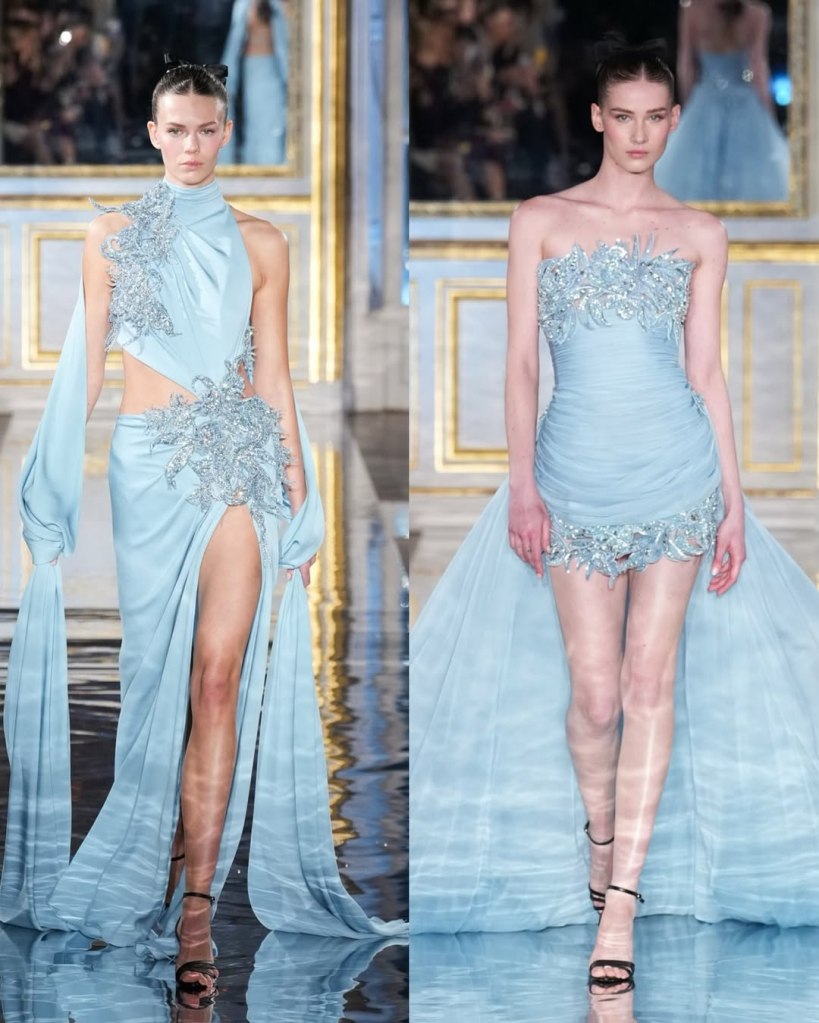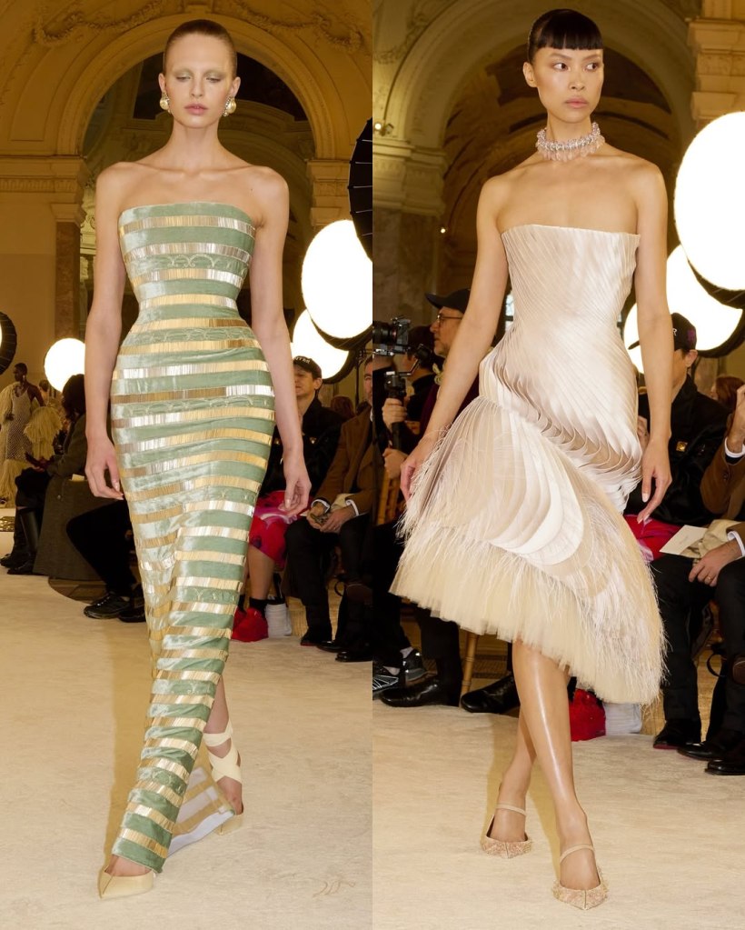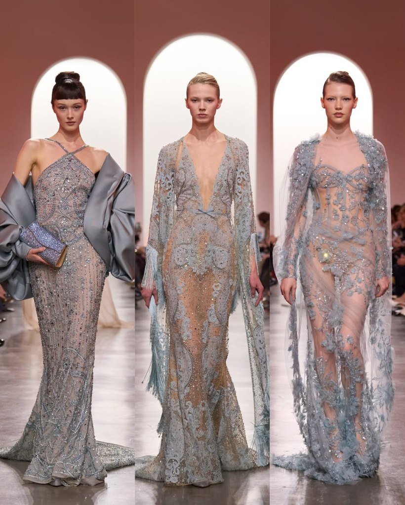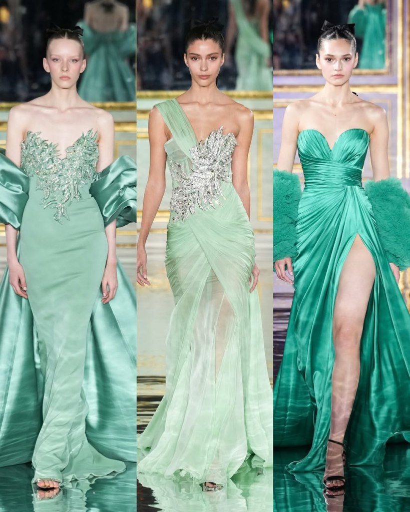 Zuhair Murad: This season, Zuhair Murad took a step back from his signature body-hugging silhouettes and instead embraced softer, more classic shapes. Think Audrey Hepburn in “Breakfast at Tiffany’s”—elegant, refined, and timeless.