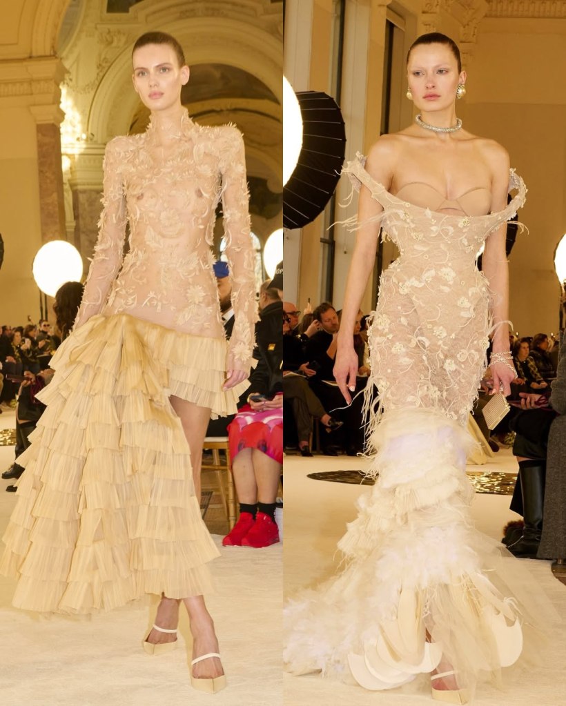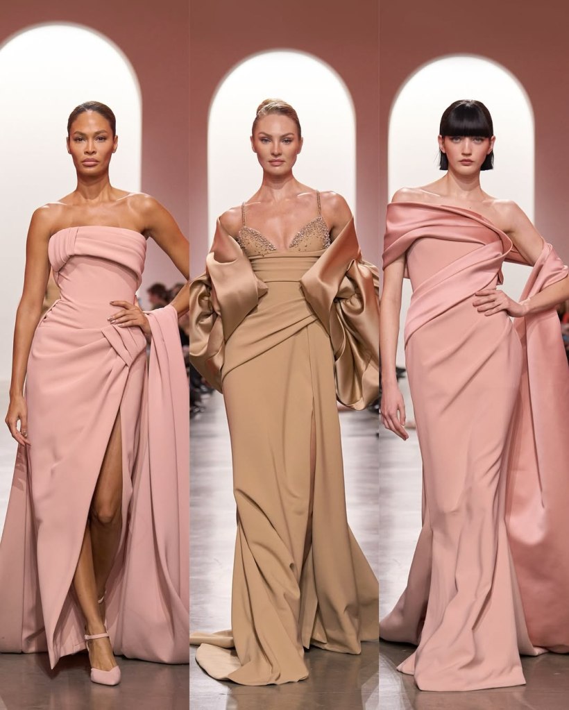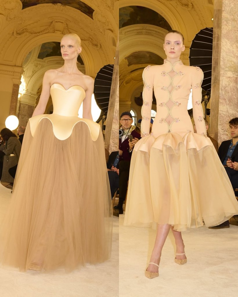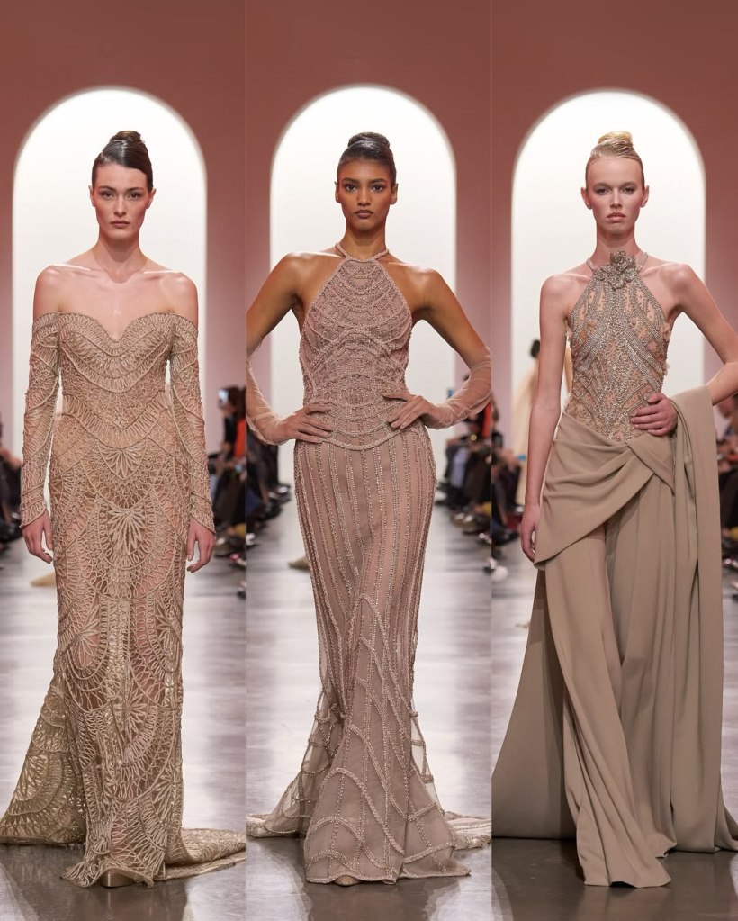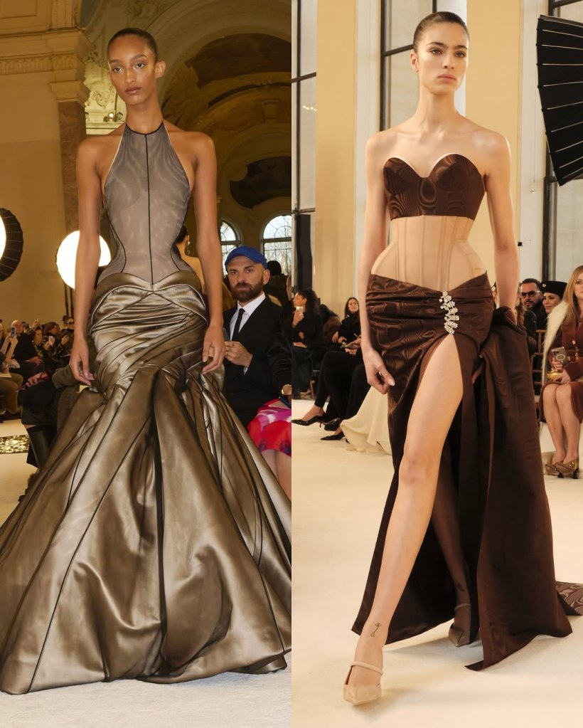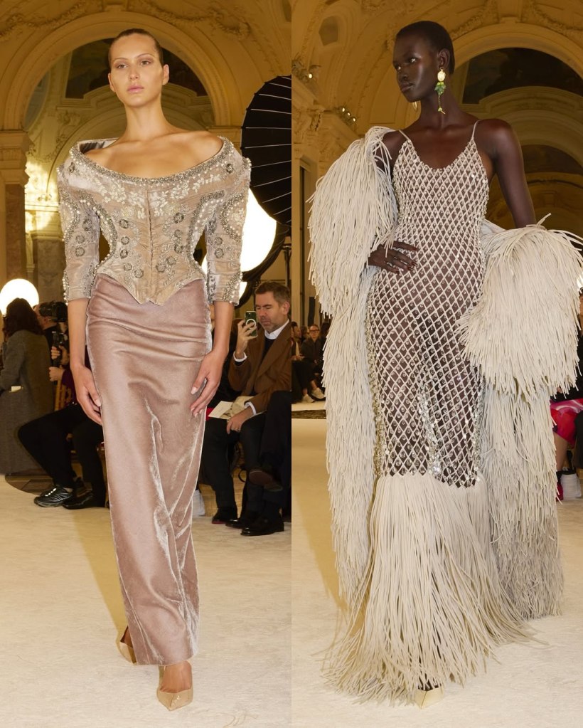 Zuhair Murad: This season, Zuhair Murad took a step back from his signature body-hugging silhouettes and instead embraced softer, more classic shapes. Think Audrey Hepburn in “Breakfast at Tiffany’s”—elegant, refined, and timeless.
