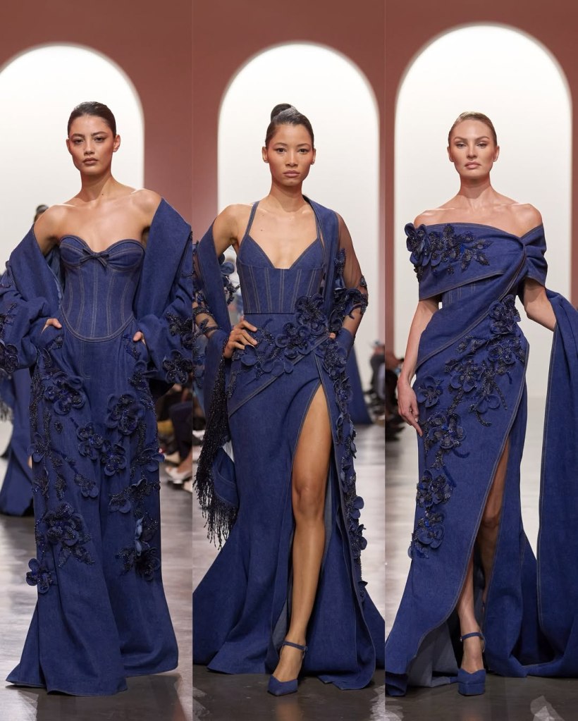 Flowers were everywhere in this collection—on gowns, capes, and delicate lace. Light, flowing fabrics and soft pastel colors gave the dresses an airy and dreamy feel. The biggest surprise? Denim in couture! For the first time, Saab introduced denim gowns. One wrapped around the body like a sari, while another featured a corset and off-the-shoulder neckline. The deep blue denim stood out among the soft, sheer dresses. Saab explained that he wanted to bring a fresh, cool vibe, making it more appealing to a younger audience. The show ended with a breathtaking wedding dress in soft dusty rose. Every look was a must have, Saab is a true pro in classic couture!