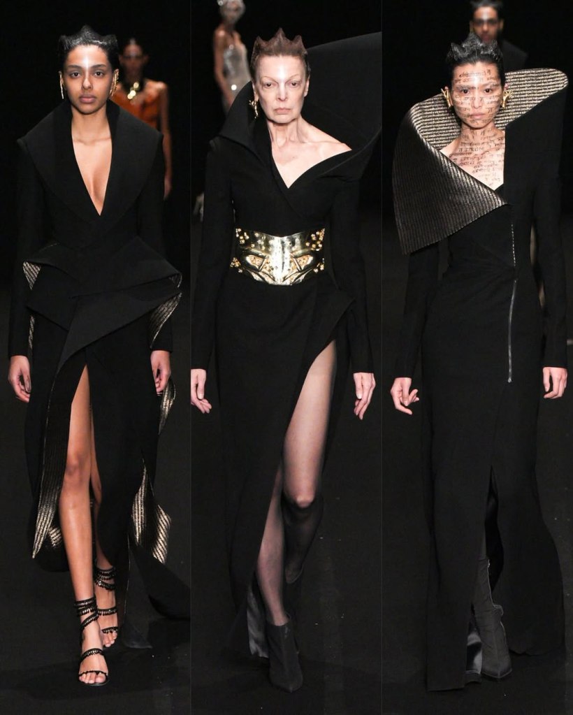 Gupta combined traditional Indian techniques with a modern twist. A fabric woven with Sanskrit chants appeared on clothes and faces, adding a spiritual touch. Through this collection, Gupta turns fashion into a deeply personal and universal expression of strength and renewal.