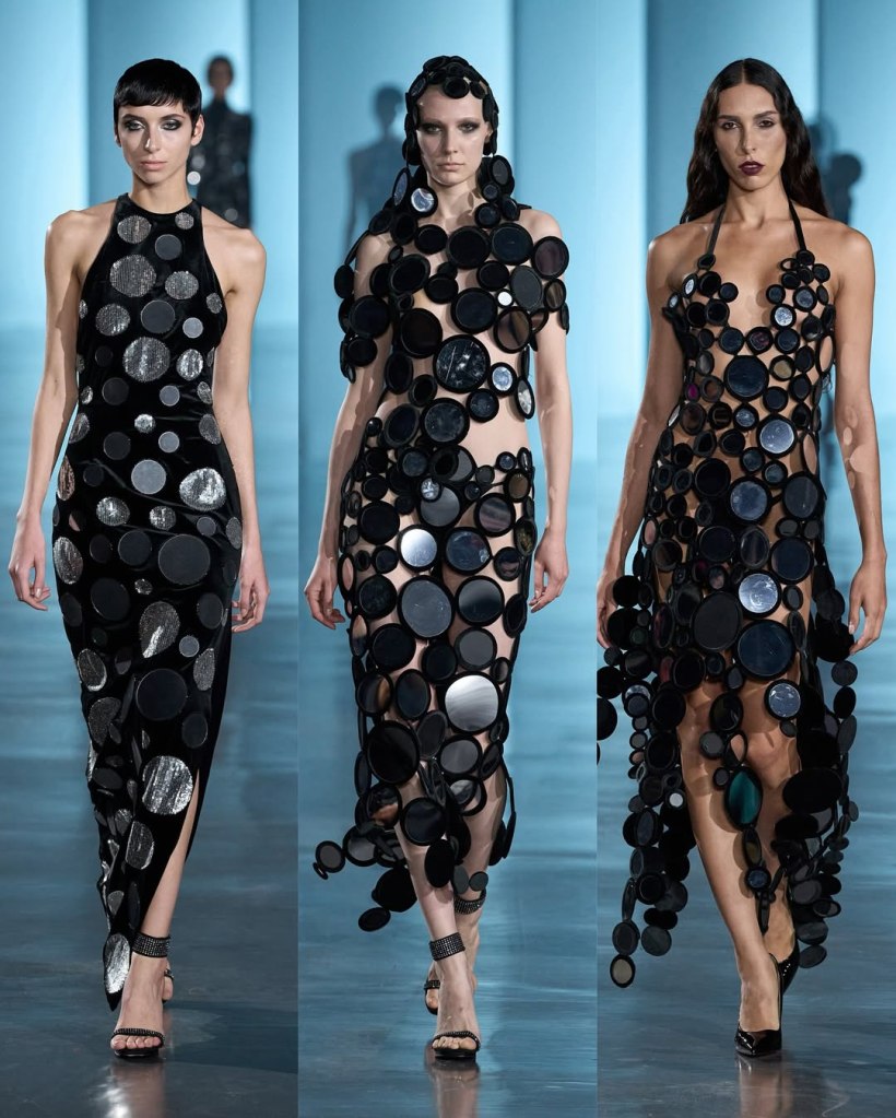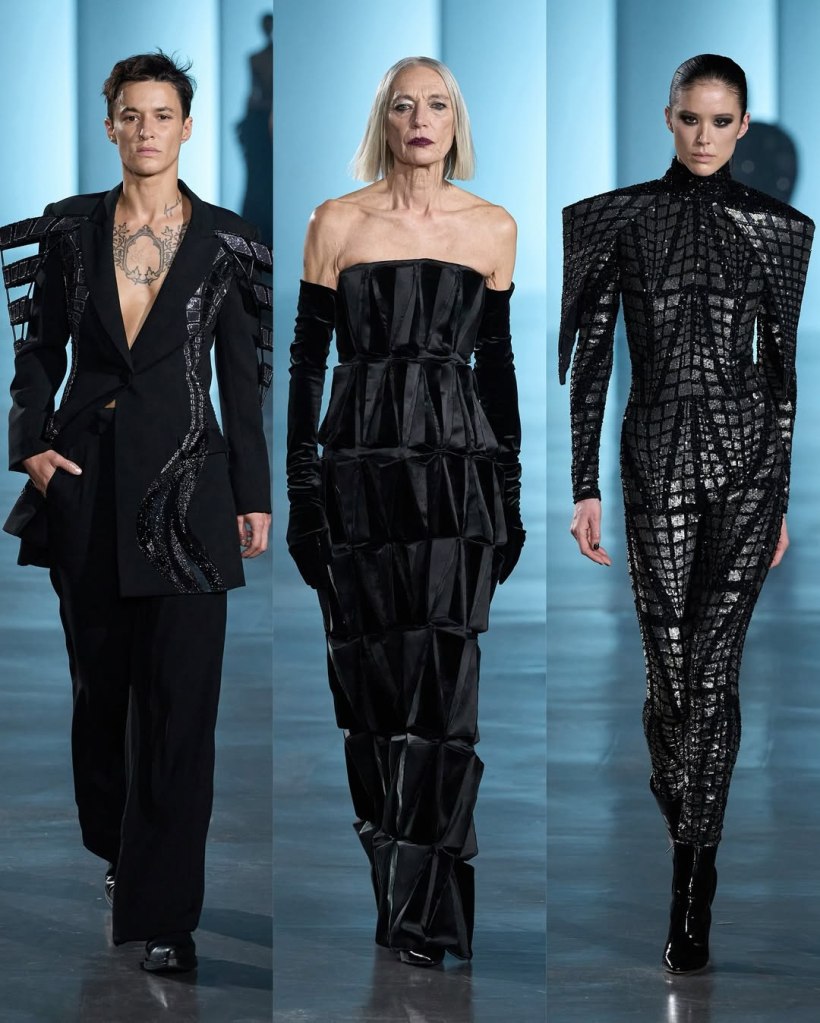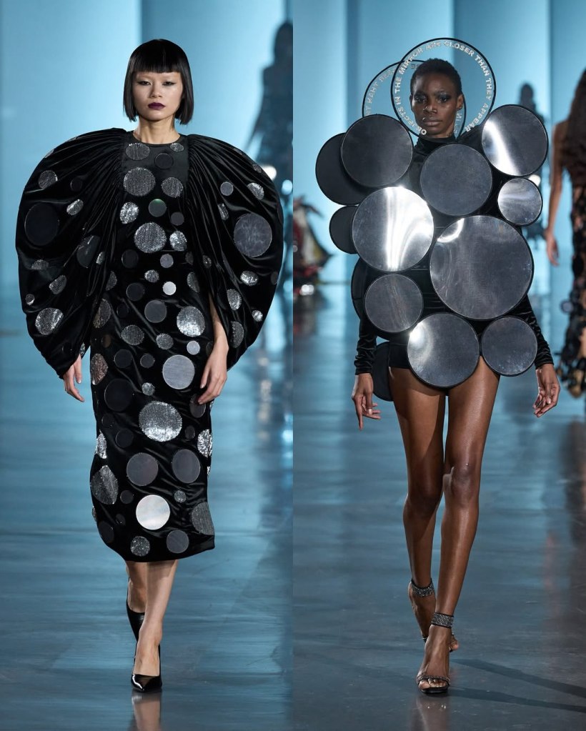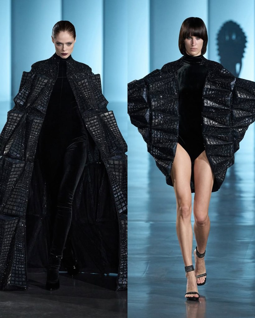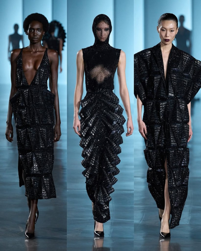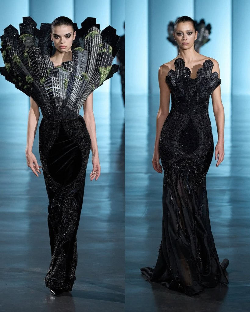 The collection’s story begins in darkness. The show opened with a dramatic black cape covered in shimmering silver cuboids, resembling an urban skyline from above. This architectural motif recurred throughout the collection, appearing on sculptural dresses, sweeping capes, and even as fan-like structures erupting from bodices.