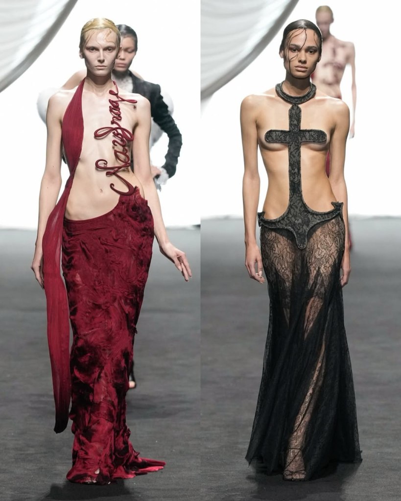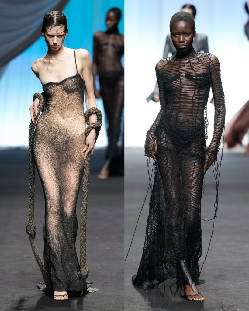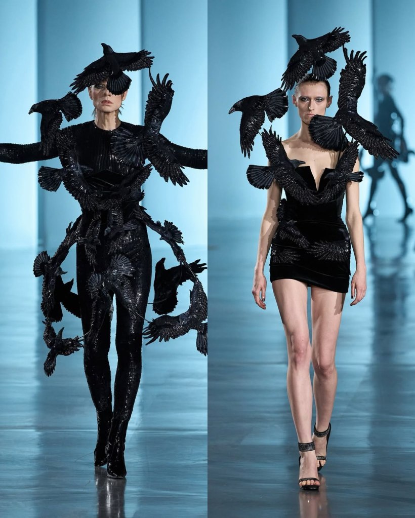 . There was the barely-there anchor dress, where only a delicately sculpted anchor preserved the model’s modesty, and a ghostly white gown reminiscent of a shipwrecked bride lost at sea. Feathers, lace, and sheer paneling abounded, crafting silhouettes that felt both fluid and structured.