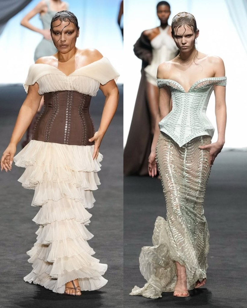 The opening look set the tone: a seafoam-green corset dress, laced up with de Saint Sernin’s signature eyelets, hugging the model’s body like a second skin. The skirt, adorned with sequins resembling fish scales, cascaded down like ocean waves. It was clear from the start that this wasn’t just a shipwreck— it was pure drama.