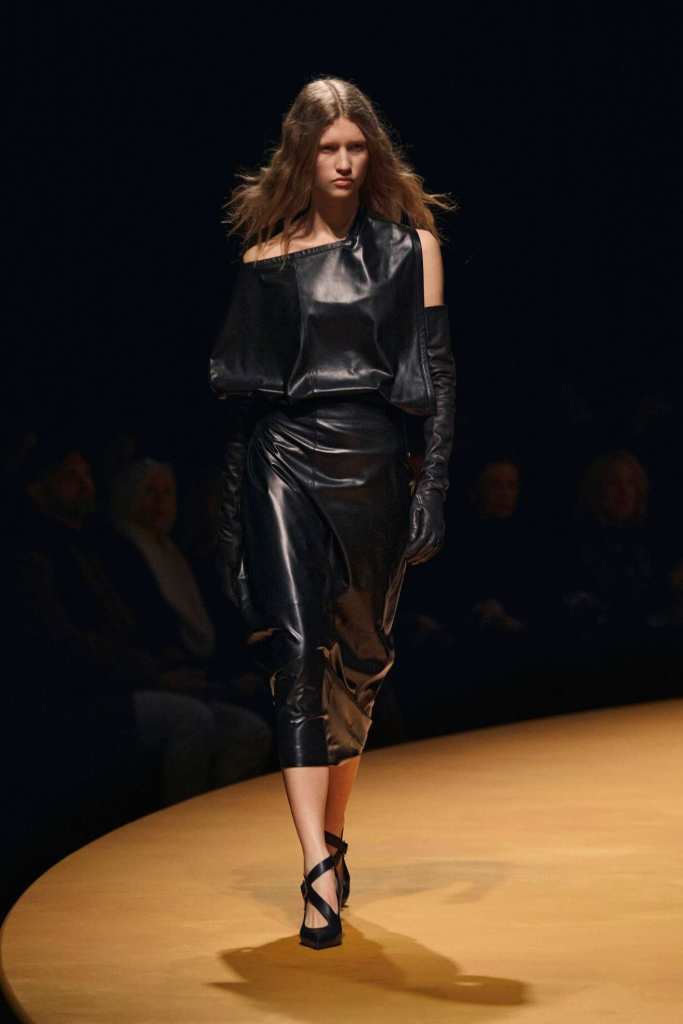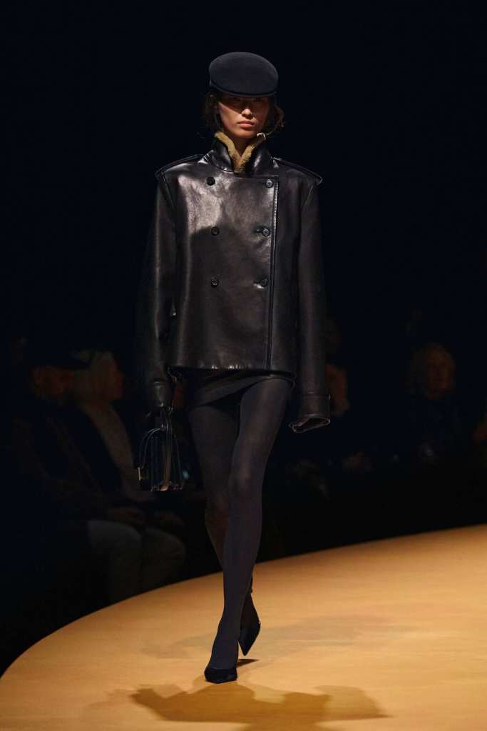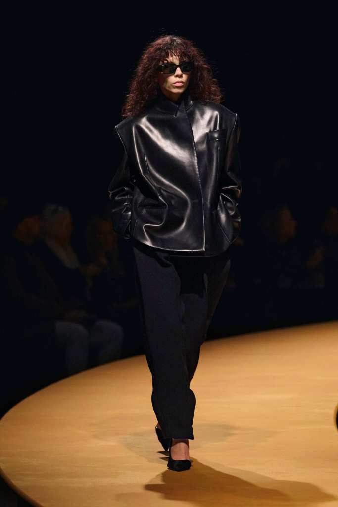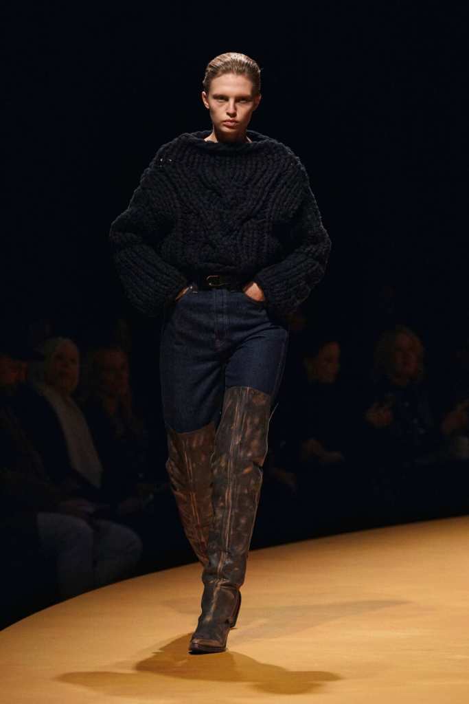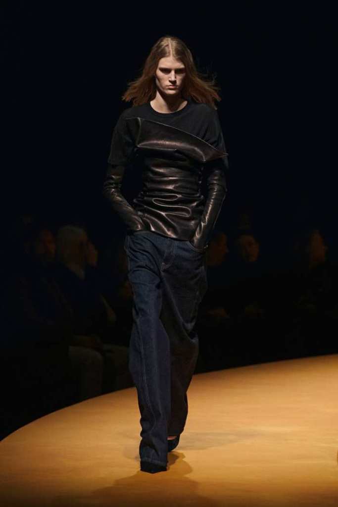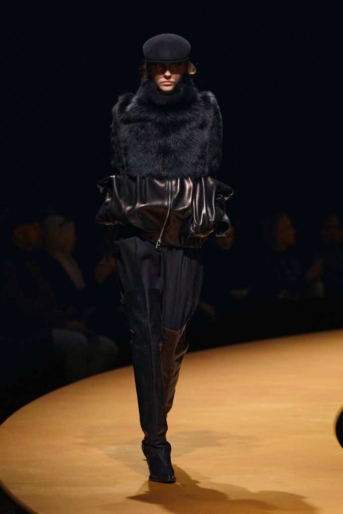 The show took place at the Park Avenue Armory on a circular golden runway, a nod to The Wizard of Oz, Lynch’s favorite film. The setting felt grand, a reflection of Holstein’s ambition and the ever-expanding world of Khaite. The clothes, however, balanced this grandeur with a grounded sense of practicality. Slouchy dark-rinse jeans paired effortlessly with deconstructed corsets, while oversized leather jackets softened with fur trim struck the perfect contrast between edge and romance. Holstein’s accessories remain a major draw. Over-the-knee boots, top-handle bags, and opera gloves added polish to the looks.