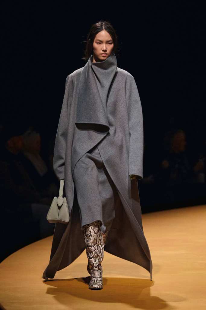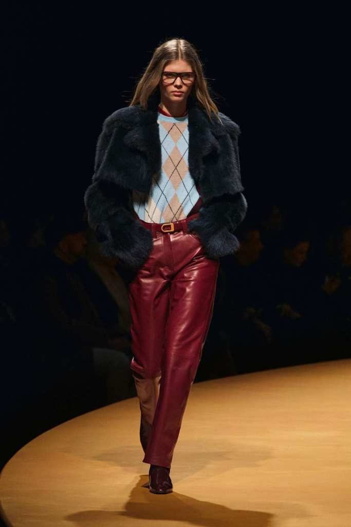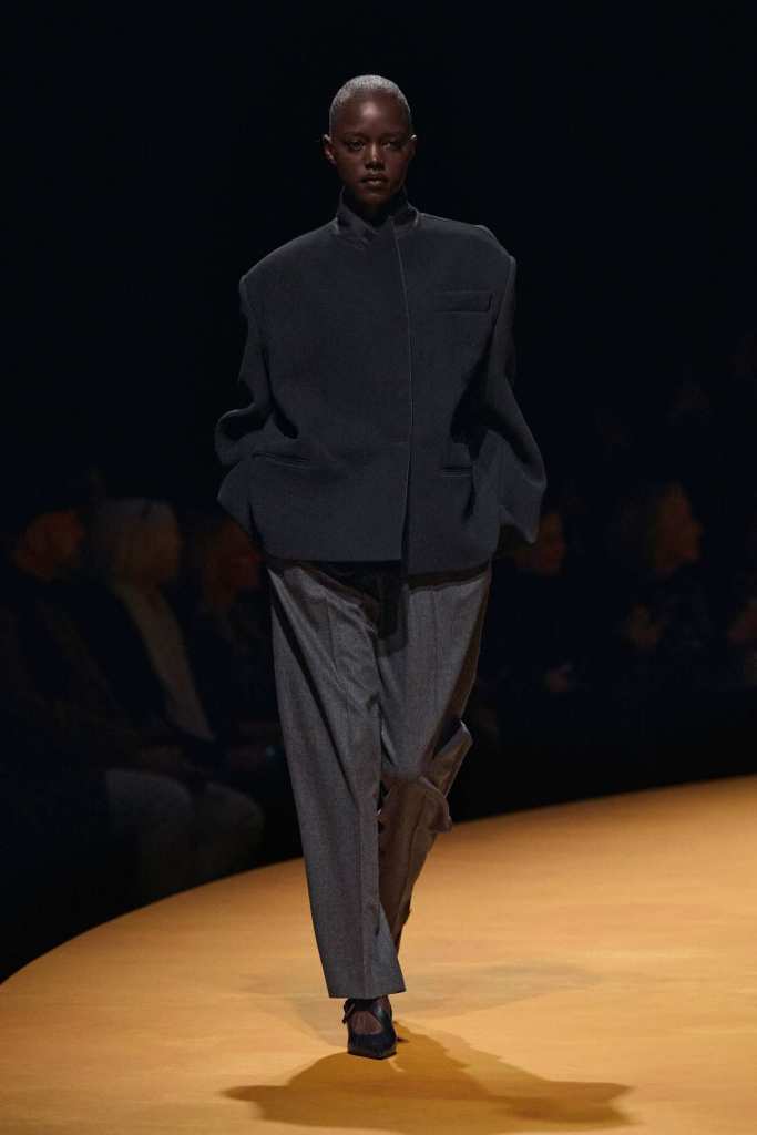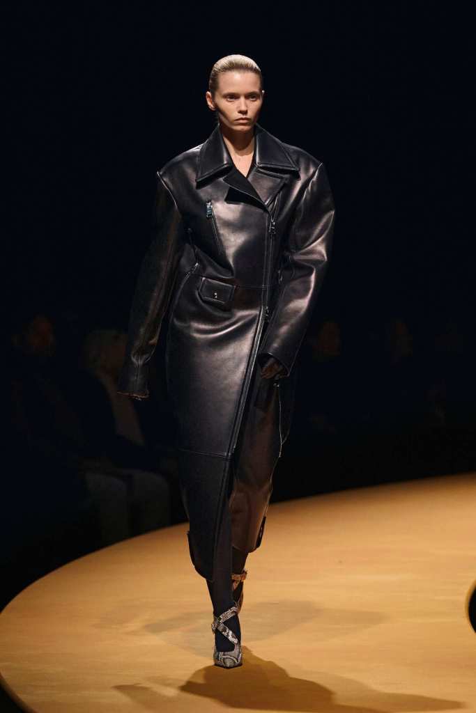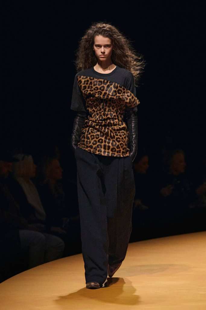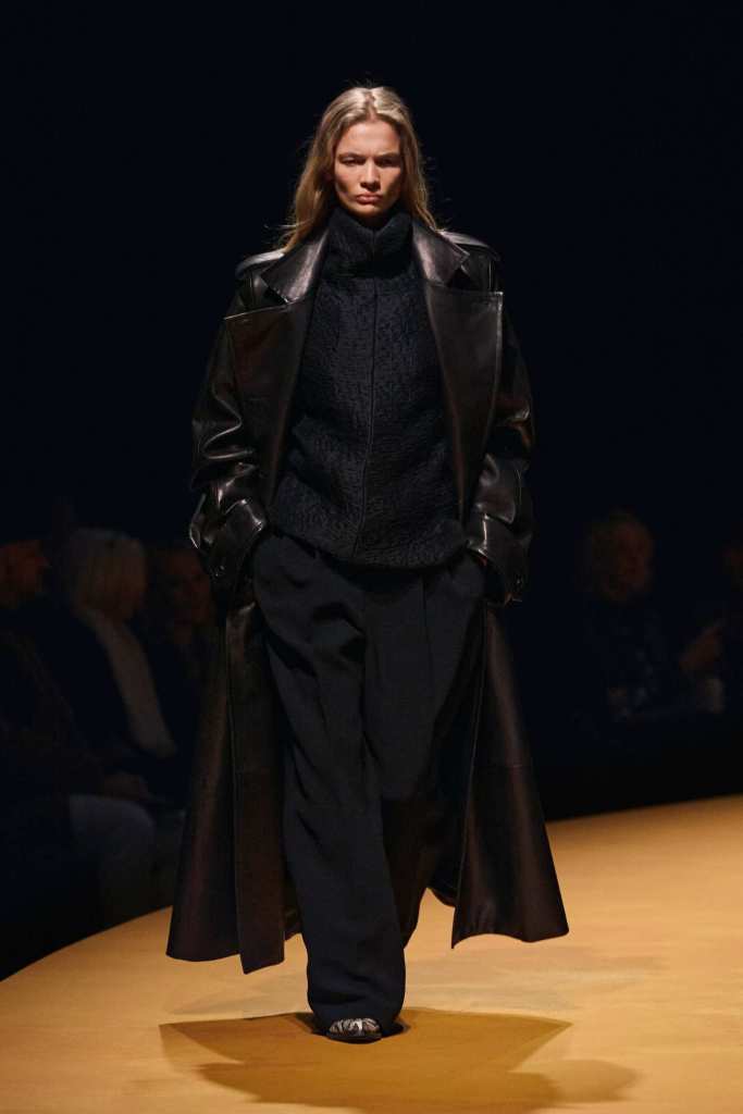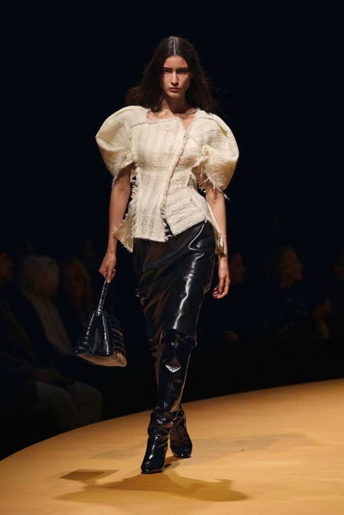 The show took place at the Park Avenue Armory on a circular golden runway, a nod to The Wizard of Oz, Lynch’s favorite film. The setting felt grand, a reflection of Holstein’s ambition and the ever-expanding world of Khaite. The clothes, however, balanced this grandeur with a grounded sense of practicality. Slouchy dark-rinse jeans paired effortlessly with deconstructed corsets, while oversized leather jackets softened with fur trim struck the perfect contrast between edge and romance. Holstein’s accessories remain a major draw. Over-the-knee boots, top-handle bags, and opera gloves added polish to the looks.
