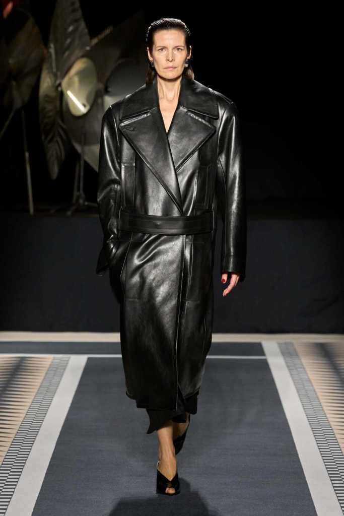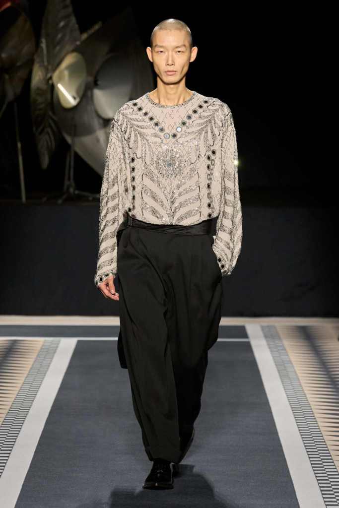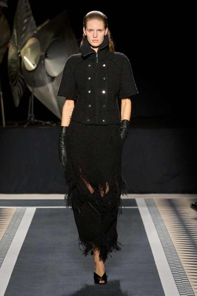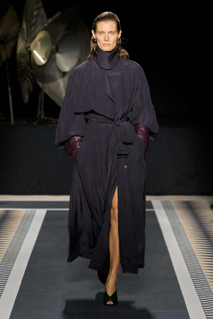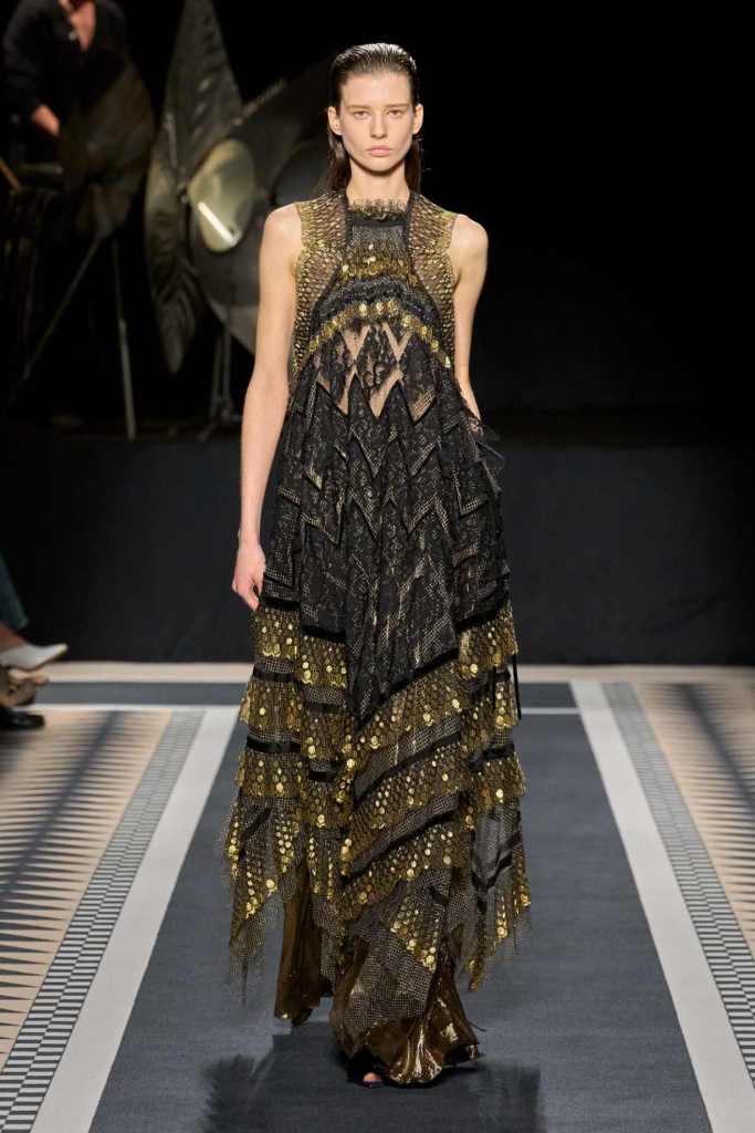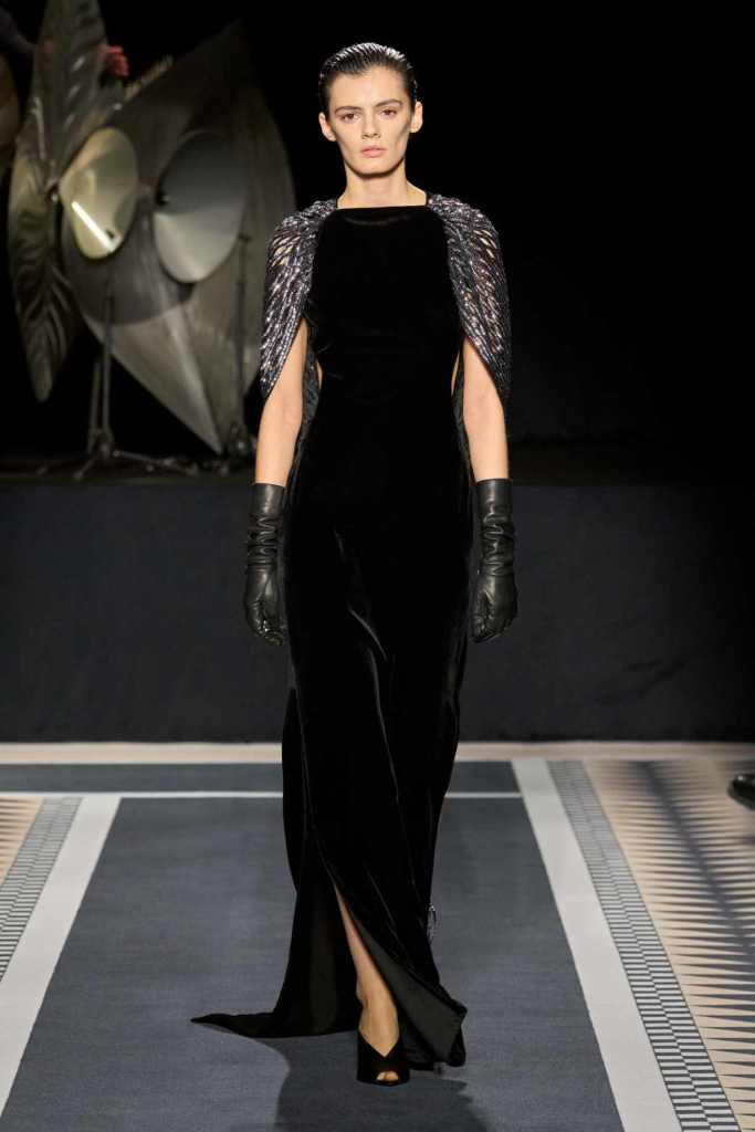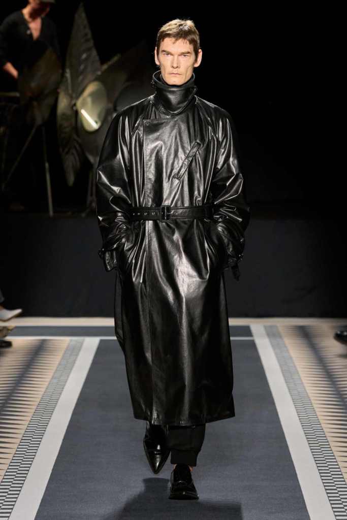 Outerwear played a leading role in the show. Soft, fluid trenches and reworked peacoats elevated the concept of Parisian staples. There was also a black leather overcoat, subtly nodding to 1920s driving coats, which exemplified the house’s cross-generational spirit. Copping’s approach to daywear was understated yet thoughtful—perfectly tailored, but not overpowering. His couture-like spiral-draped ribbon dresses added a touch of drama, while zigzag dévoré velvets and looser printed pieces balanced out the collection. Menswear—new territory for Copping—showed promise – Standout looks included a silver mirror-embroidered long-sleeve t-shirt and a sharp, minimal peacoat.