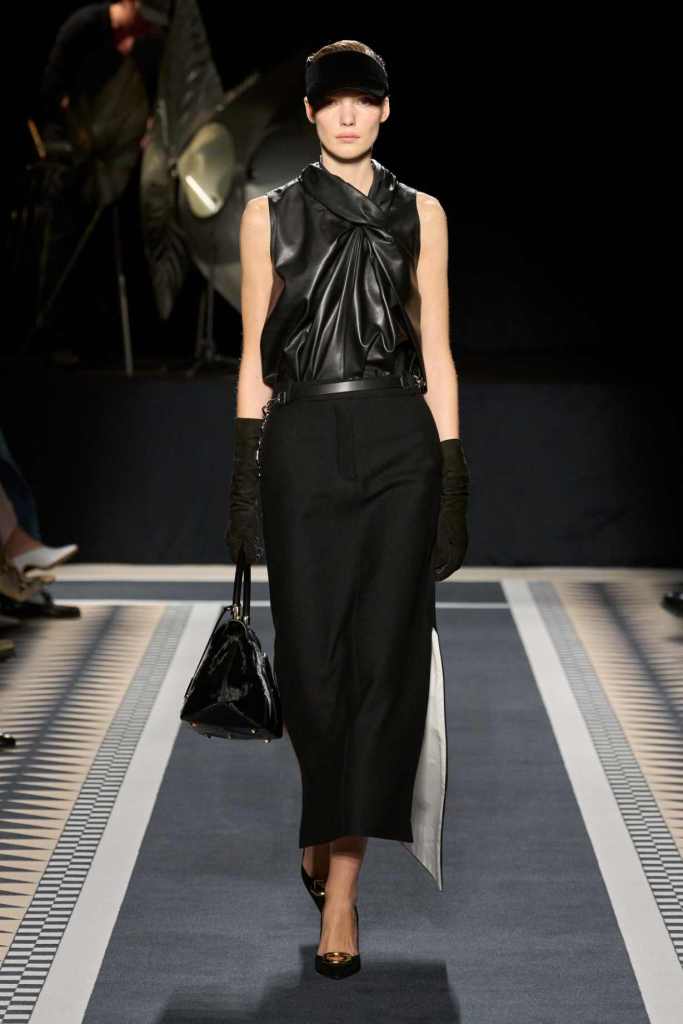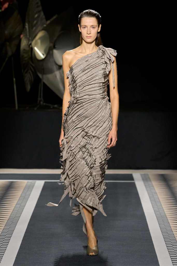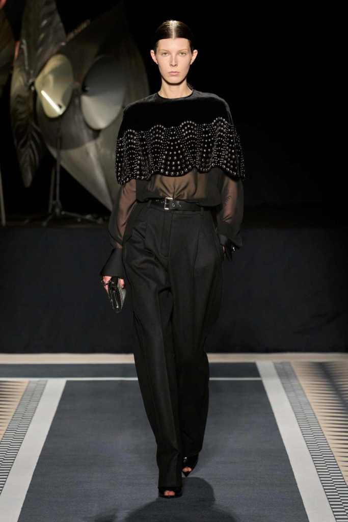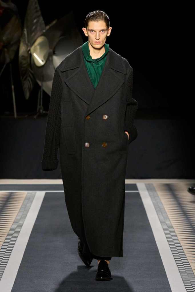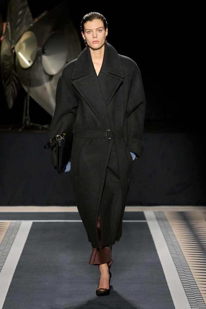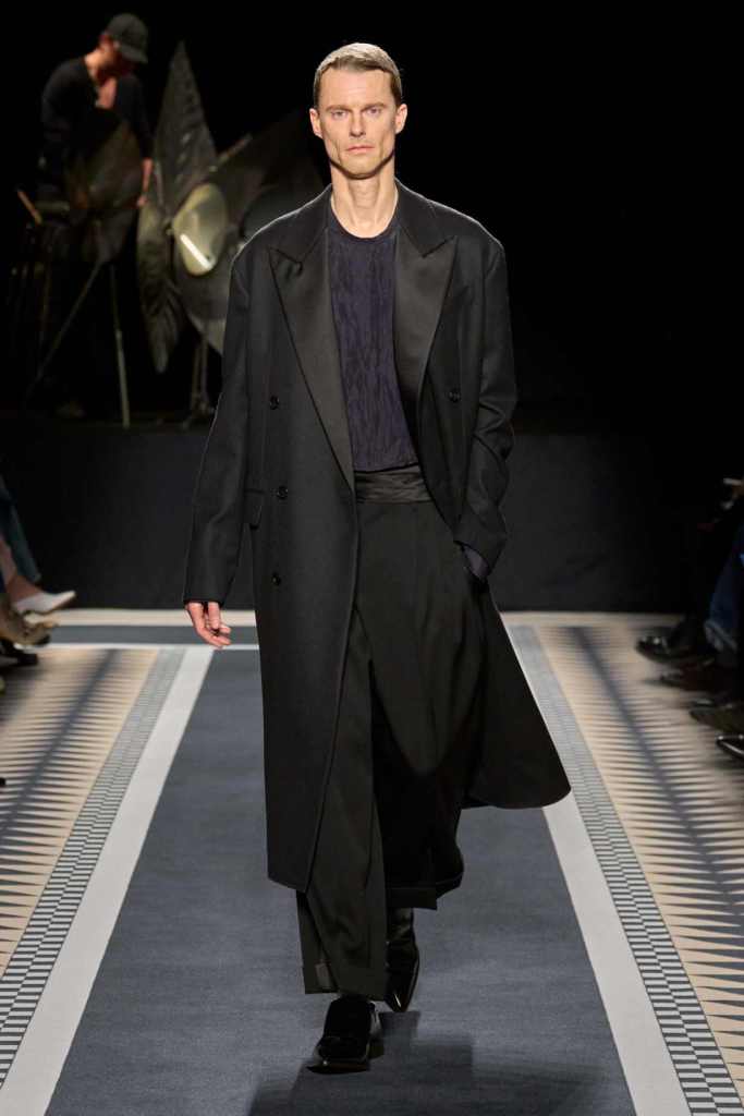 Outerwear played a leading role in the show. Soft, fluid trenches and reworked peacoats elevated the concept of Parisian staples. There was also a black leather overcoat, subtly nodding to 1920s driving coats, which exemplified the house’s cross-generational spirit. Copping’s approach to daywear was understated yet thoughtful—perfectly tailored, but not overpowering. His couture-like spiral-draped ribbon dresses added a touch of drama, while zigzag dévoré velvets and looser printed pieces balanced out the collection. Menswear—new territory for Copping—showed promise – Standout looks included a silver mirror-embroidered long-sleeve t-shirt and a sharp, minimal peacoat.