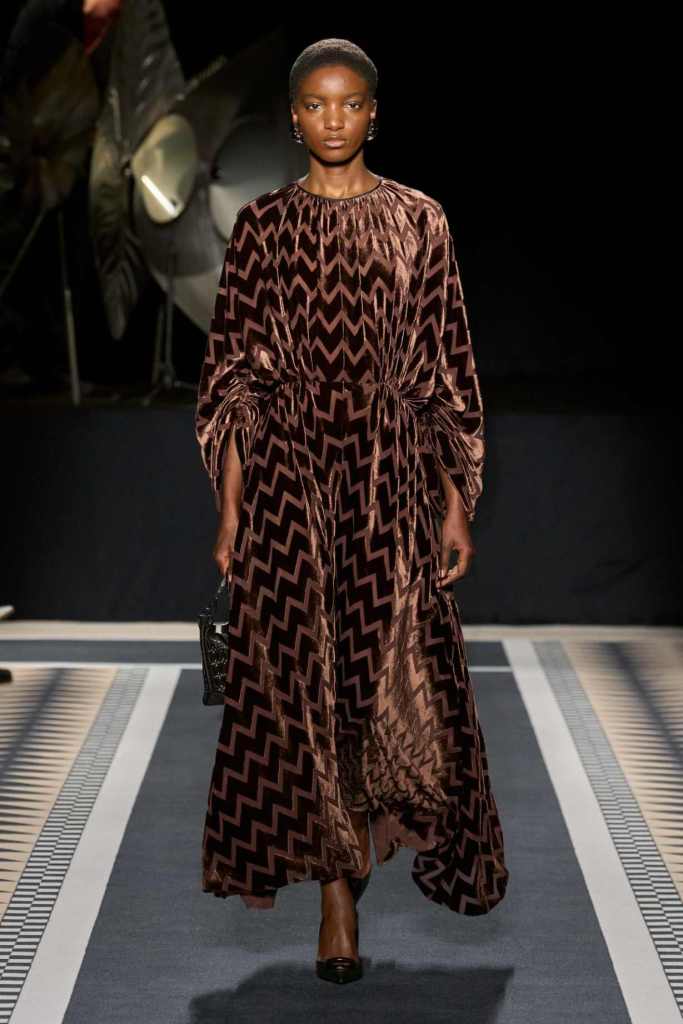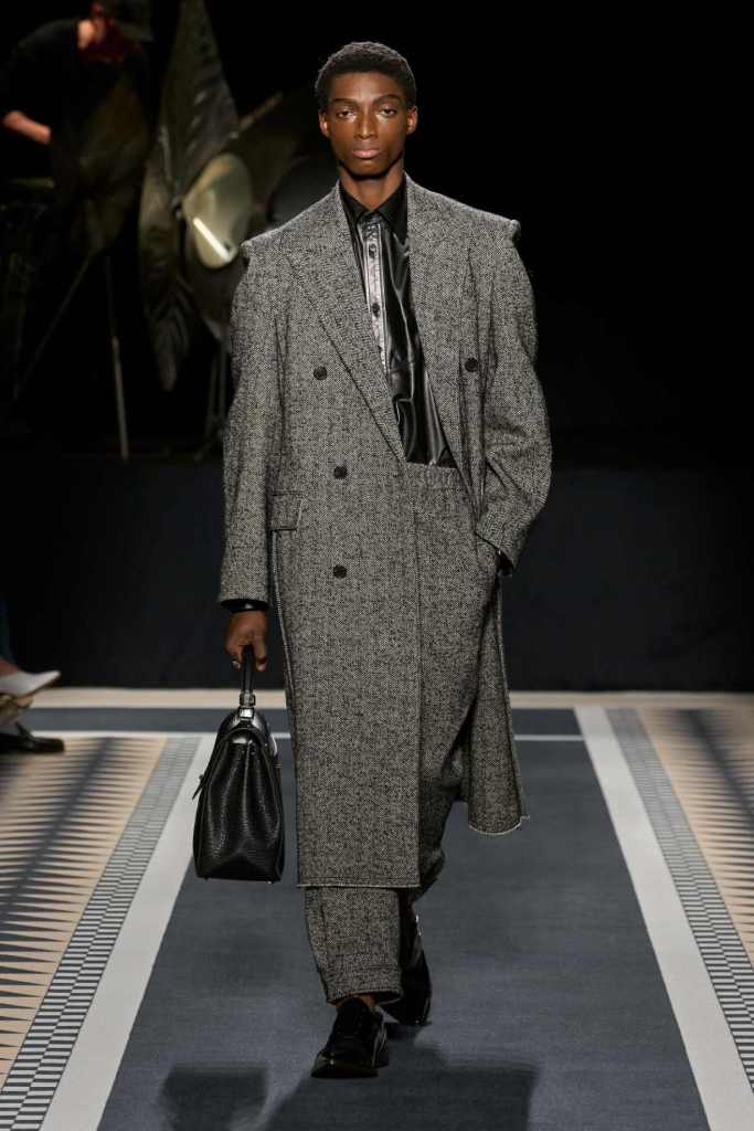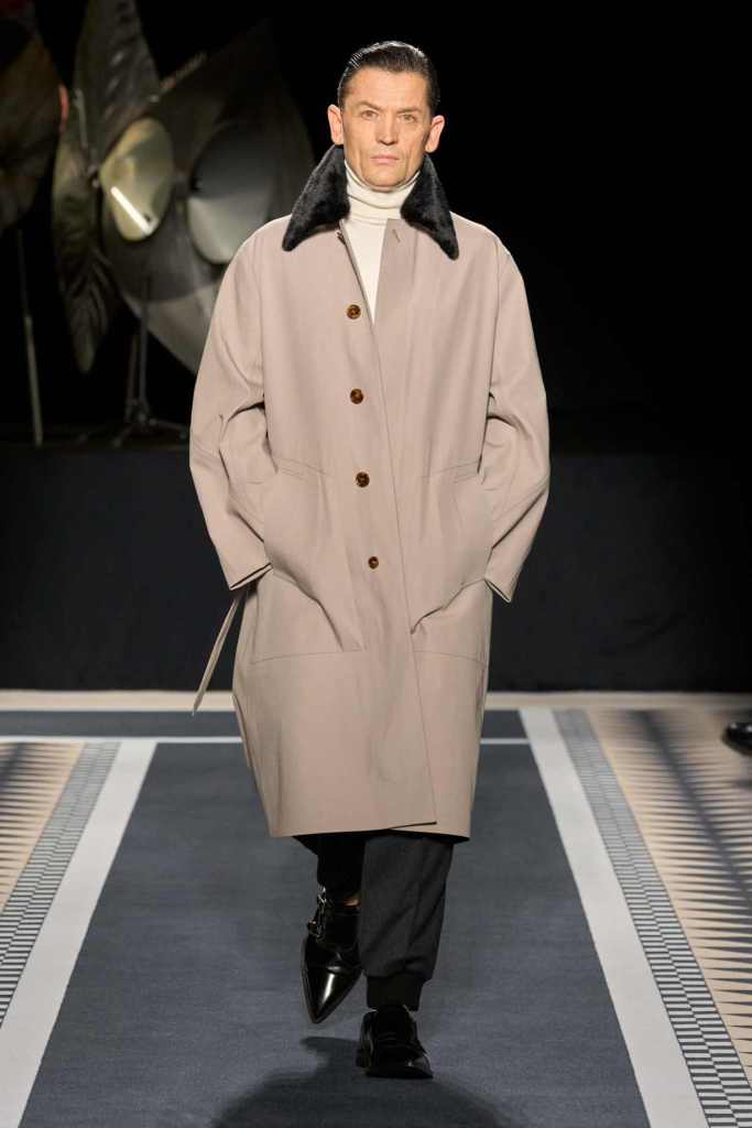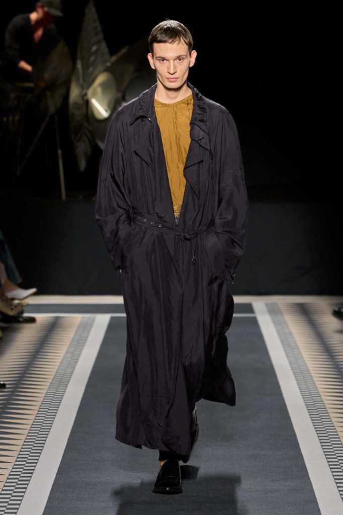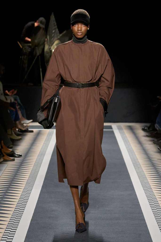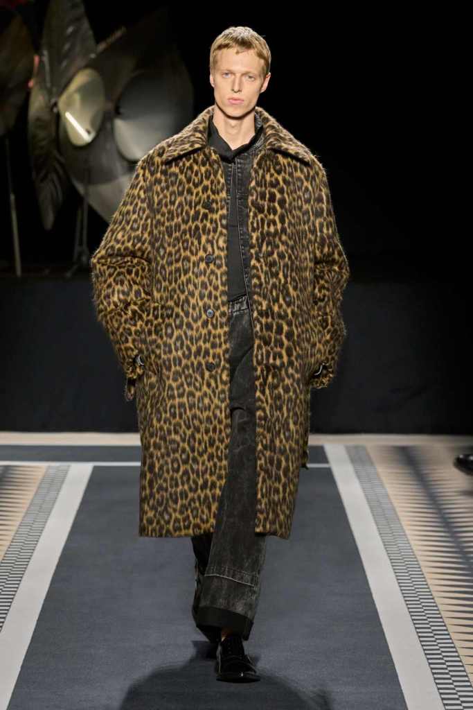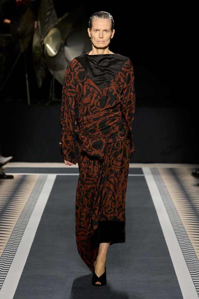 Outerwear played a leading role in the show. Soft, fluid trenches and reworked peacoats elevated the concept of Parisian staples. There was also a black leather overcoat, subtly nodding to 1920s driving coats, which exemplified the house’s cross-generational spirit. Copping’s approach to daywear was understated yet thoughtful—perfectly tailored, but not overpowering. His couture-like spiral-draped ribbon dresses added a touch of drama, while zigzag dévoré velvets and looser printed pieces balanced out the collection. Menswear—new territory for Copping—showed promise – Standout looks included a silver mirror-embroidered long-sleeve t-shirt and a sharp, minimal peacoat.