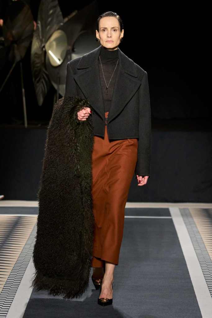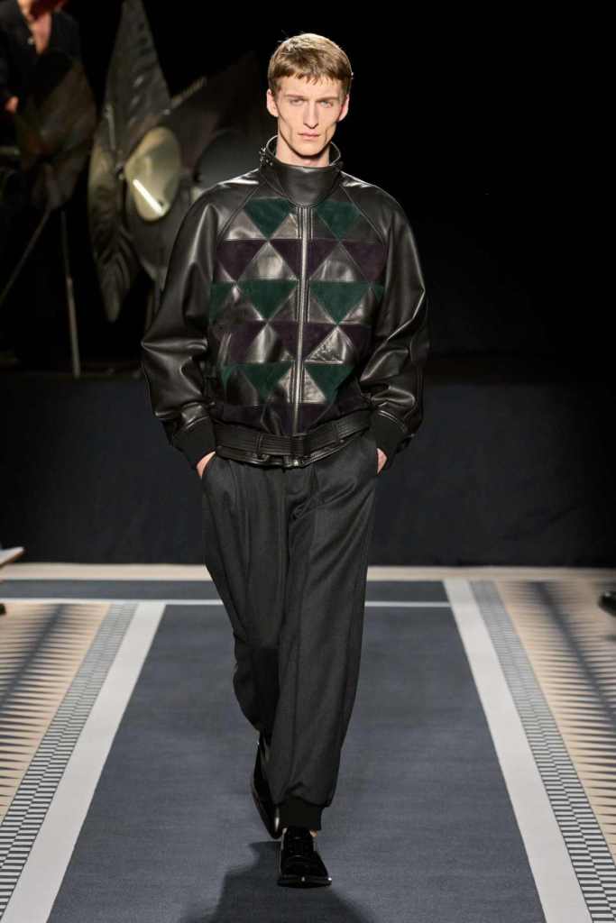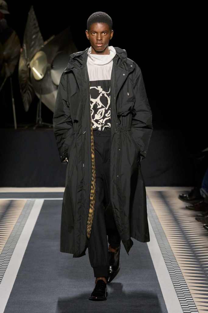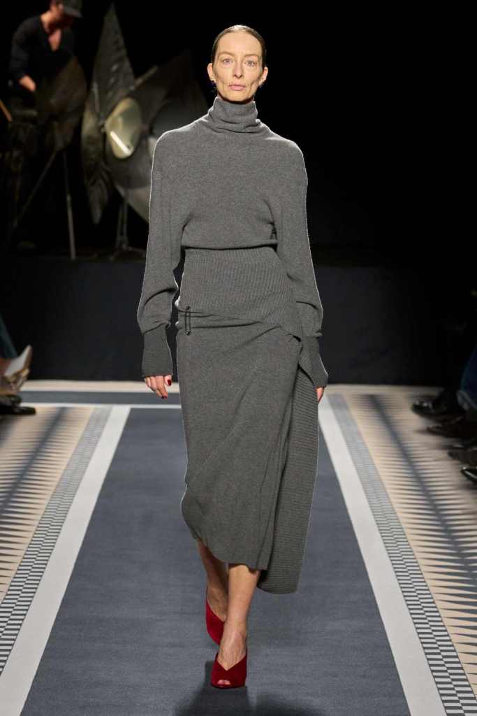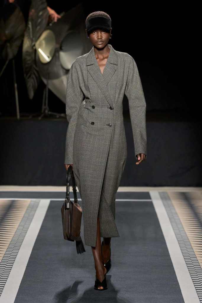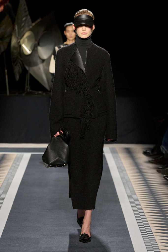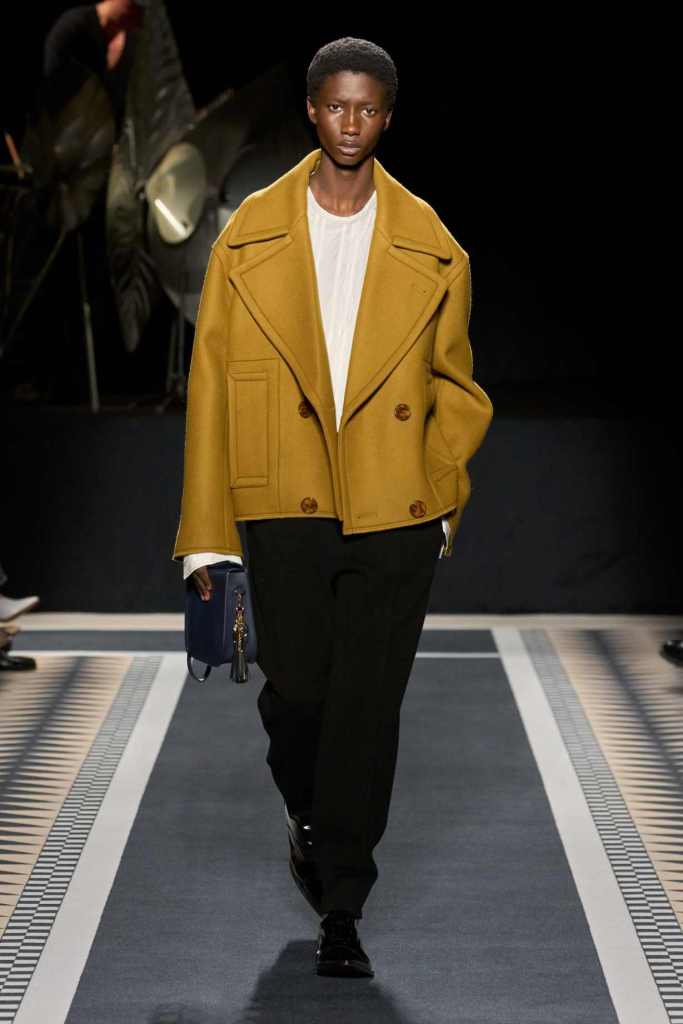 Outerwear played a leading role in the show. Soft, fluid trenches and reworked peacoats elevated the concept of Parisian staples. There was also a black leather overcoat, subtly nodding to 1920s driving coats, which exemplified the house’s cross-generational spirit. Copping’s approach to daywear was understated yet thoughtful—perfectly tailored, but not overpowering. His couture-like spiral-draped ribbon dresses added a touch of drama, while zigzag dévoré velvets and looser printed pieces balanced out the collection. Menswear—new territory for Copping—showed promise – Standout looks included a silver mirror-embroidered long-sleeve t-shirt and a sharp, minimal peacoat.