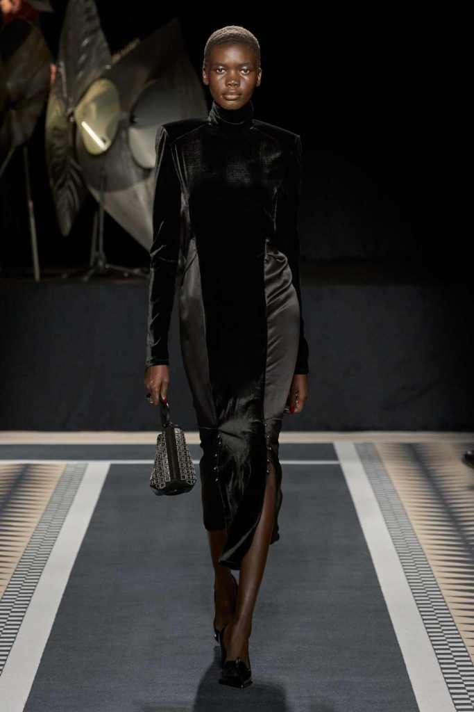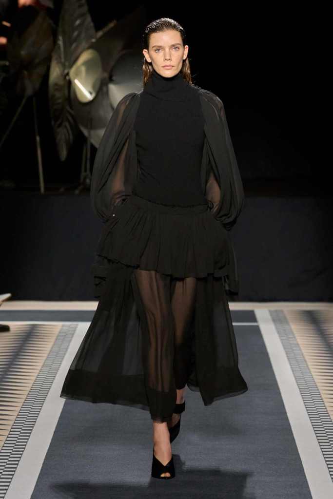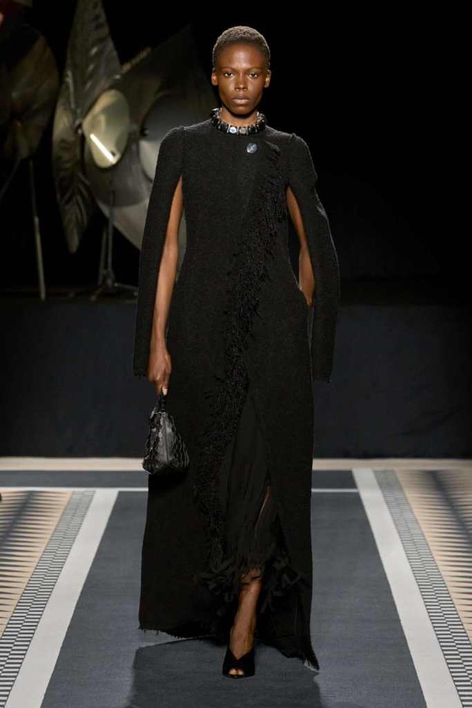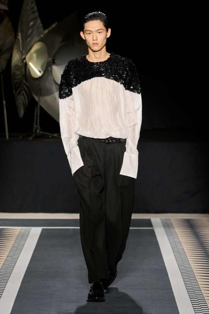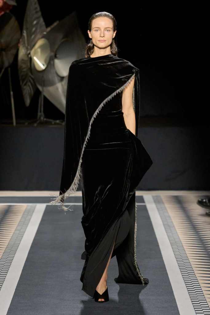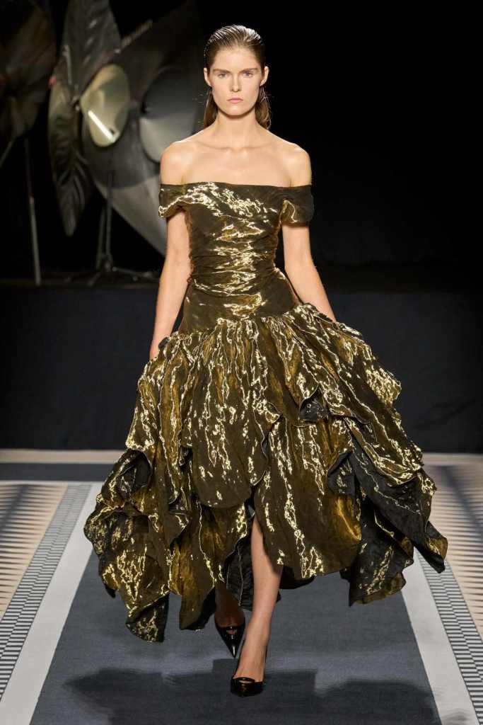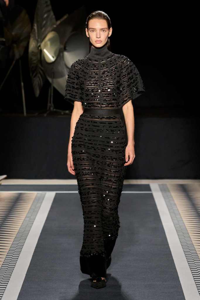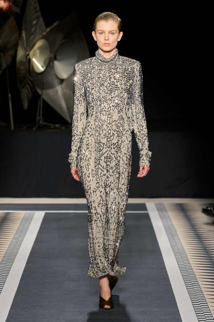 One of the standout moments was the elegant interplay between structure and fluidity. Copping drew inspiration from Jeanne Lanvin’s iconic robe de style, presenting it as a metallic lurex dress with a full petalled skirt—modern yet undeniably rooted in history. Silhouettes throughout were sleek and lengthened, often paying homage to the house’s historic mother-and-child emblem. A particularly striking piece was a black velvet column dress with a simple cascade of silver sequins draped over the shoulders, showcasing the designer’s restraint and mastery of minimal embellishment.