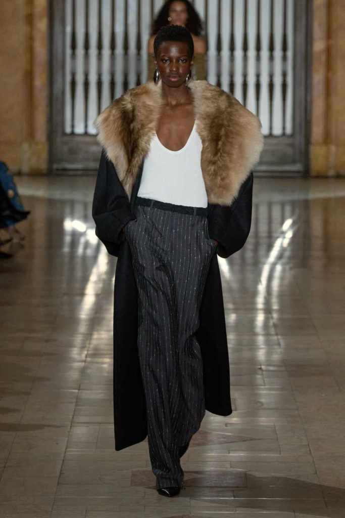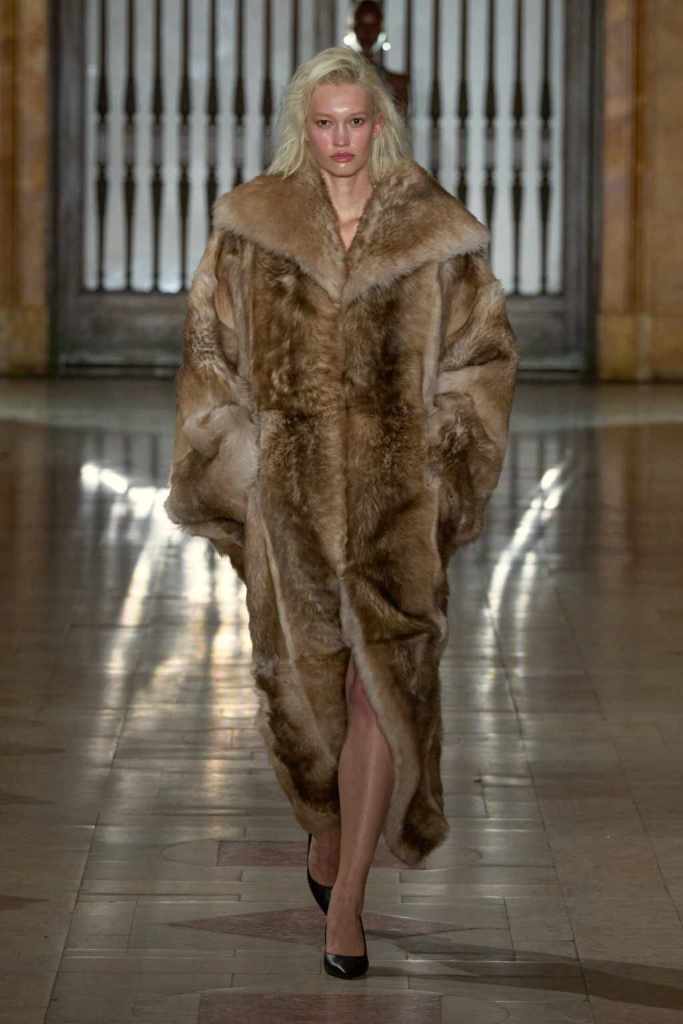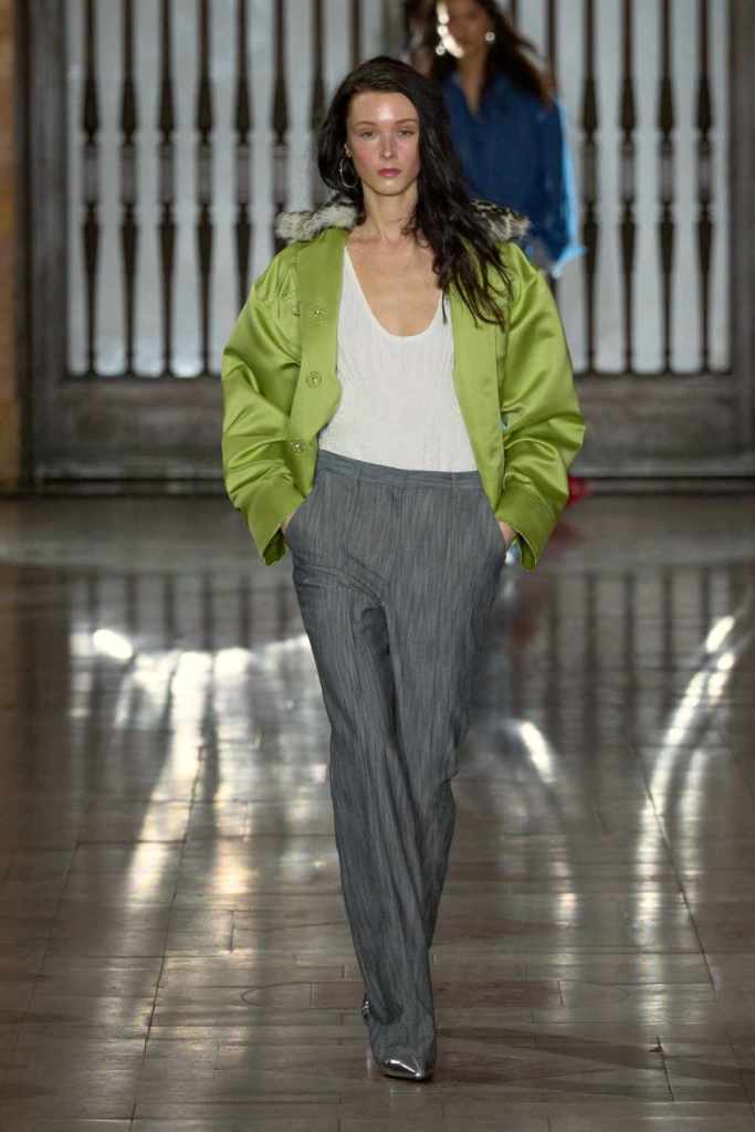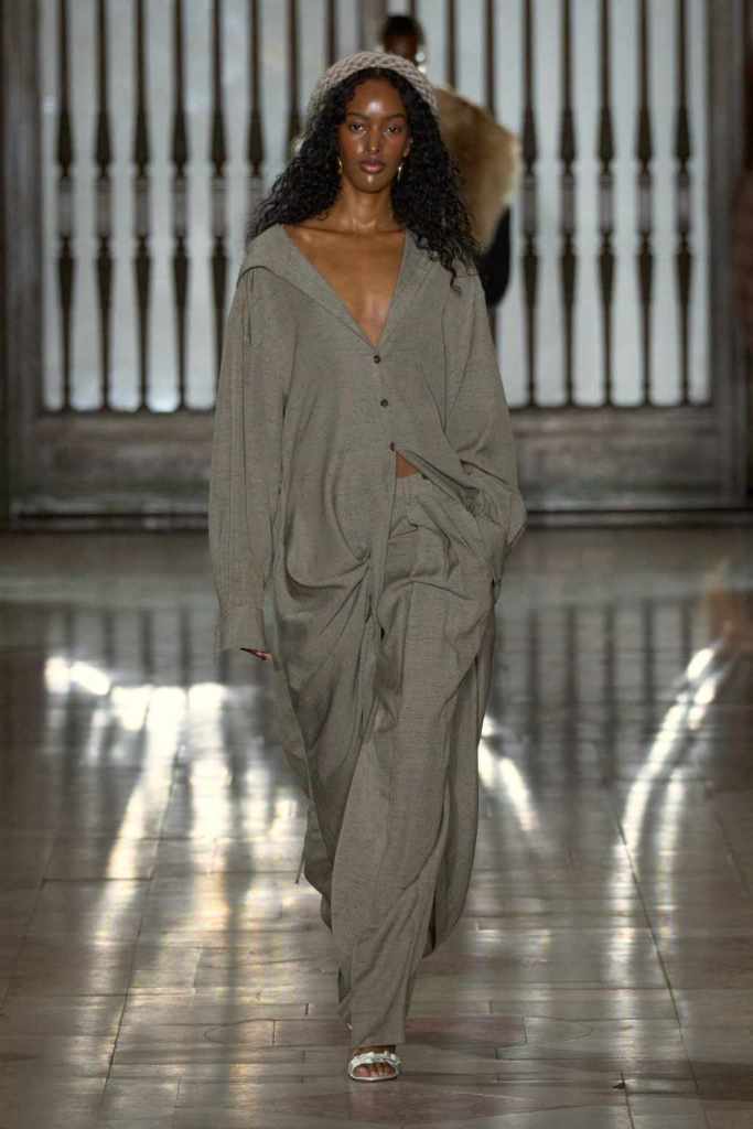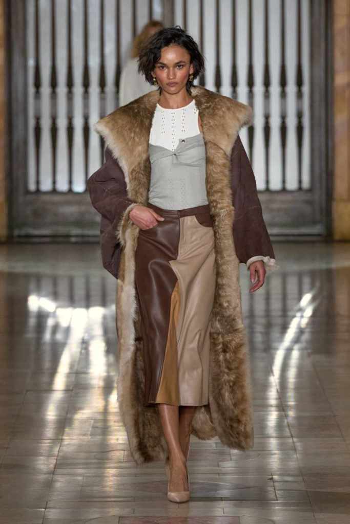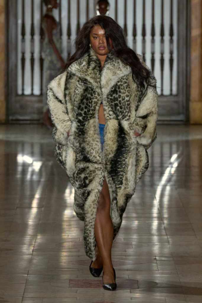 Gurung was inspired by the liminal space between a night out and the morning after—a moment of transition, both physically and emotionally. This translated into oversized men’s shirting worn in an undone, haphazard way, leather trousers with elongated silhouettes, and cocoon-like coats that enveloped the wearer in warmth. Knitwear also played a major role, with vibrant cardigans and Mongolian shearling coats adding texture and coziness to the mix.