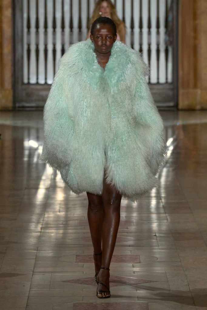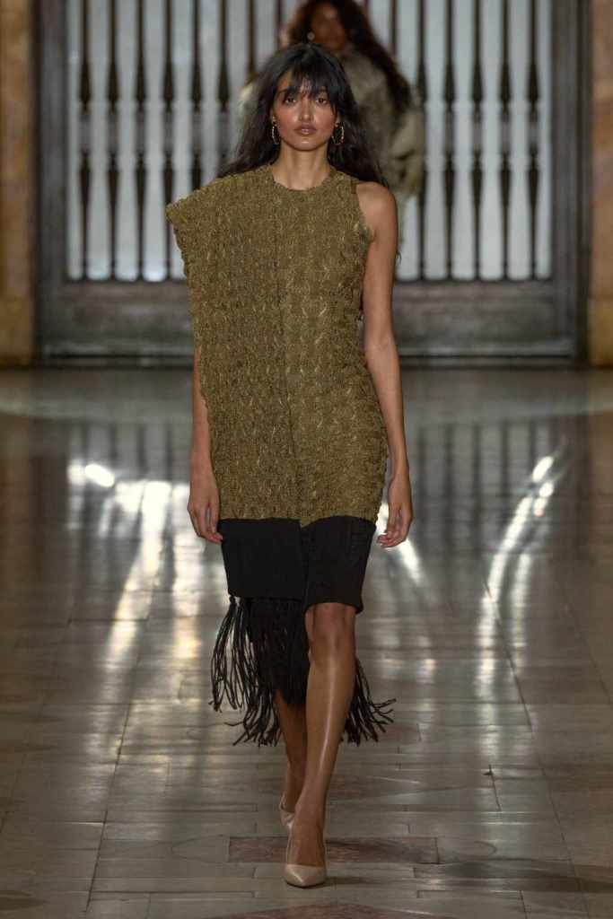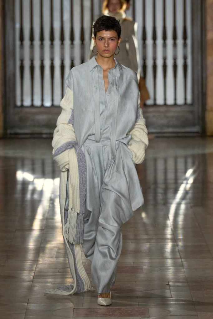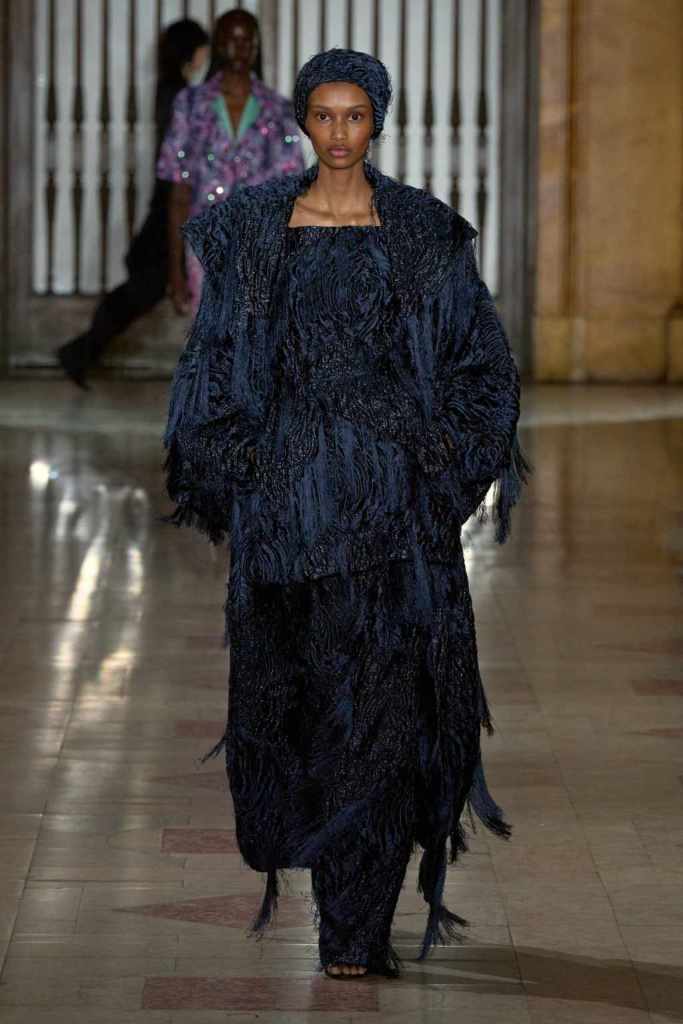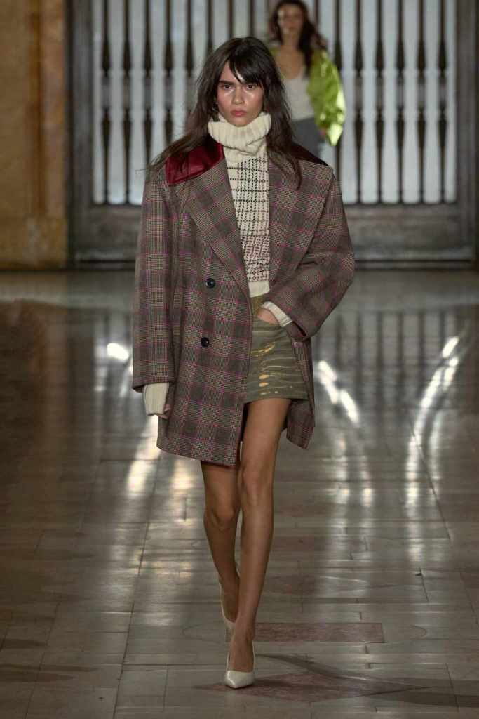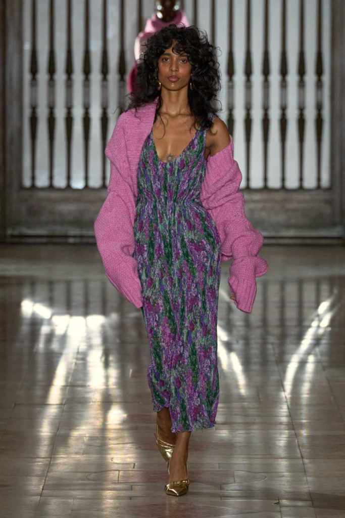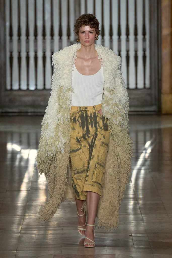 Gurung was inspired by the liminal space between a night out and the morning after—a moment of transition, both physically and emotionally. This translated into oversized men’s shirting worn in an undone, haphazard way, leather trousers with elongated silhouettes, and cocoon-like coats that enveloped the wearer in warmth. Knitwear also played a major role, with vibrant cardigans and Mongolian shearling coats adding texture and coziness to the mix.