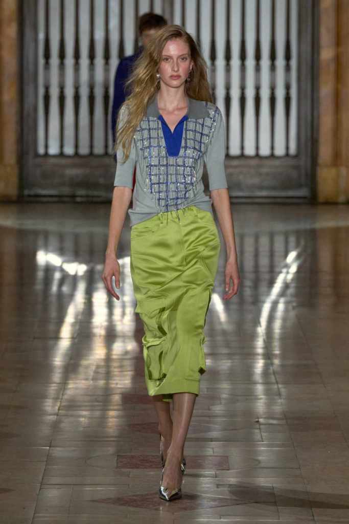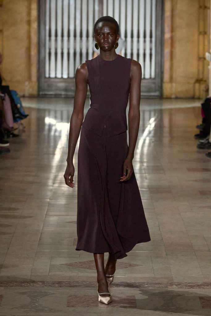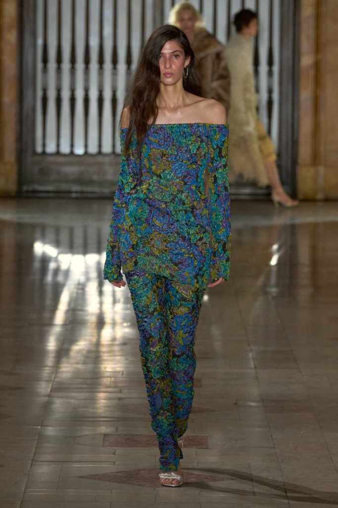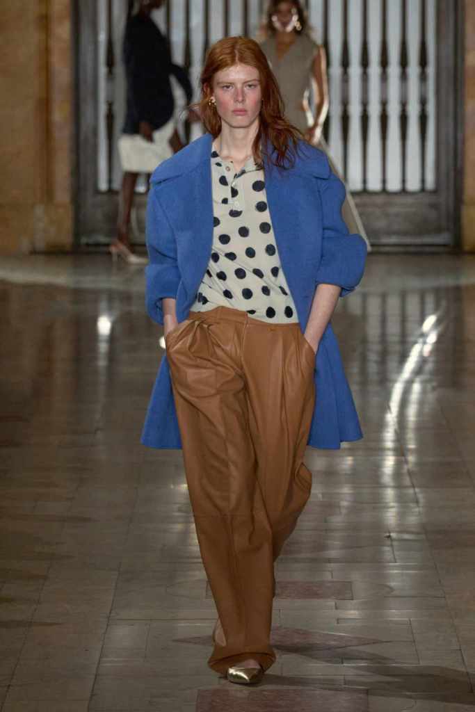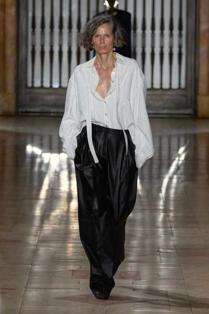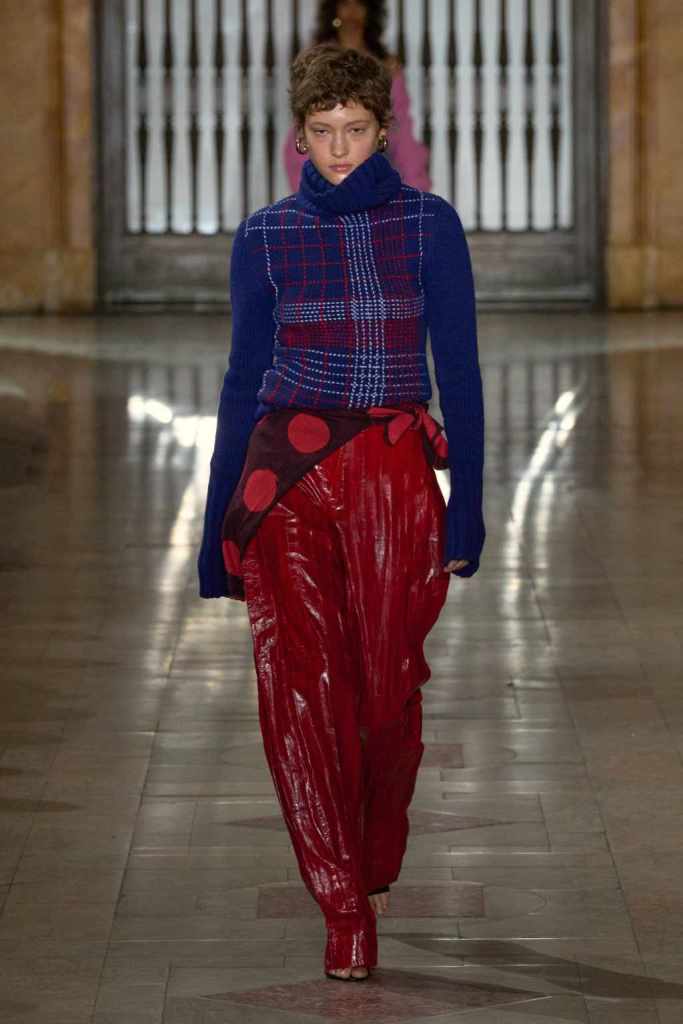Gurung was inspired by the liminal space between a night out and the morning after—a moment of transition, both physically and emotionally. This translated into oversized men’s shirting worn in an undone, haphazard way, leather trousers with elongated silhouettes, and cocoon-like coats that enveloped the wearer in warmth. Knitwear also played a major role, with vibrant cardigans and Mongolian shearling coats adding texture and coziness to the mix.