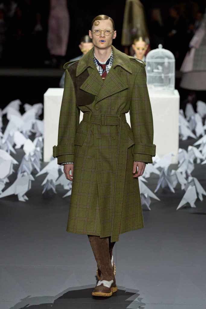 The opening looks featured oversized, waterproof cashmere parkas cocooning models, paired with shrunken patch pocket jackets, mini wool flannel shorts, and four-bar v-neck cardigans. Thigh-high wader boots in light grey and white suede reinforced the collection’s ornithological theme, hinting at a readiness to weather any storm. Heritage tweeds, woven specifically for this collection, appeared in elongated coats and structured topcoats, adorned with classic patterns like herringbone, Glen plaid, houndstooth, and windowpane checks.