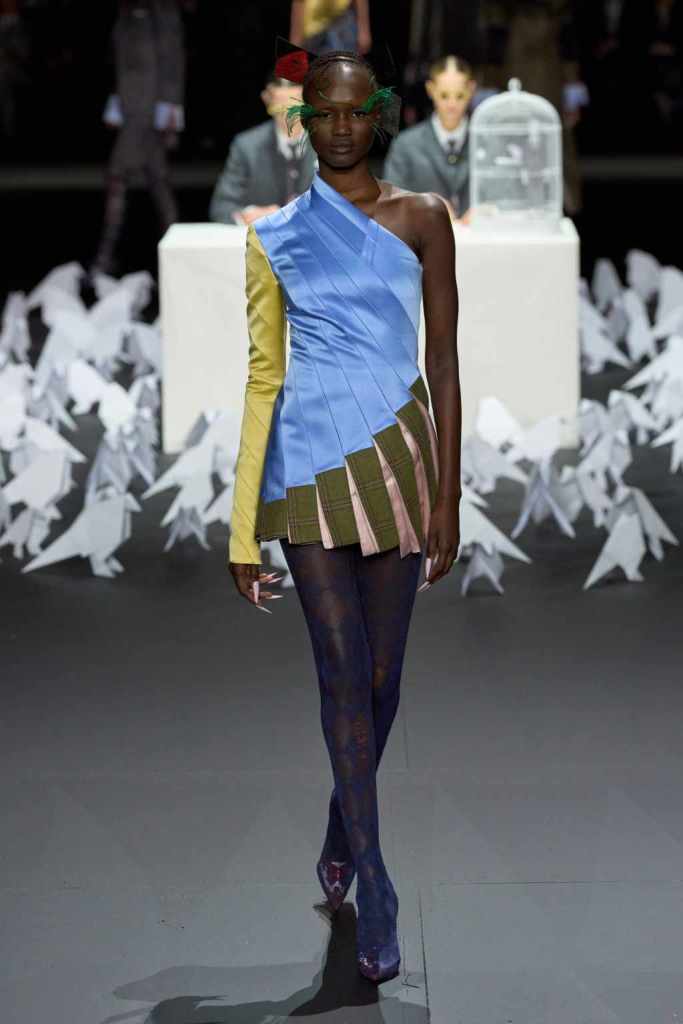 The show opened with two models quietly folding paper birds at a stark white table. Birds have long been a motif in Browne’s work, and this season was no exception. Inspired by a 60 Minutes segment on birdwatching, his avian focus became a powerful metaphor for personal expression and artistic defiance.