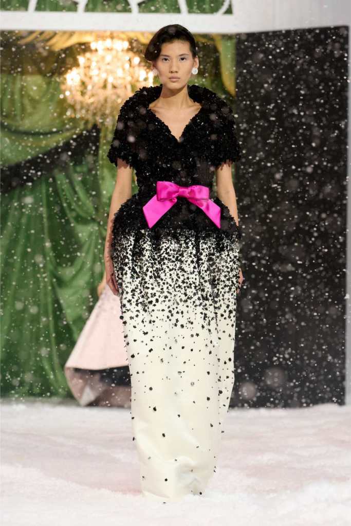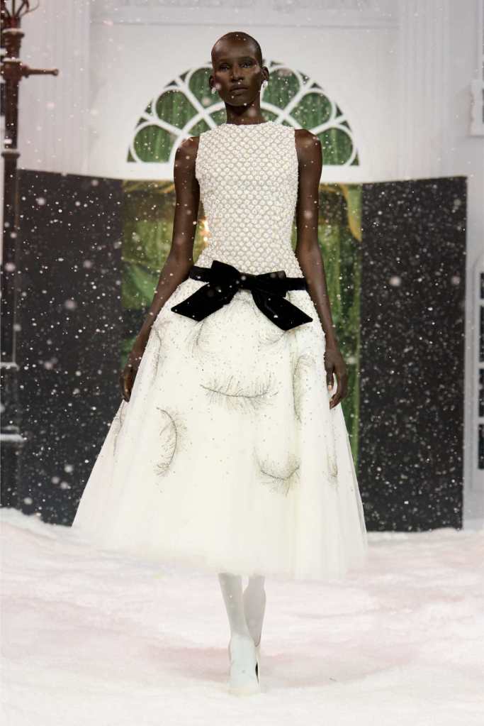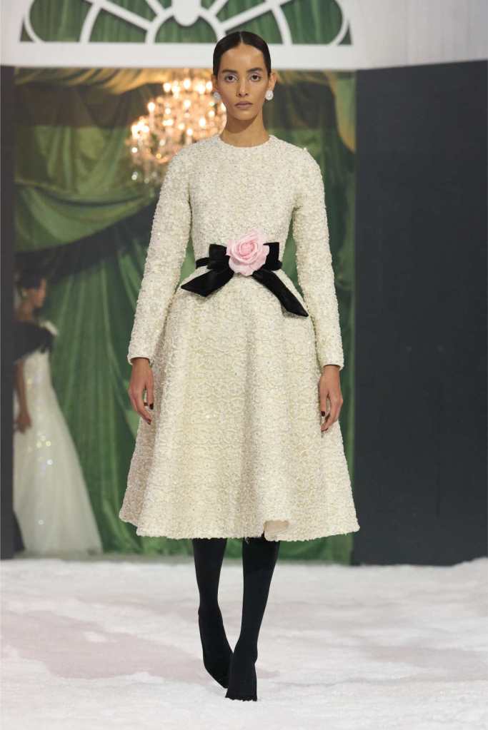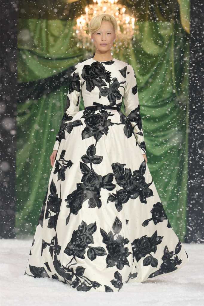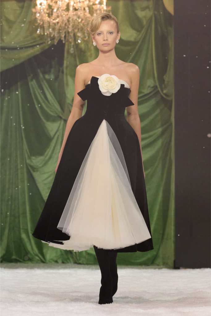 The runway was dominated by a striking black-and-white palette, a departure from the designer’s usual bold florals. This minimalist approach allowed the intricate details of each garment to shine. The collection was heavily influenced by 1950s and ’60s couture, with cinched waists, voluminous skirts, and expertly draped fabrics creating a sense of timeless glamour. Satin bows, delicate rose corsages, and cascading tulle veils added a touch of romance to the otherwise structured looks.