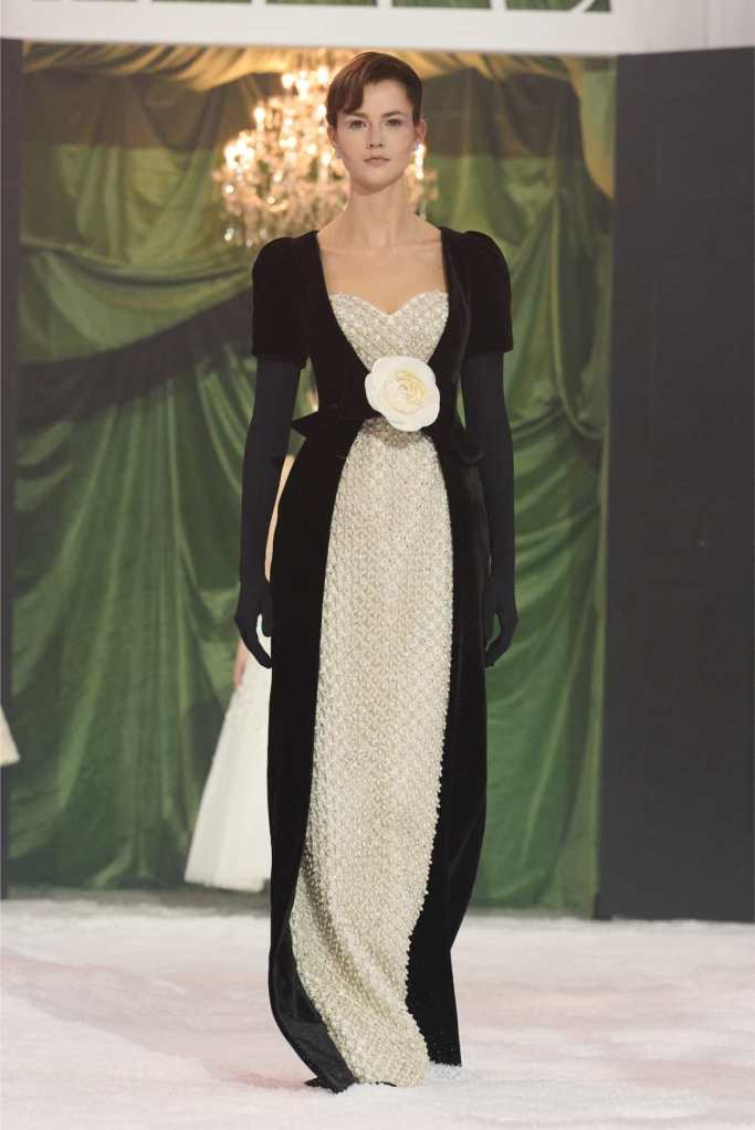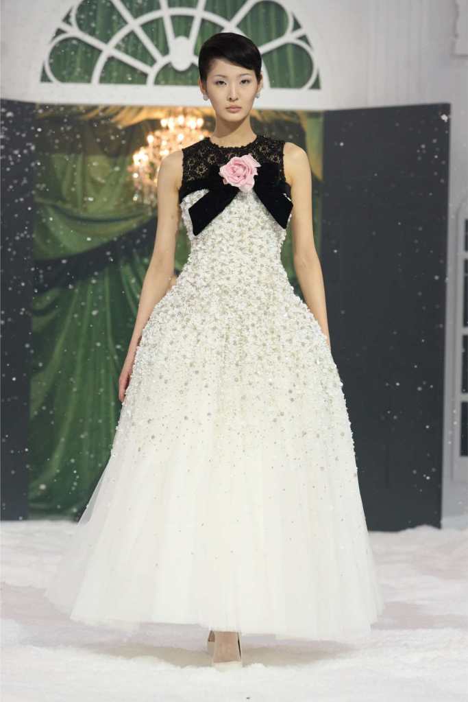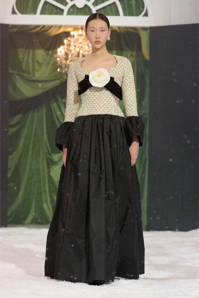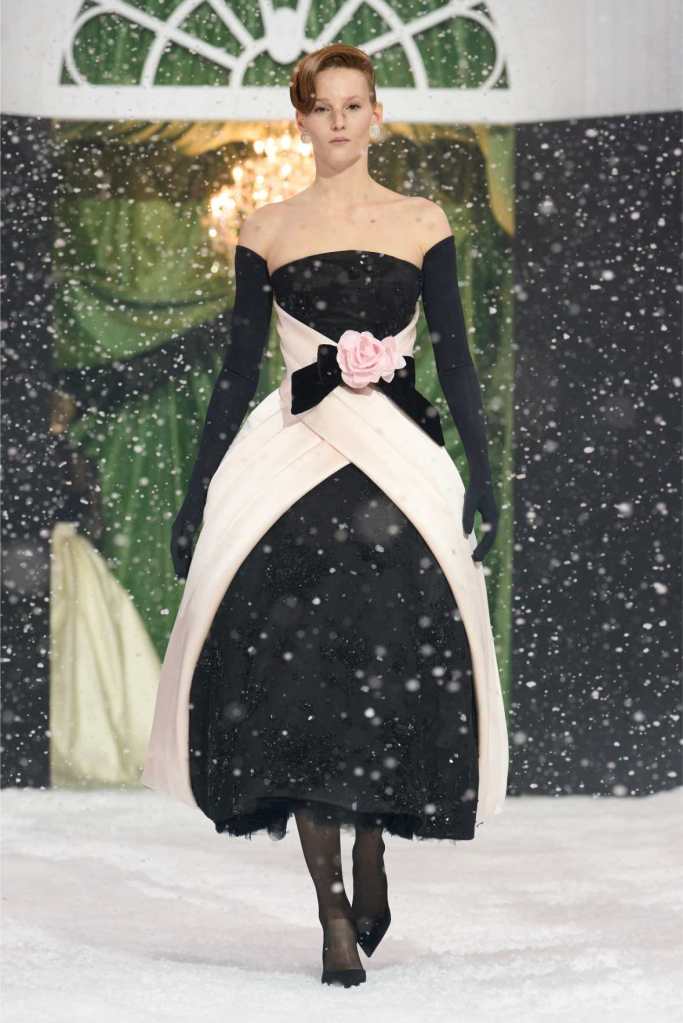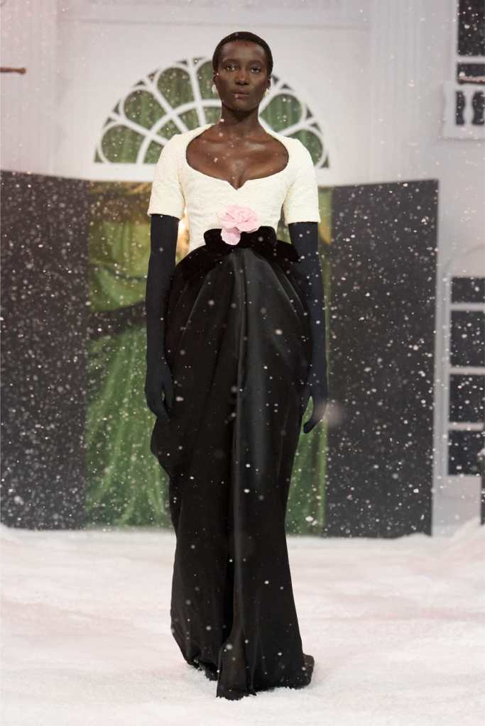 The runway was dominated by a striking black-and-white palette, a departure from the designer’s usual bold florals. This minimalist approach allowed the intricate details of each garment to shine. The collection was heavily influenced by 1950s and ’60s couture, with cinched waists, voluminous skirts, and expertly draped fabrics creating a sense of timeless glamour. Satin bows, delicate rose corsages, and cascading tulle veils added a touch of romance to the otherwise structured looks.