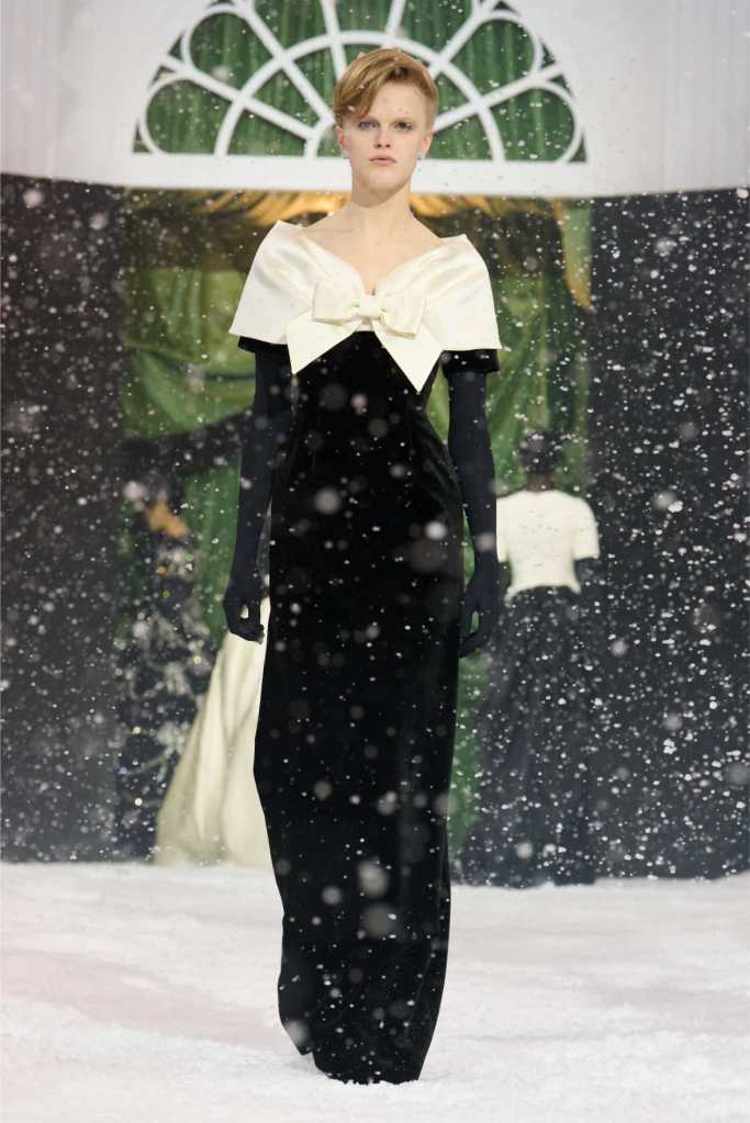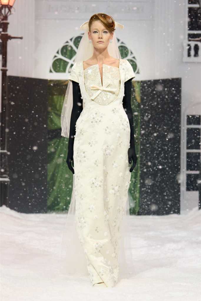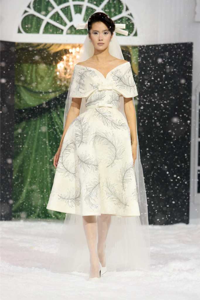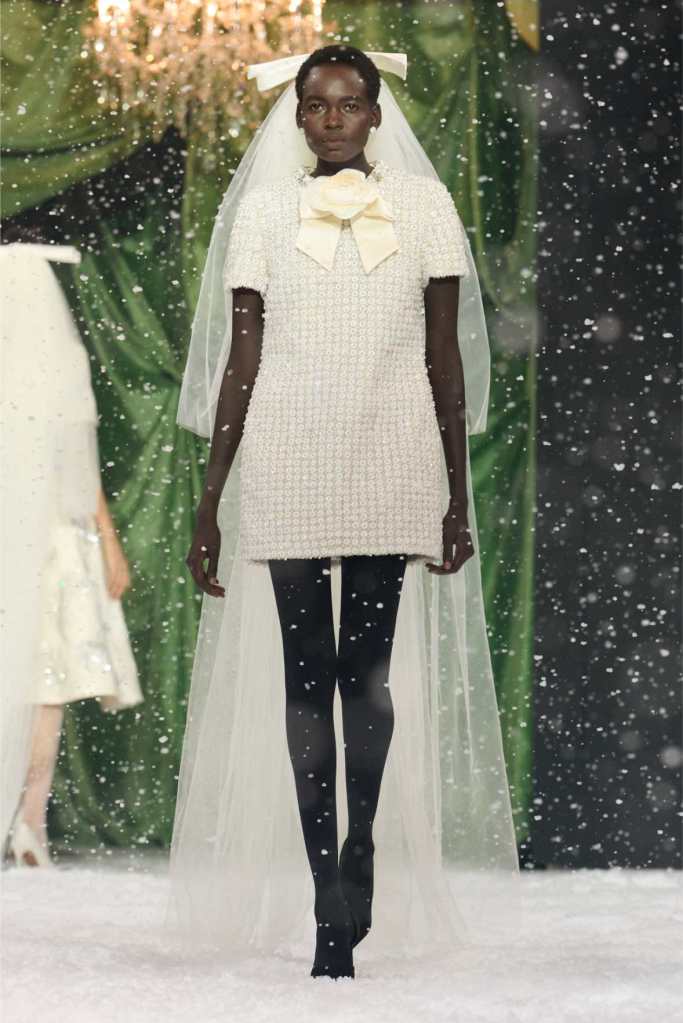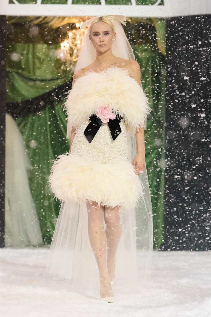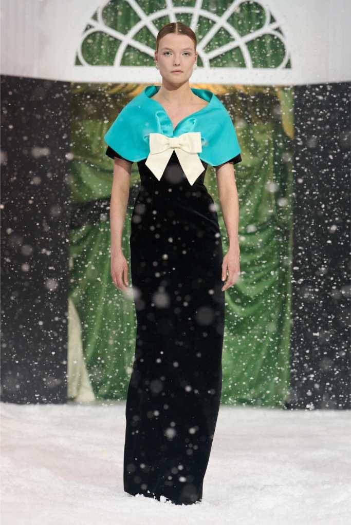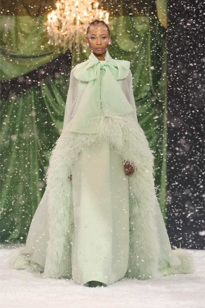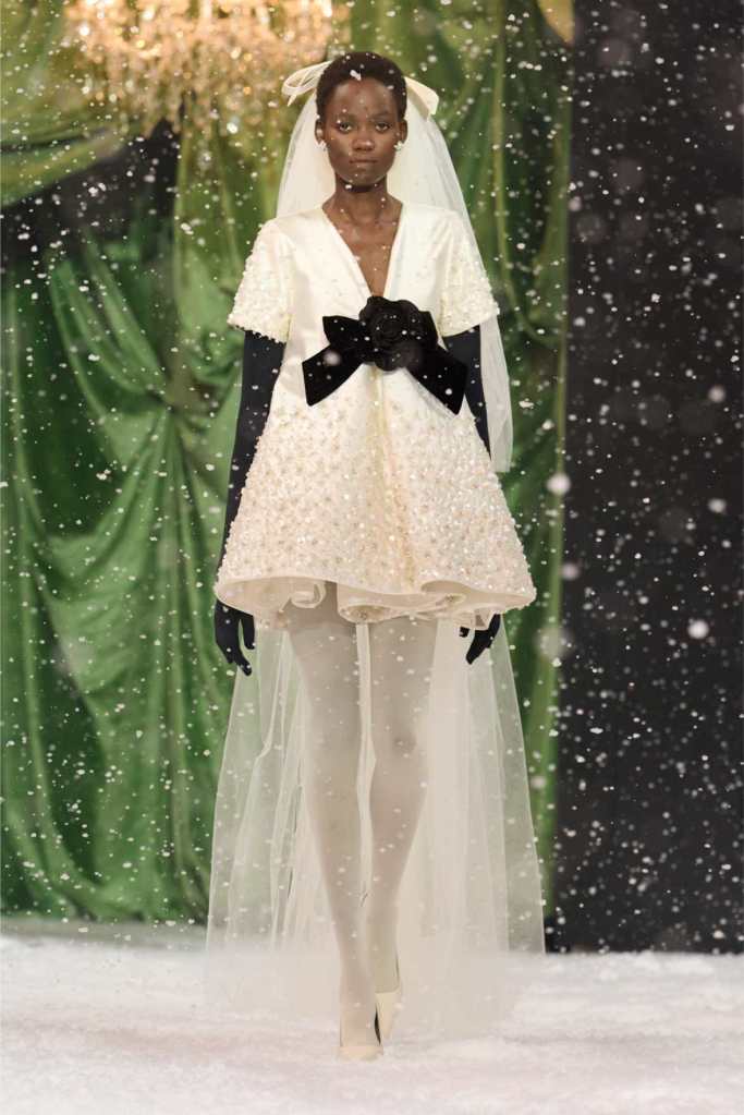 Quinn’s love for embellishment was evident throughout, with sequined embroidery and beadwork catching the light as models walked through the falling snow. A standout piece was a black velvet column dress with an aqua shawl top. Despite the dominance of monochrome, Quinn couldn’t resist injecting a few softer hues into the mix. A mint tulle gown with feather detailing and a lemon curd-colored Sixties-style dress provided subtle pops of color, proving that winter fashion doesn’t have to be entirely devoid of vibrancy. The final bridal looks, featuring sheer veils and intricately detailed dresses, further cemented Quinn’s reputation as a designer capable of blending craftsmanship with fairytale romance. The bridal angle is very strong. The man is a great businessman, or at least has the knack for it.