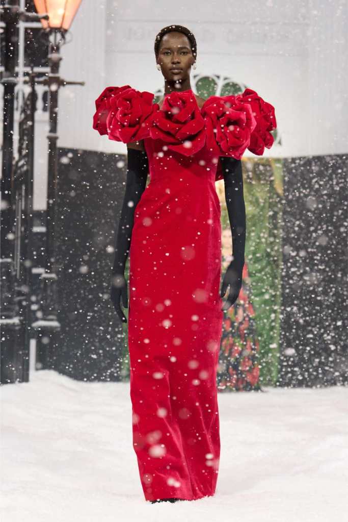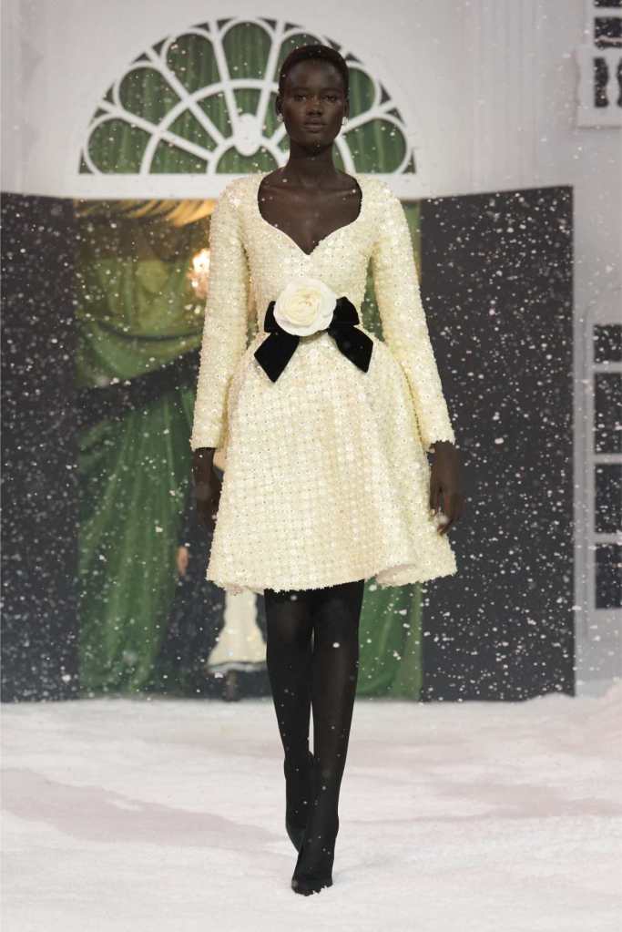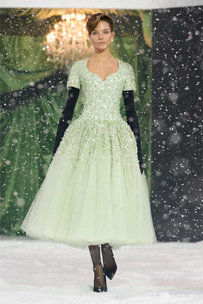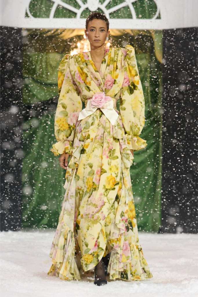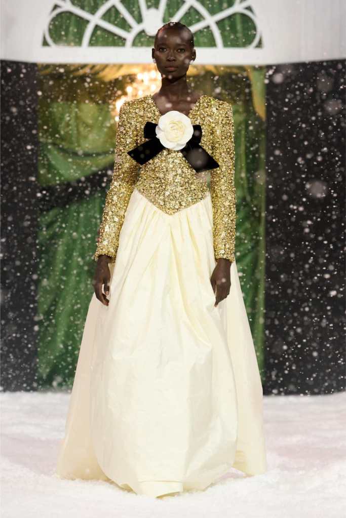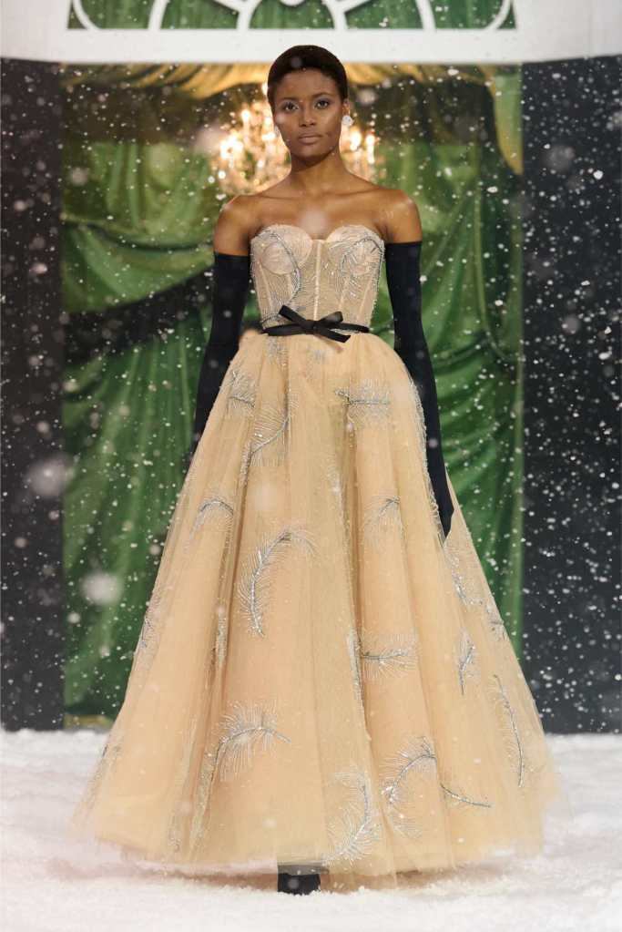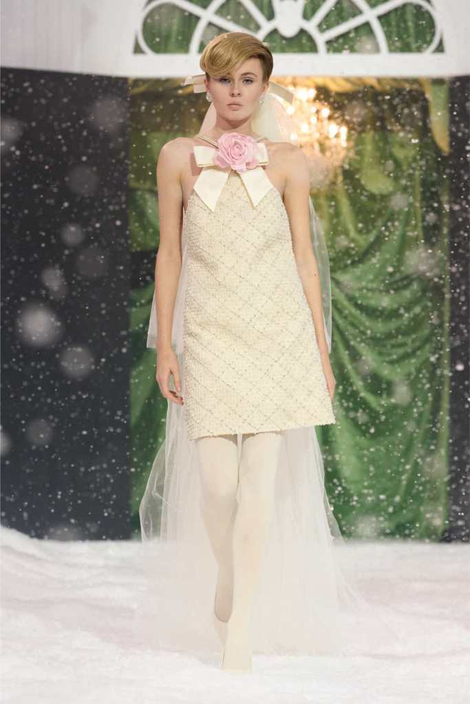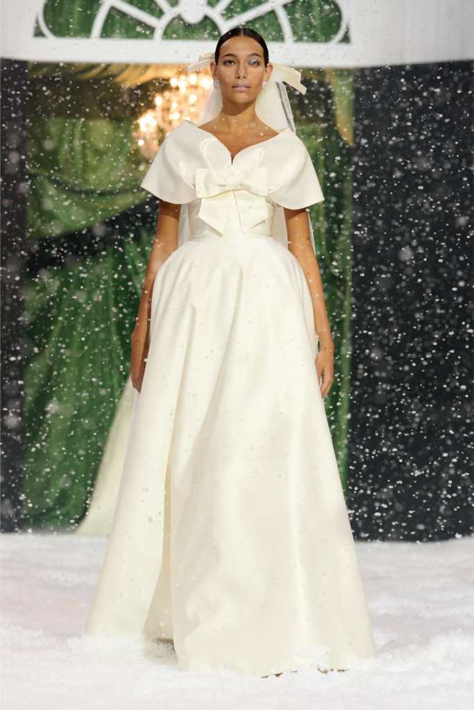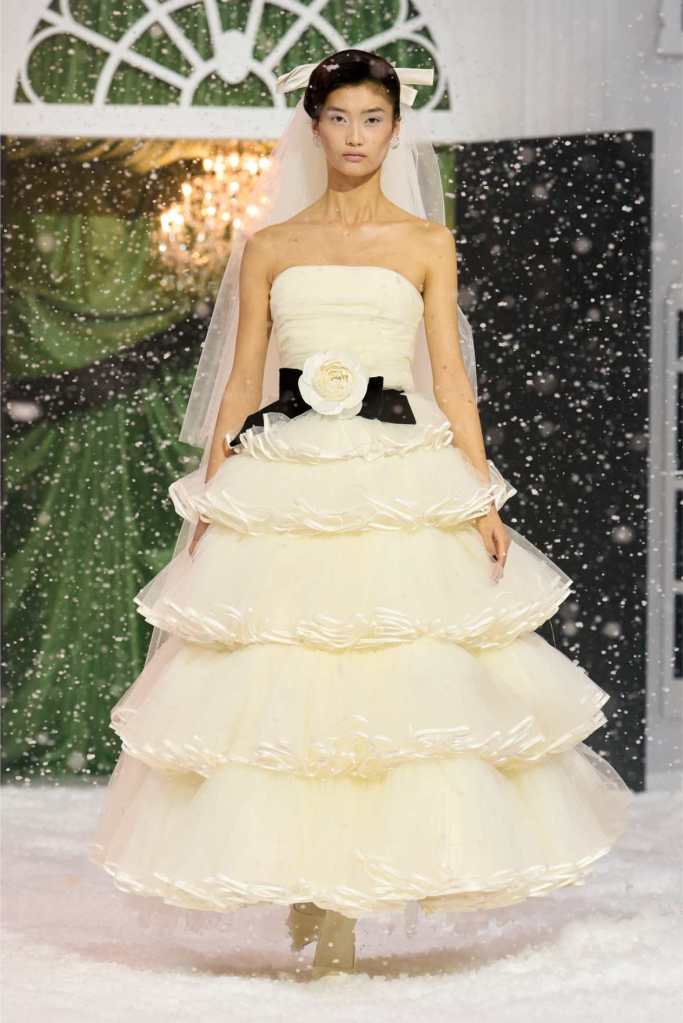 Quinn’s love for embellishment was evident throughout, with sequined embroidery and beadwork catching the light as models walked through the falling snow. A standout piece was a black velvet column dress with an aqua shawl top. Despite the dominance of monochrome, Quinn couldn’t resist injecting a few softer hues into the mix. A mint tulle gown with feather detailing and a lemon curd-colored Sixties-style dress provided subtle pops of color, proving that winter fashion doesn’t have to be entirely devoid of vibrancy. The final bridal looks, featuring sheer veils and intricately detailed dresses, further cemented Quinn’s reputation as a designer capable of blending craftsmanship with fairytale romance. The bridal angle is very strong. The man is a great businessman, or at least has the knack for it.