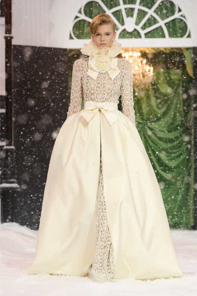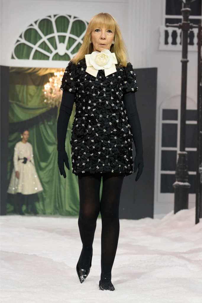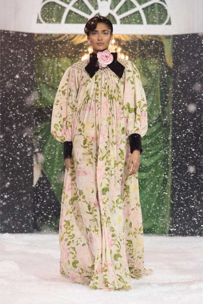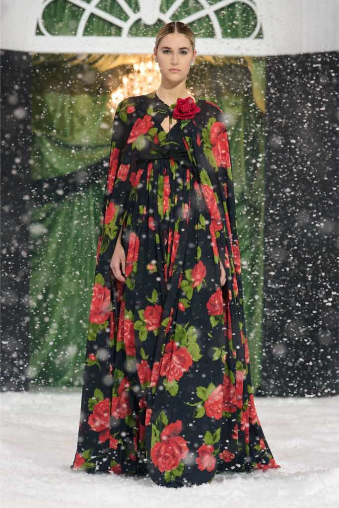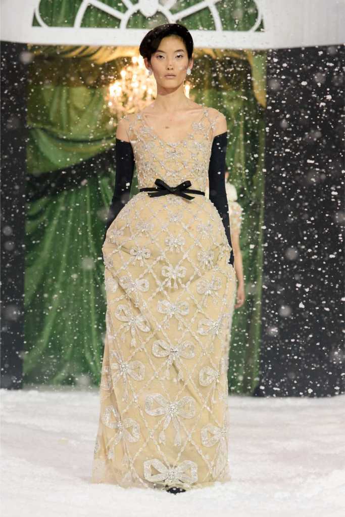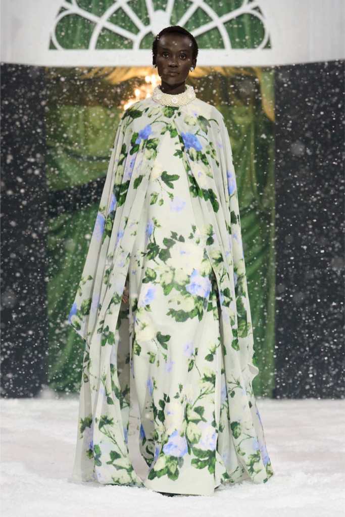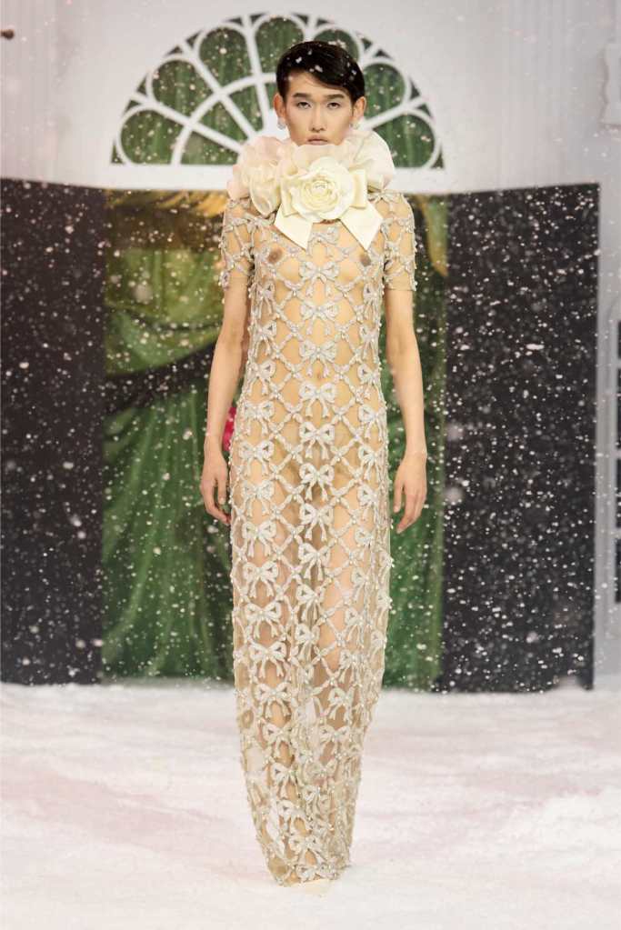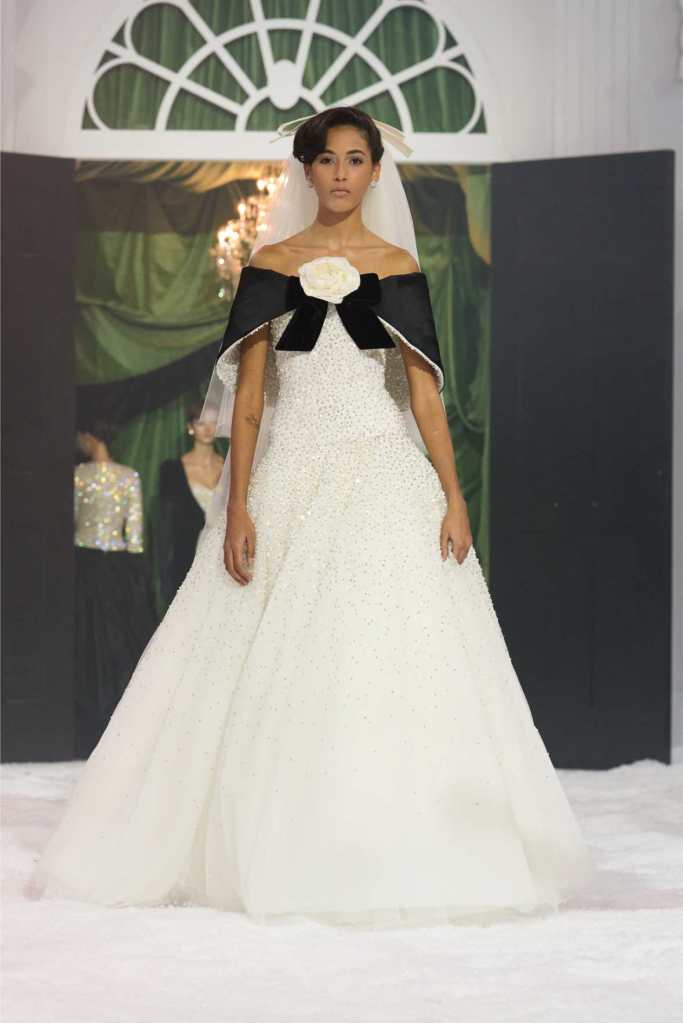 Quinn’s love for embellishment was evident throughout, with sequined embroidery and beadwork catching the light as models walked through the falling snow. A standout piece was a black velvet column dress with an aqua shawl top. Despite the dominance of monochrome, Quinn couldn’t resist injecting a few softer hues into the mix. A mint tulle gown with feather detailing and a lemon curd-colored Sixties-style dress provided subtle pops of color, proving that winter fashion doesn’t have to be entirely devoid of vibrancy. The final bridal looks, featuring sheer veils and intricately detailed dresses, further cemented Quinn’s reputation as a designer capable of blending craftsmanship with fairytale romance. The bridal angle is very strong. The man is a great businessman, or at least has the knack for it.