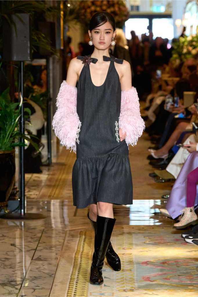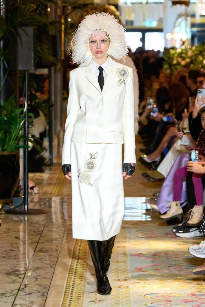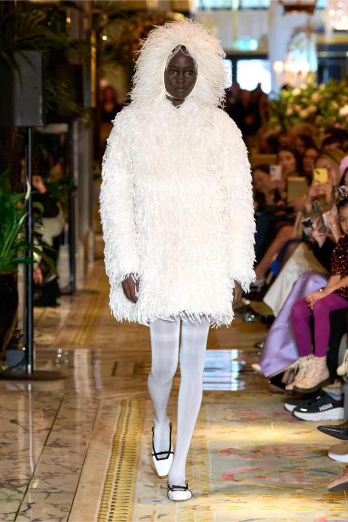 But with so many textures—shredded faux fur, neoprene, sequins, tweed, and feathers—some looks felt a bit too busy. The feathered bonnets, for example, leaned into excess in a way that didn’t quite land. That said, Zhang’s technical craftsmanship is undeniable, and when his ideas worked, they really worked.