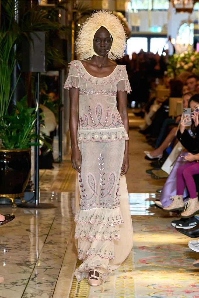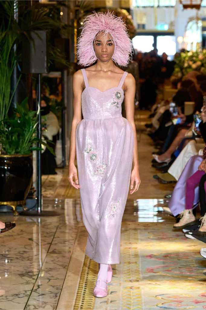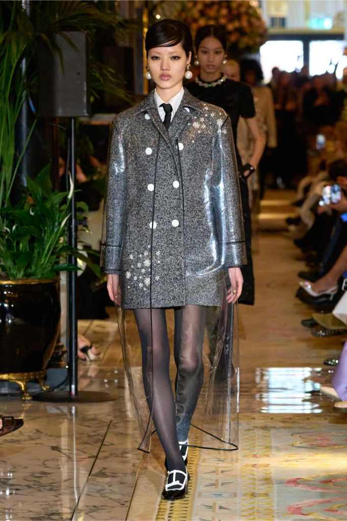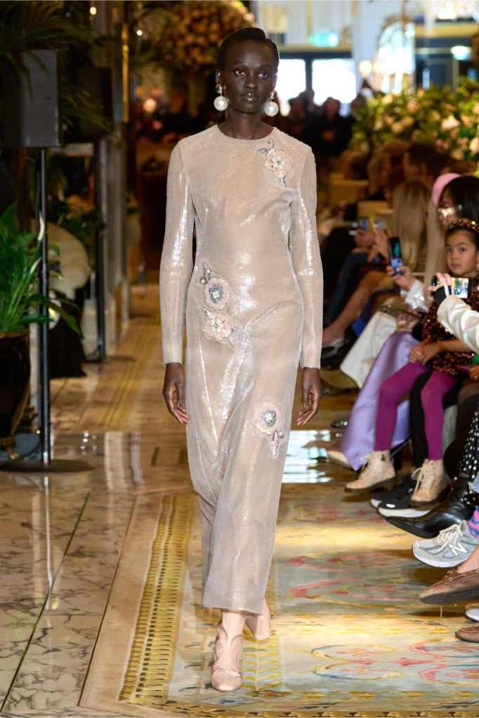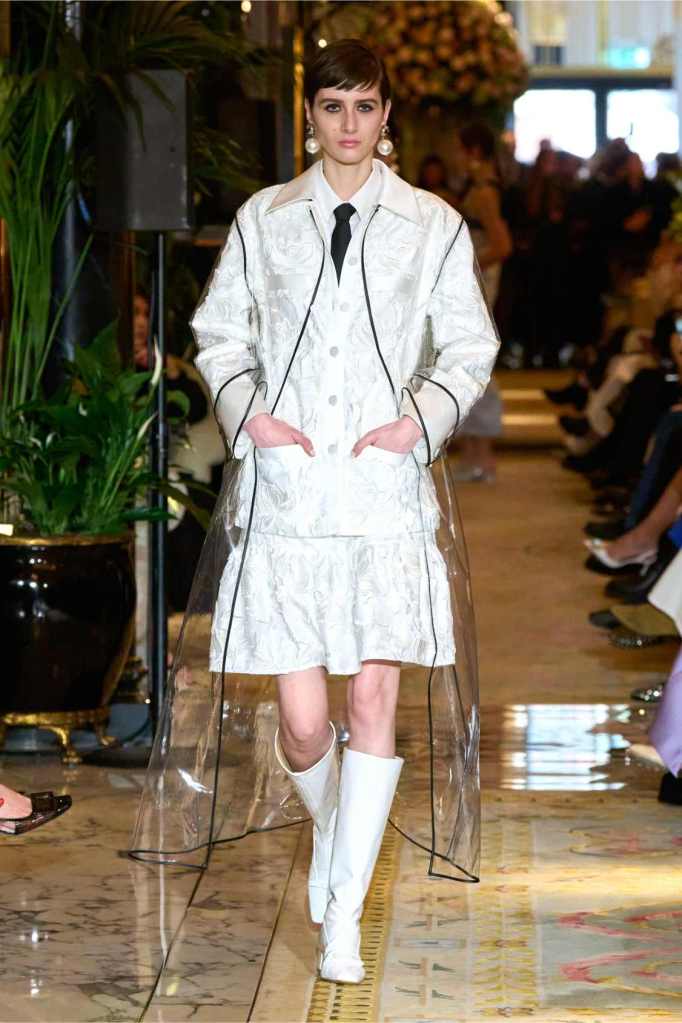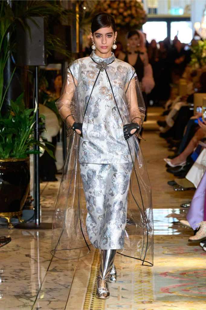 The collection had some fantastic individual pieces. His signature duchesse satin dresses, heavily embellished and red-carpet-ready, were definite standouts. The laser-cut floral fabrics and sequins brought a sense of opulence, while the transparent raincoats added an unexpected rebellious edge to otherwise polished looks. Some of the best moments came from his mix of British tailoring and eveningwear, like tweed suits softened with crystal brooches and perfectly cut skirts with embroidered details.
