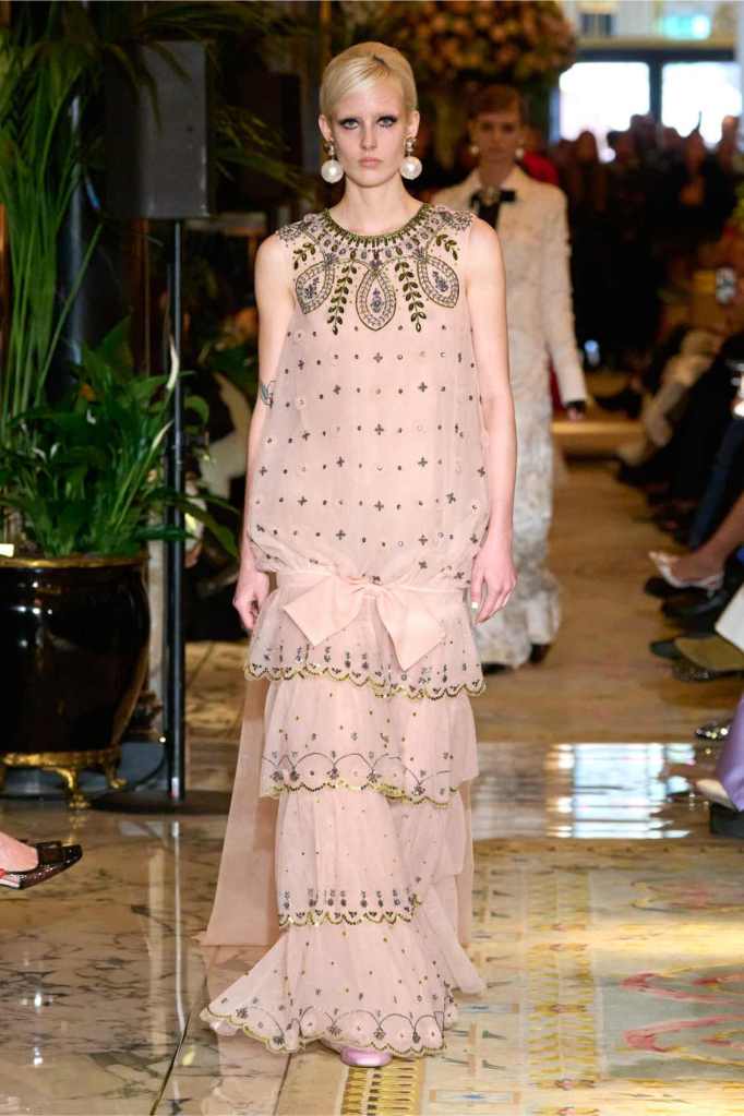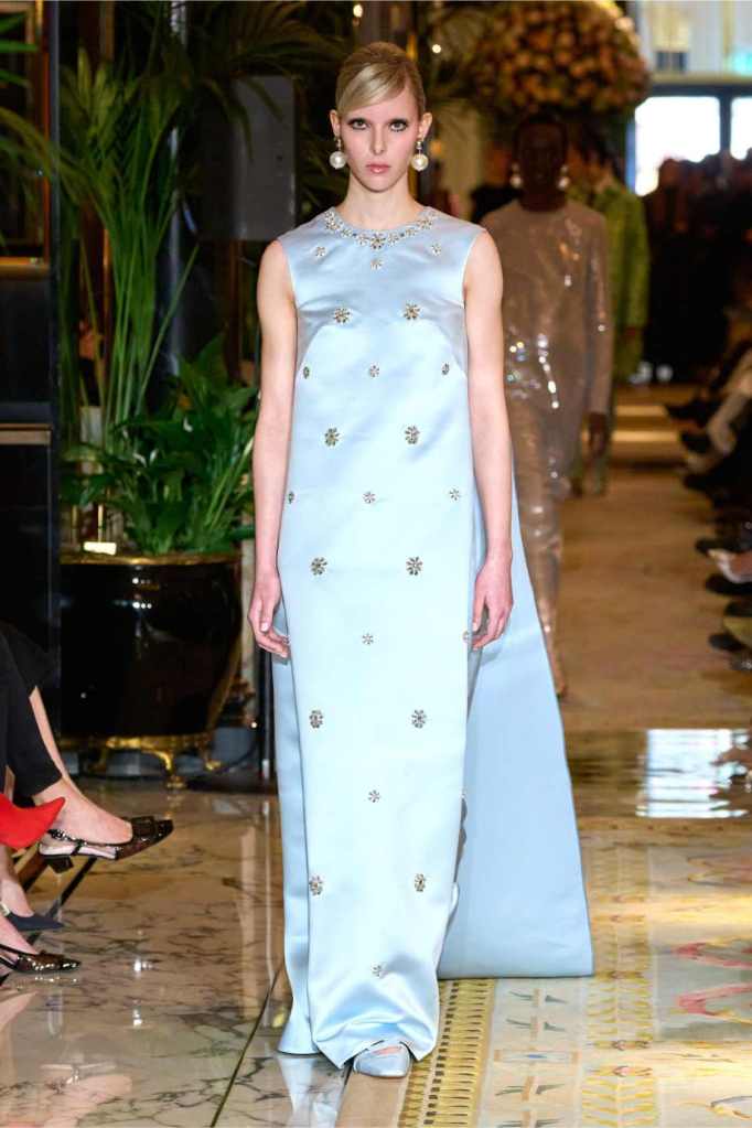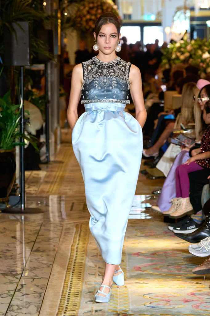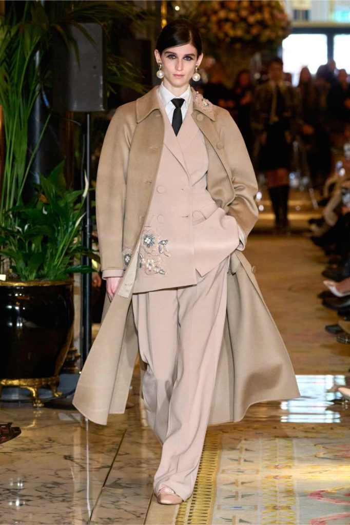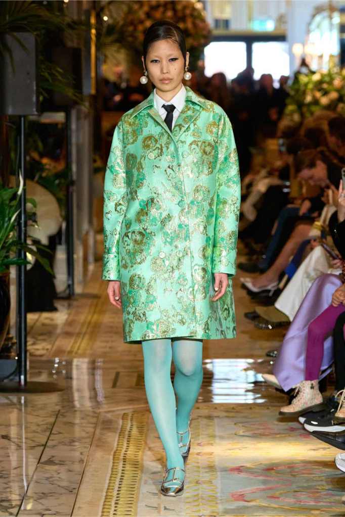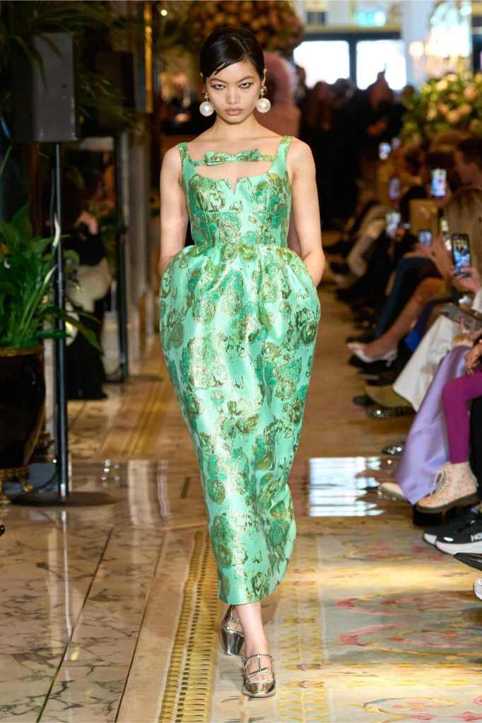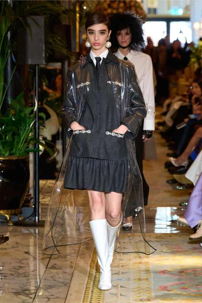 The collection had some fantastic individual pieces. His signature duchesse satin dresses, heavily embellished and red-carpet-ready, were definite standouts. The laser-cut floral fabrics and sequins brought a sense of opulence, while the transparent raincoats added an unexpected rebellious edge to otherwise polished looks. Some of the best moments came from his mix of British tailoring and eveningwear, like tweed suits softened with crystal brooches and perfectly cut skirts with embroidered details.