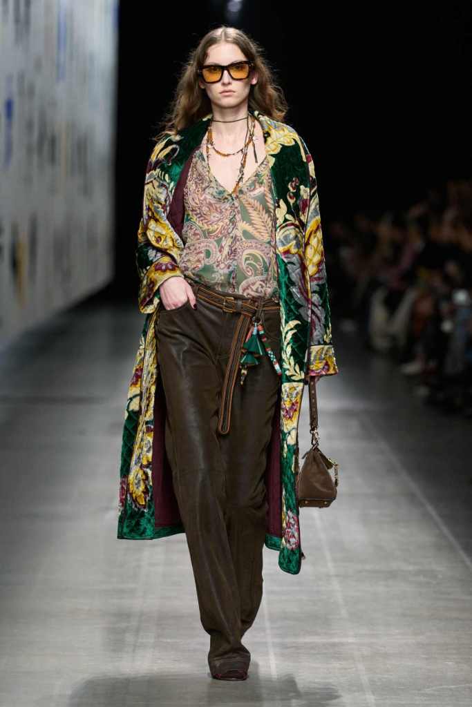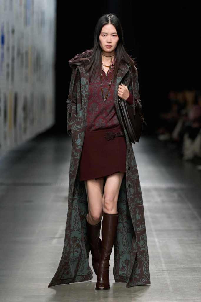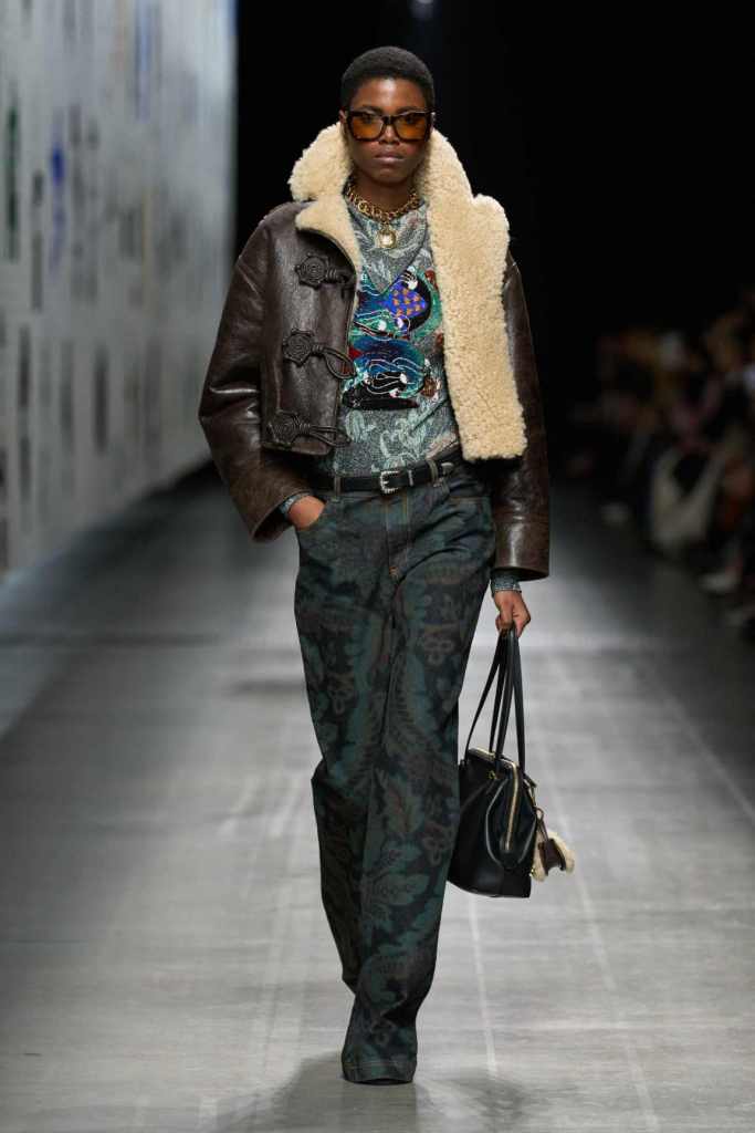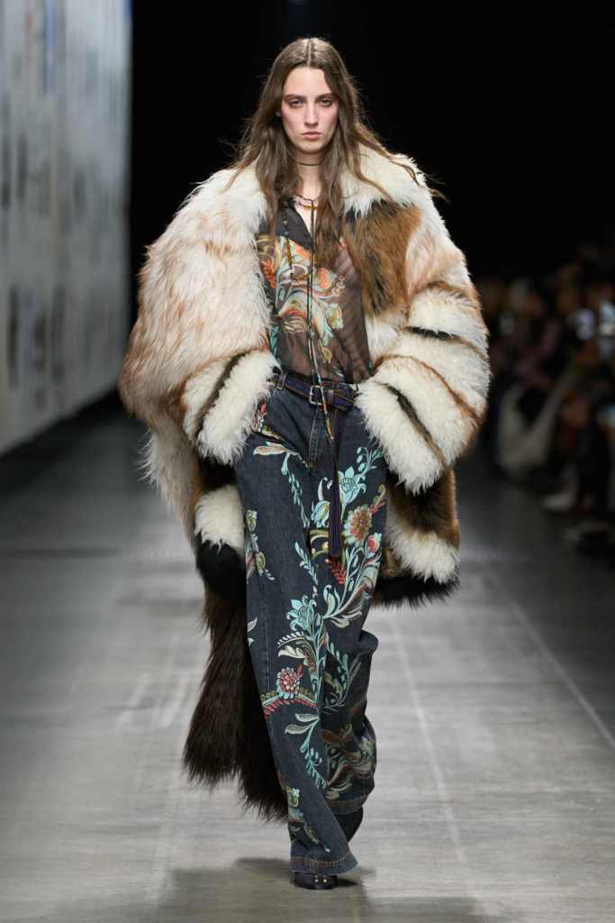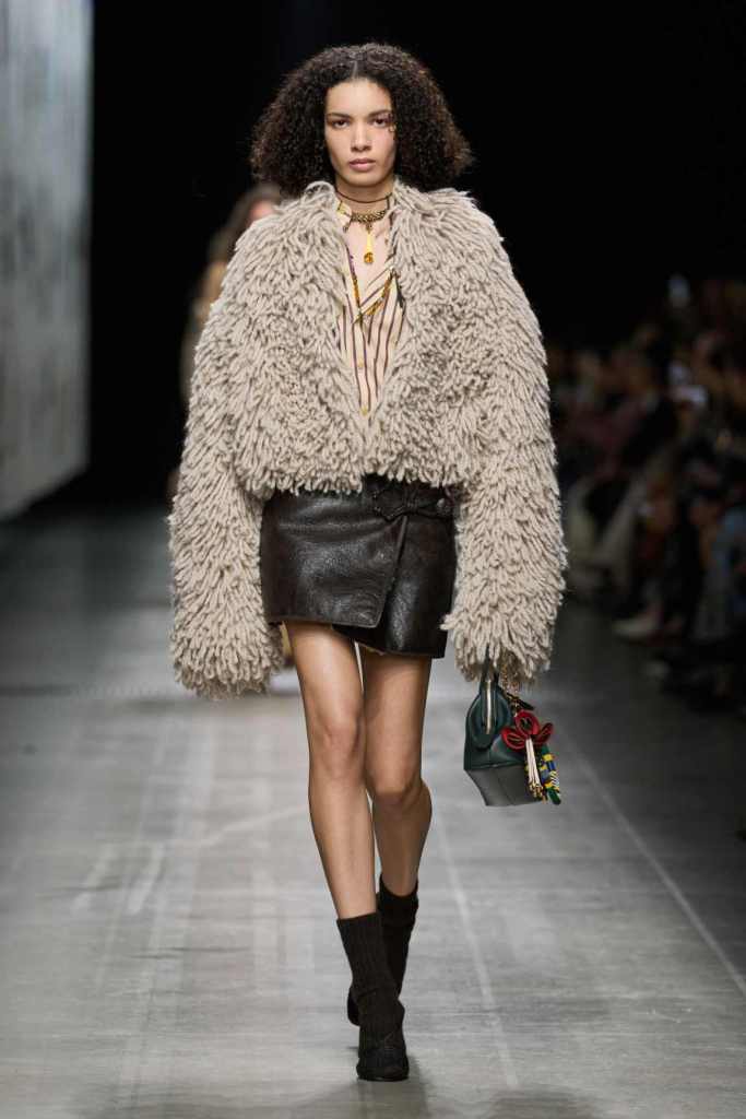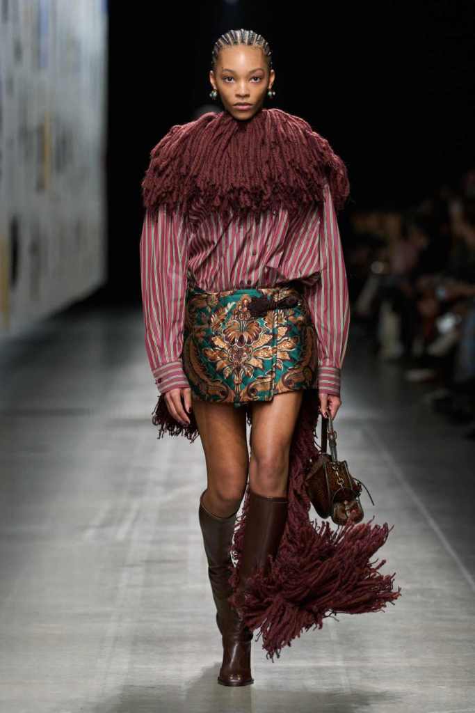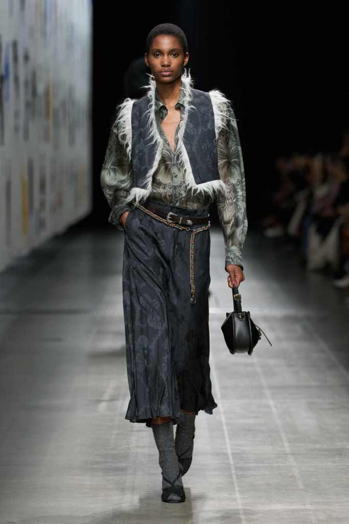 Furs were everywhere this season, but Etro’s stood out. The thick jacquards, statement wool coats, and wild fringes gave the collection a tactile intensity, while the prints—dense florals, abstracted paisleys, and intricate embroideries—added an almost mystical depth. De Vincenzo collaborated with Korean artist Maria Jeon on embroidered motifs inspired by fantastical zoology, which appeared on airy organza tunics and sweeping dusters. The whole collection had a sense of storytelling, as if each piece carried its own meaning.