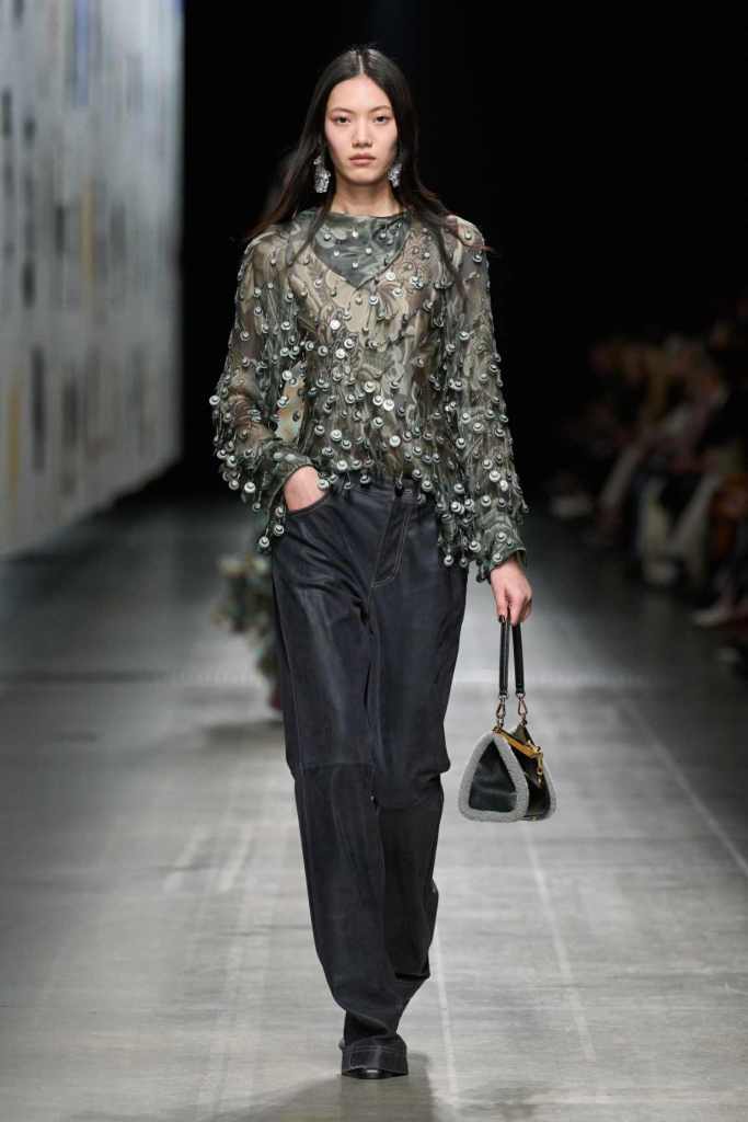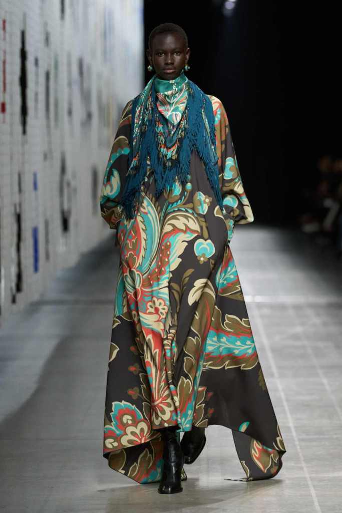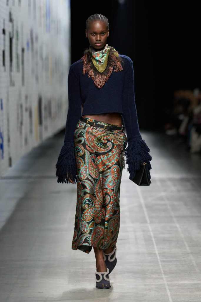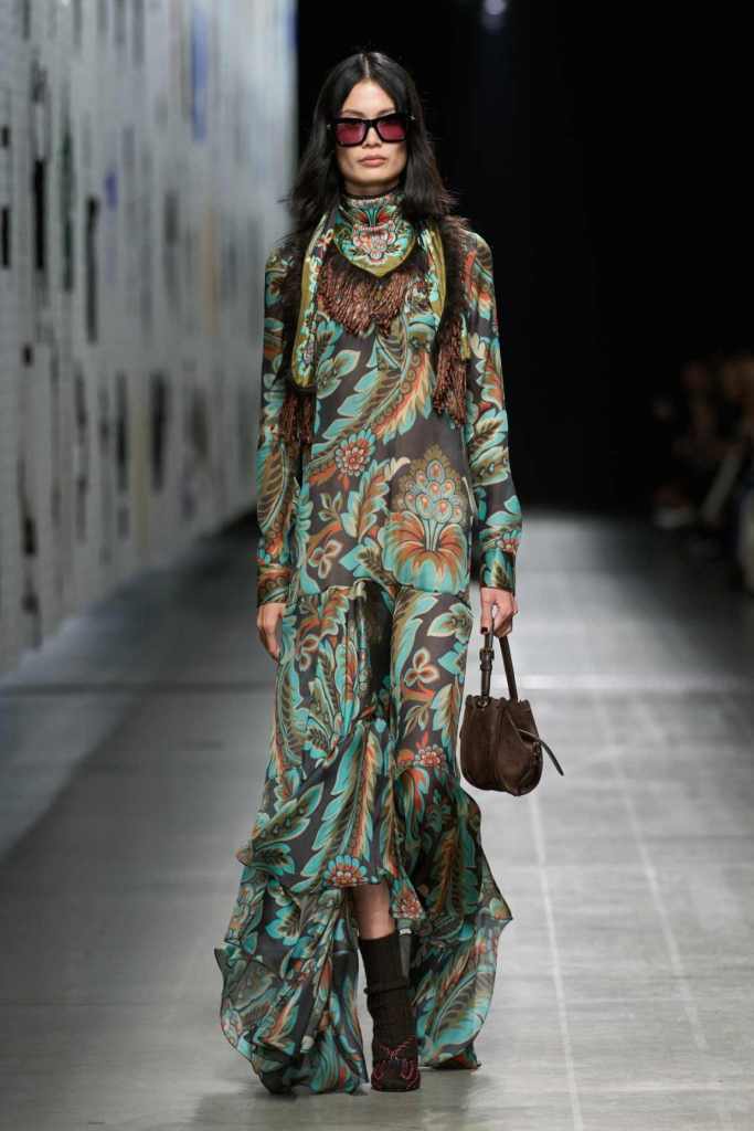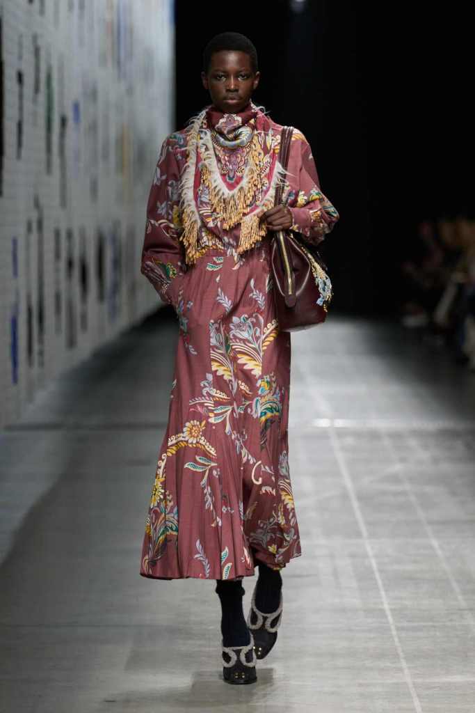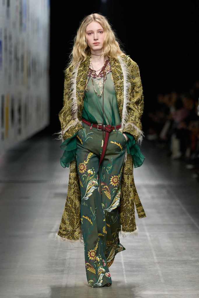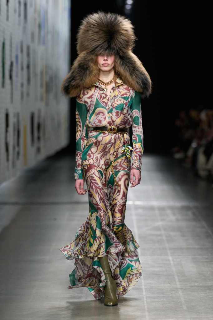 Furs were everywhere this season, but Etro’s stood out. The thick jacquards, statement wool coats, and wild fringes gave the collection a tactile intensity, while the prints—dense florals, abstracted paisleys, and intricate embroideries—added an almost mystical depth. De Vincenzo collaborated with Korean artist Maria Jeon on embroidered motifs inspired by fantastical zoology, which appeared on airy organza tunics and sweeping dusters. The whole collection had a sense of storytelling, as if each piece carried its own meaning.