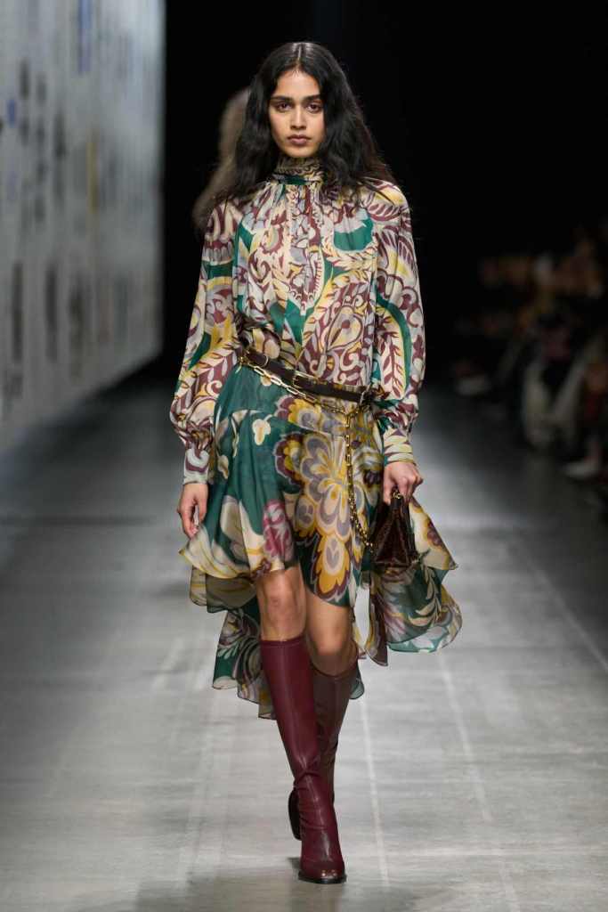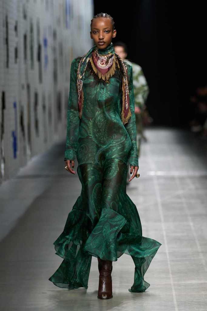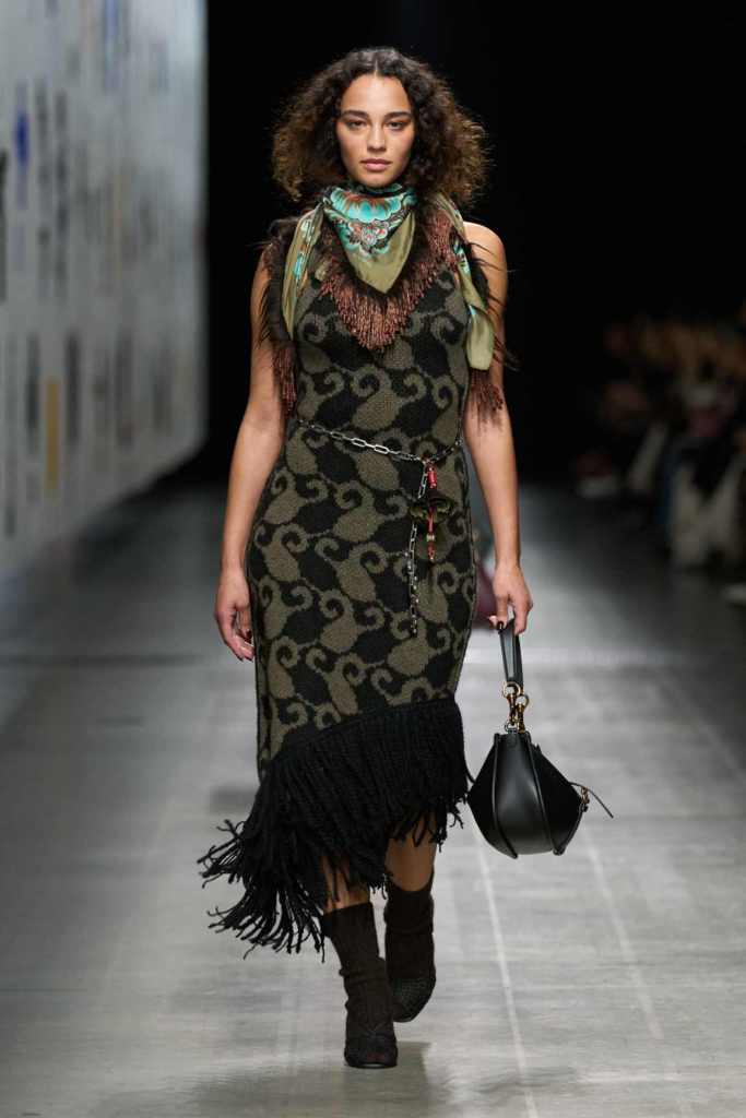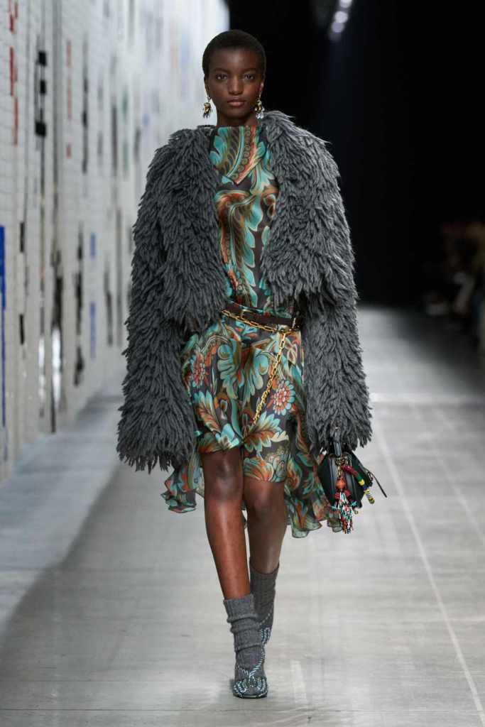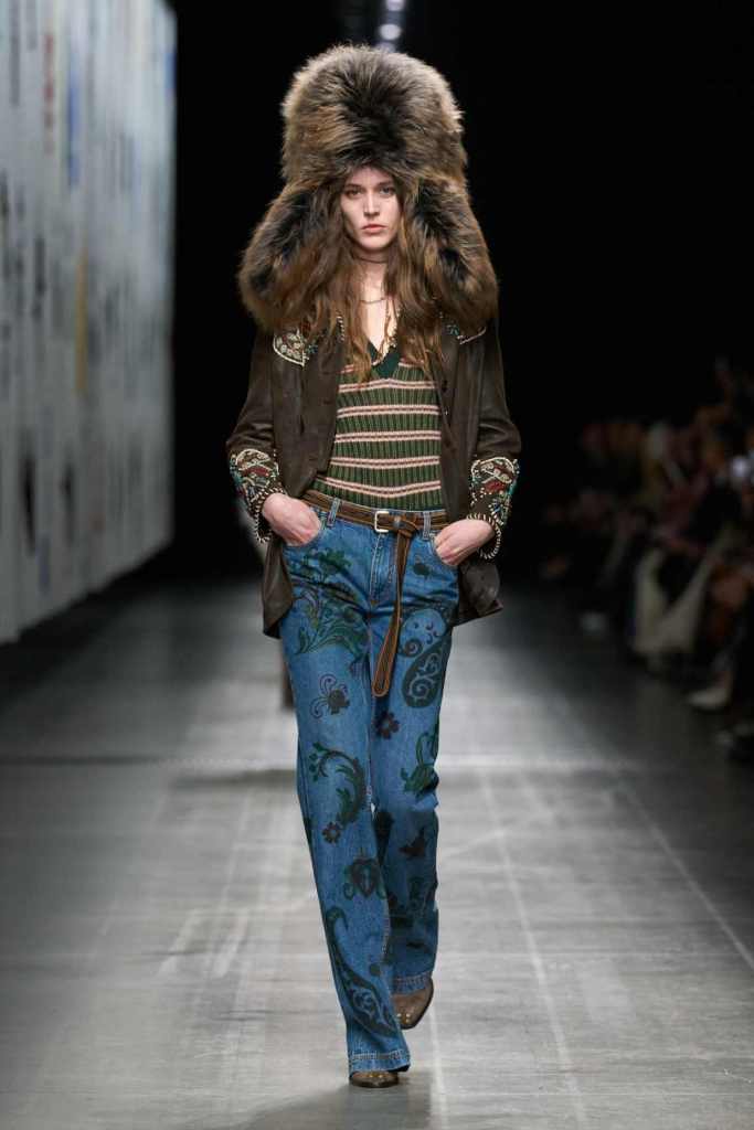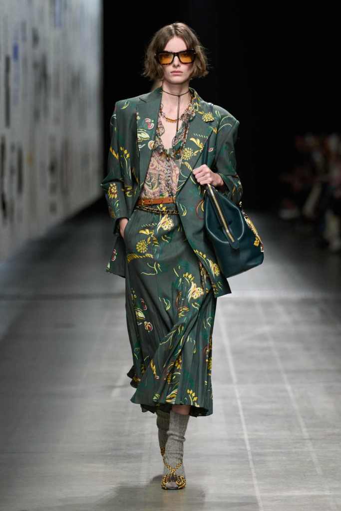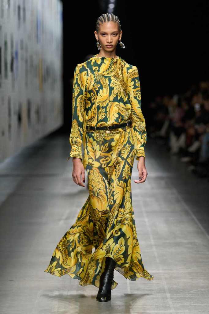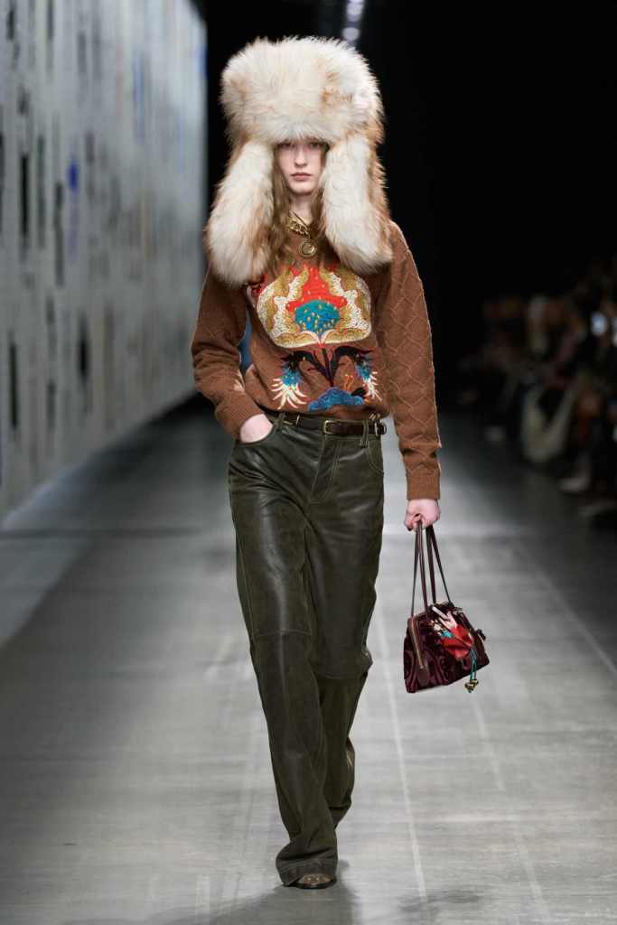 Furs were everywhere this season, but Etro’s stood out. The thick jacquards, statement wool coats, and wild fringes gave the collection a tactile intensity, while the prints—dense florals, abstracted paisleys, and intricate embroideries—added an almost mystical depth. De Vincenzo collaborated with Korean artist Maria Jeon on embroidered motifs inspired by fantastical zoology, which appeared on airy organza tunics and sweeping dusters. The whole collection had a sense of storytelling, as if each piece carried its own meaning.