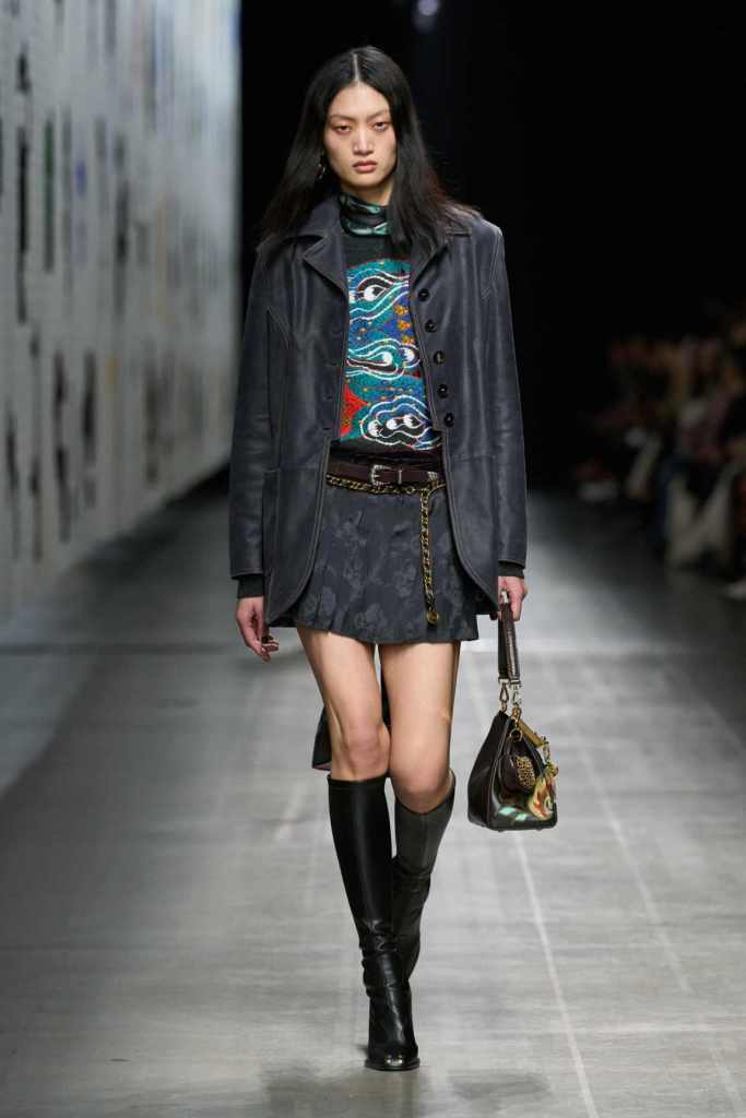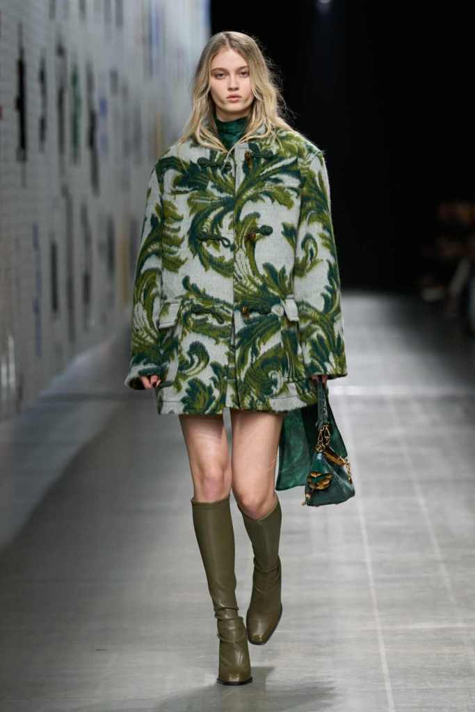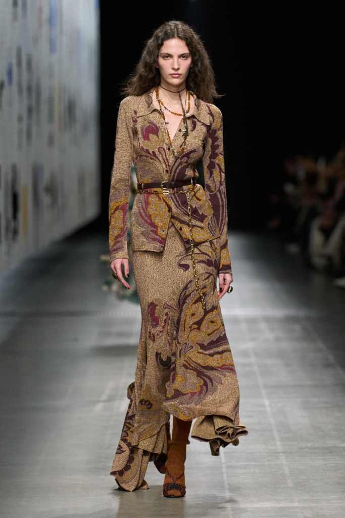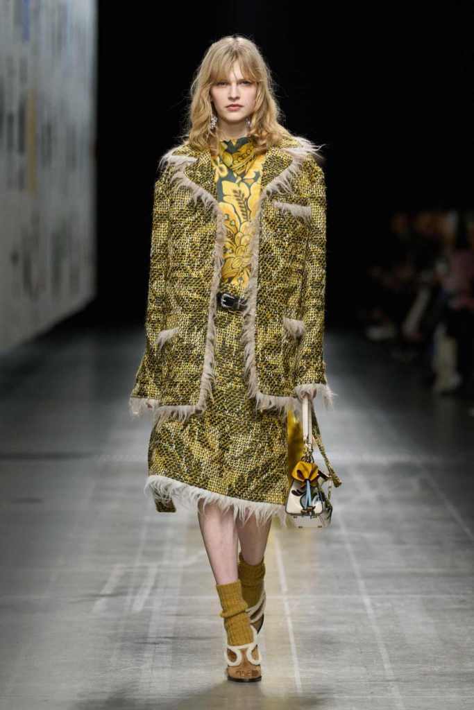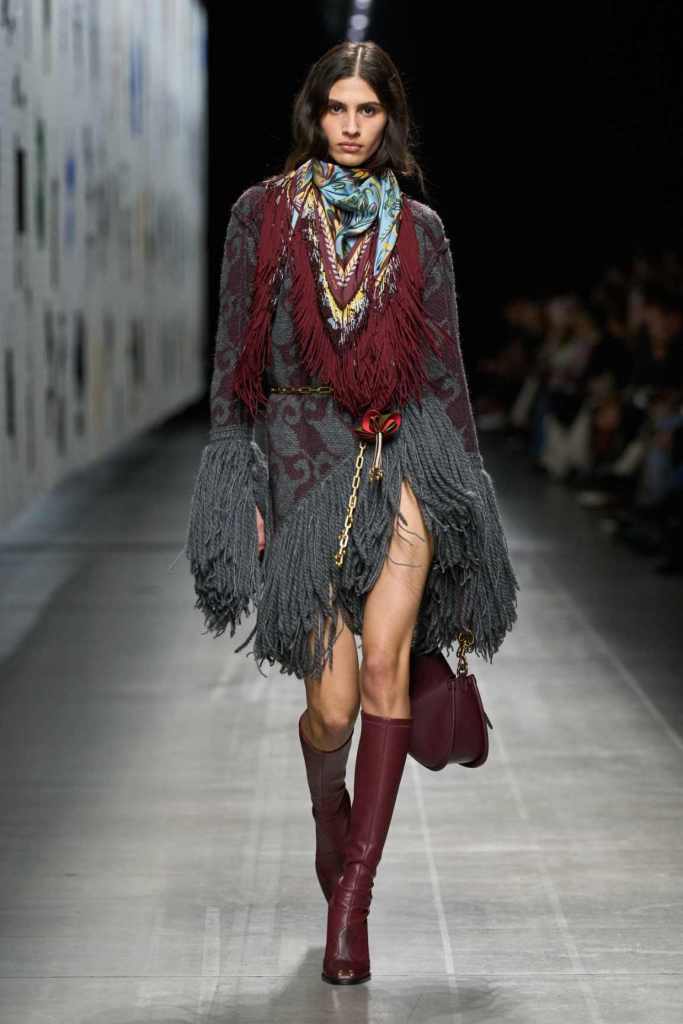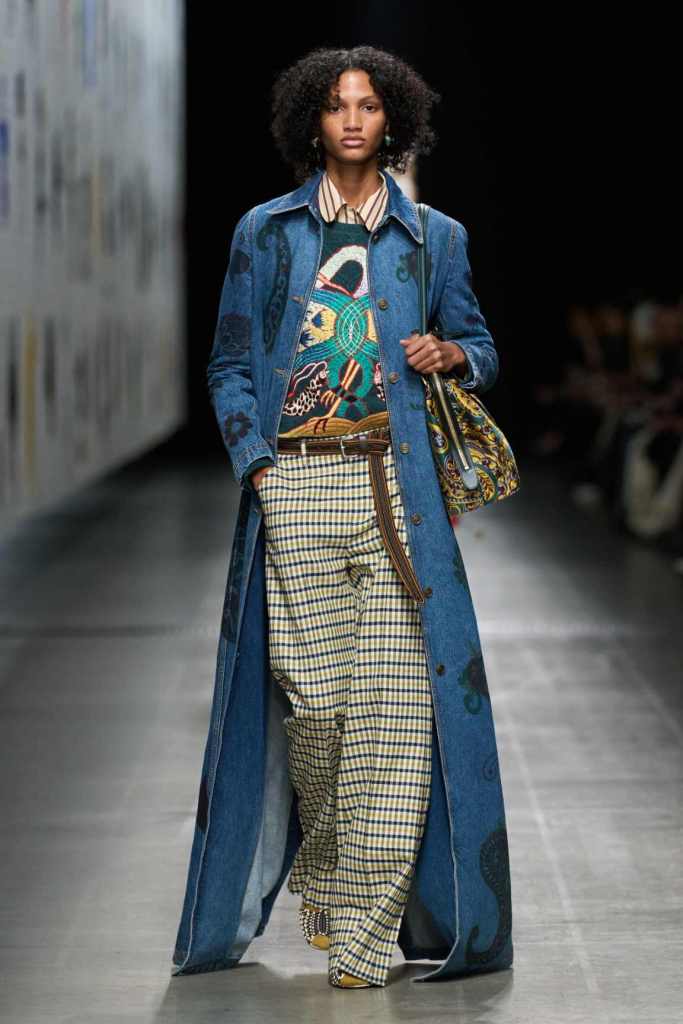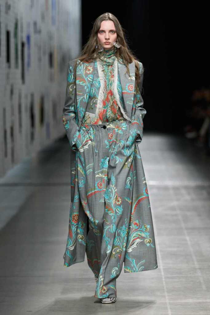 Furs were everywhere this season, but Etro’s stood out. The thick jacquards, statement wool coats, and wild fringes gave the collection a tactile intensity, while the prints—dense florals, abstracted paisleys, and intricate embroideries—added an almost mystical depth. De Vincenzo collaborated with Korean artist Maria Jeon on embroidered motifs inspired by fantastical zoology, which appeared on airy organza tunics and sweeping dusters. The whole collection had a sense of storytelling, as if each piece carried its own meaning.