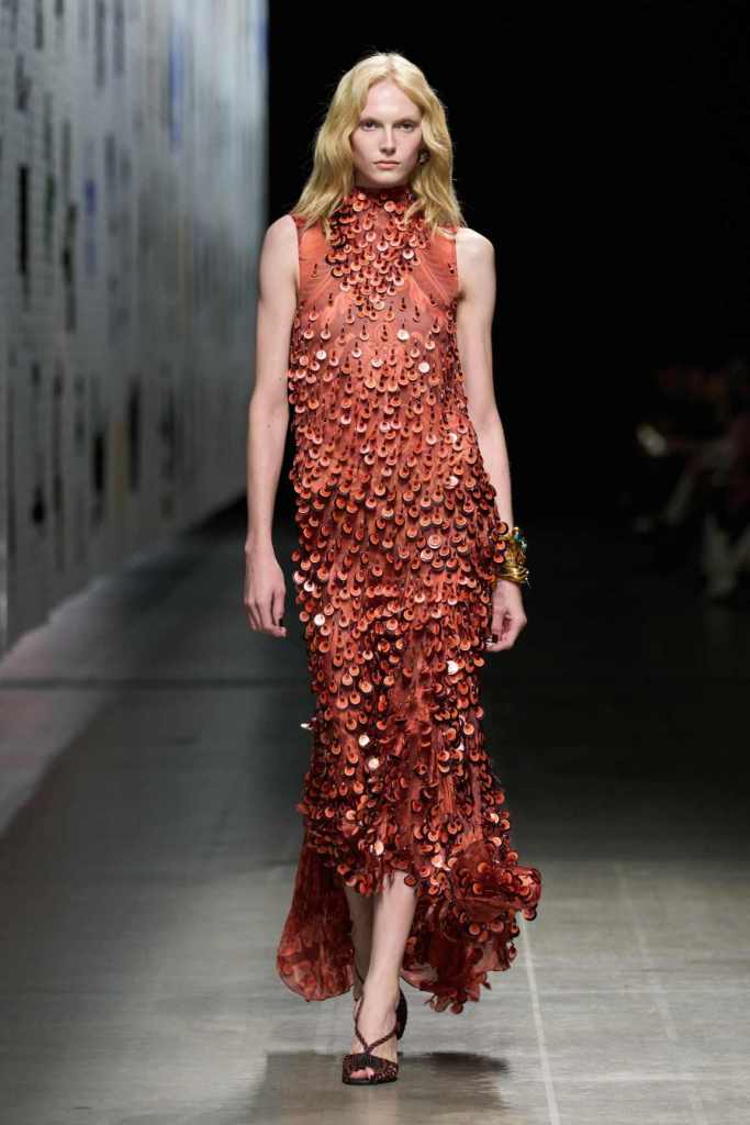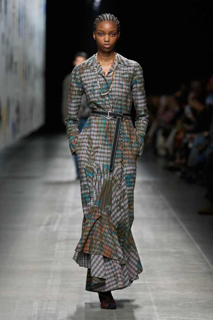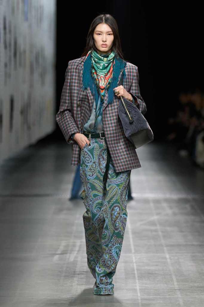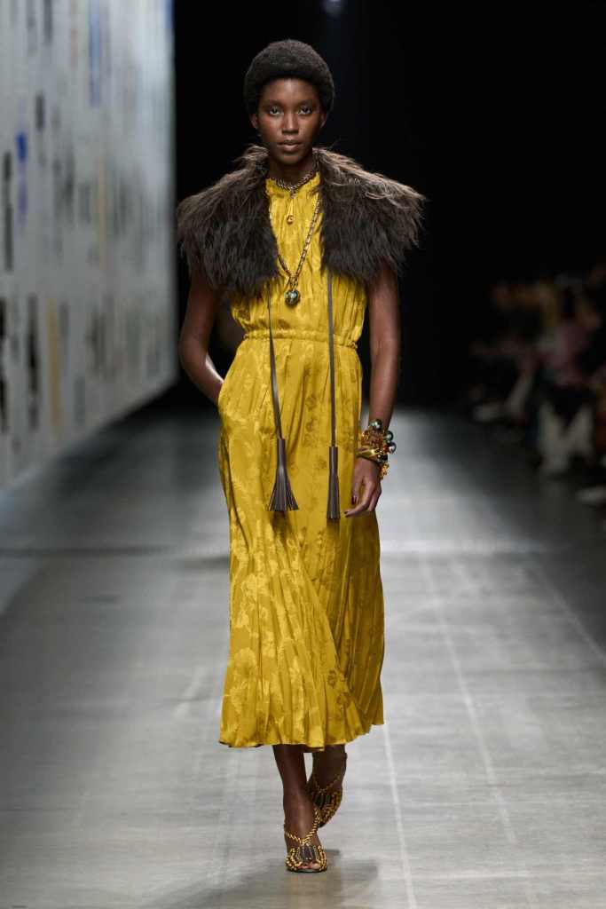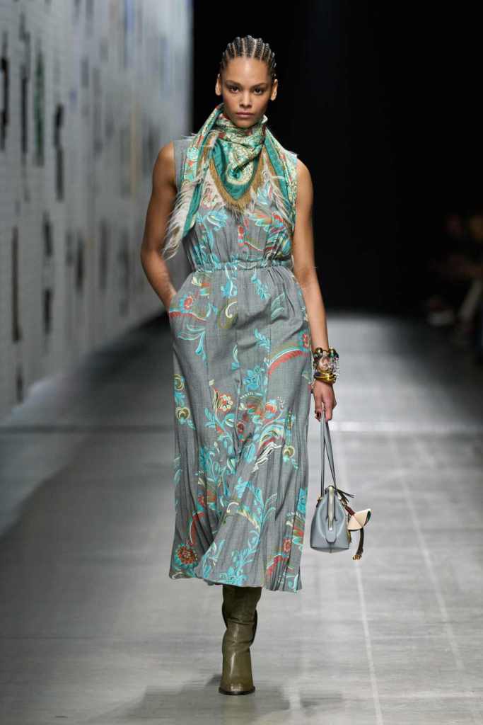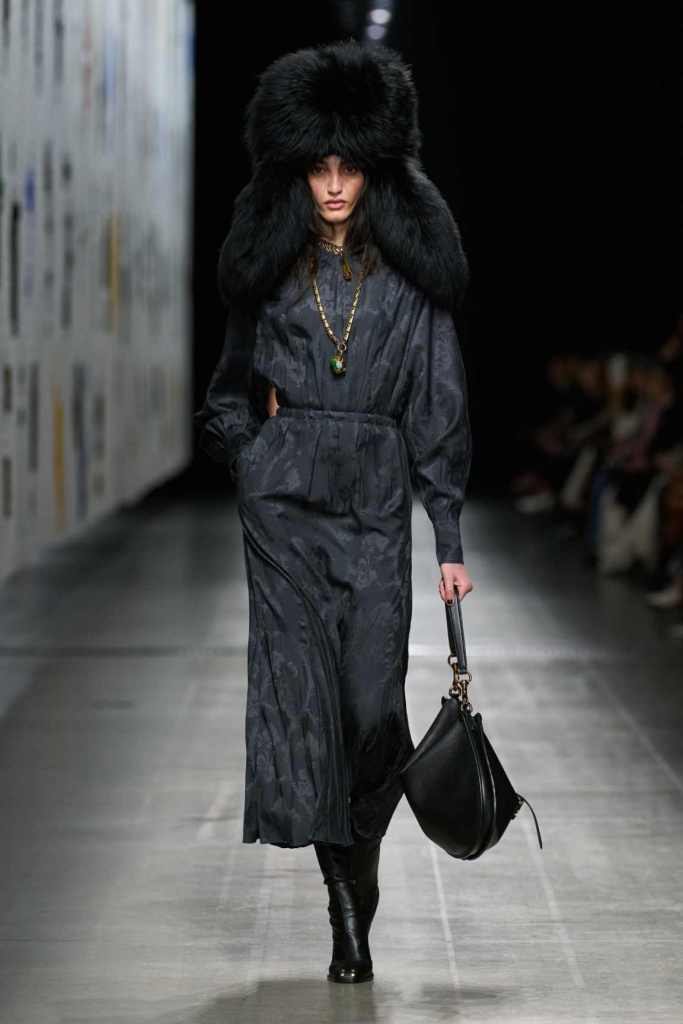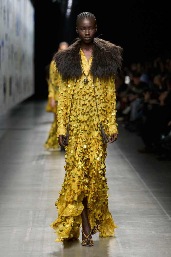 Furs were everywhere this season, but Etro’s stood out. The thick jacquards, statement wool coats, and wild fringes gave the collection a tactile intensity, while the prints—dense florals, abstracted paisleys, and intricate embroideries—added an almost mystical depth. De Vincenzo collaborated with Korean artist Maria Jeon on embroidered motifs inspired by fantastical zoology, which appeared on airy organza tunics and sweeping dusters. The whole collection had a sense of storytelling, as if each piece carried its own meaning.