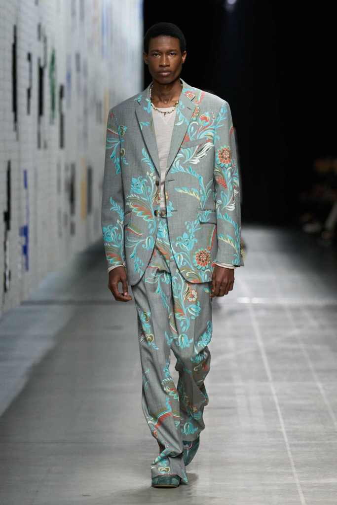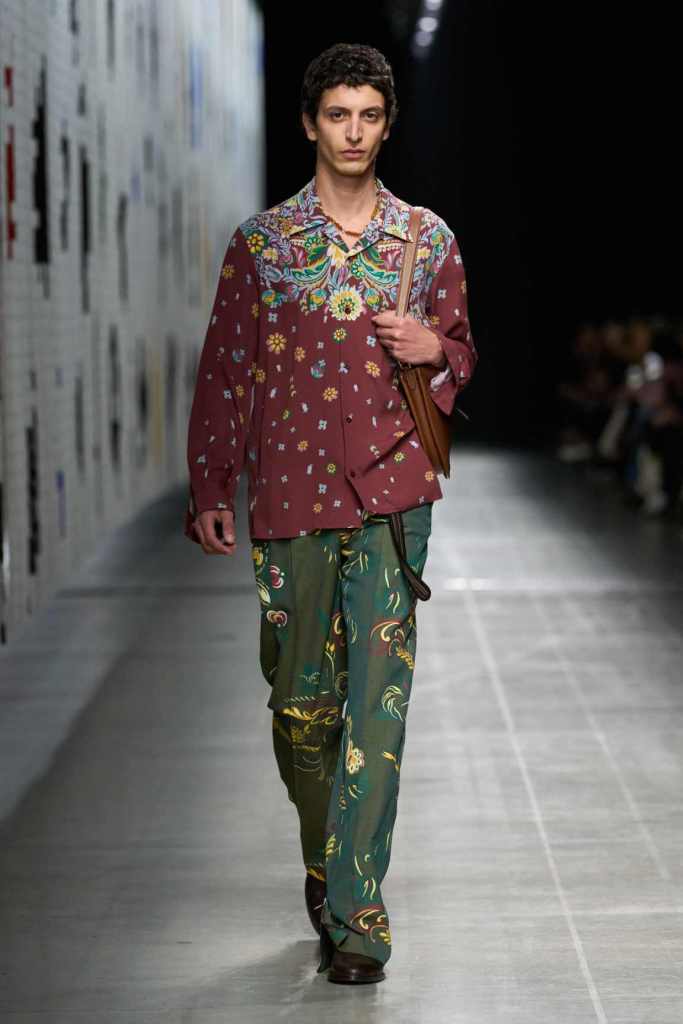 The set, designed by Roman art collective Numero Cromatico, featured a massive illustrated curtain of mythical creatures, hinting at the collection’s theme of prehistory meeting science fiction. This idea of origin and evolution was reflected in the garments, where ancient-feeling prints and handcrafted details met contemporary ease.