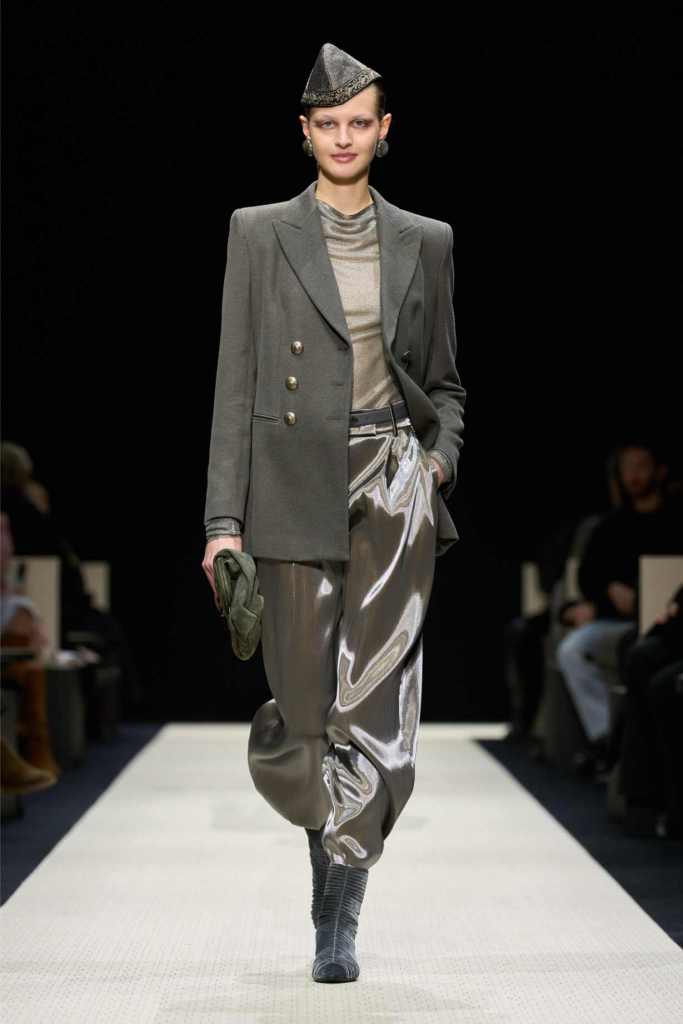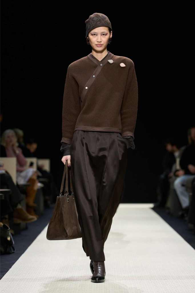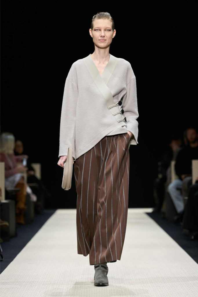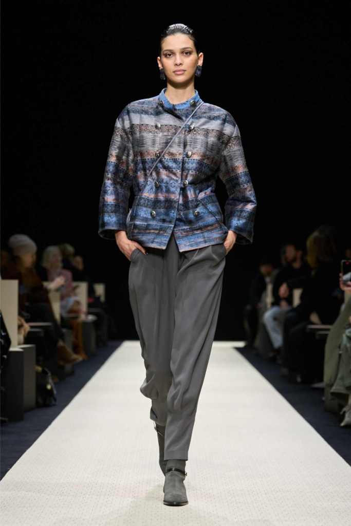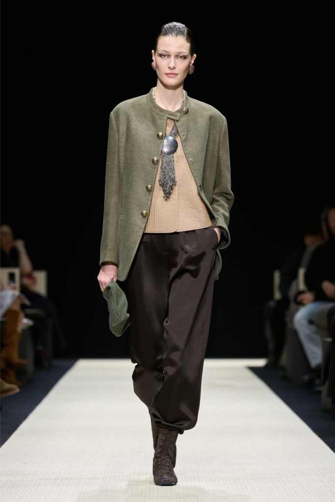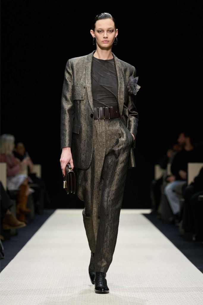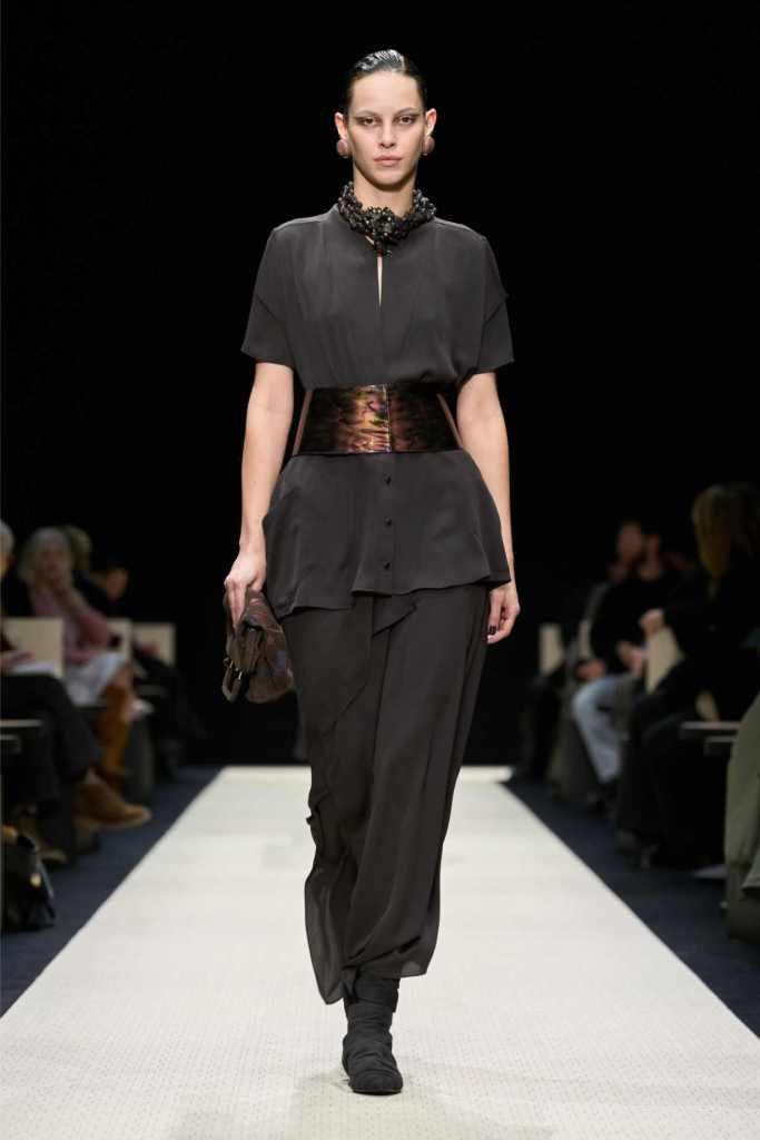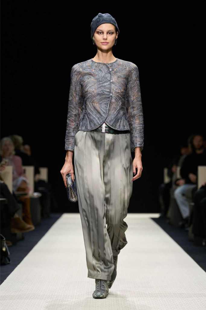 Armani’s signature tailoring was ever-present but reimagined in softer, more relaxed forms. Jackets had a deconstructed ease, often belted at the waist or cut in wrap styles inspired by global influences. The trousers, a standout feature, flowed effortlessly—some cinched at the ankle, others draped in elegant pleats, all moving with quiet confidence.