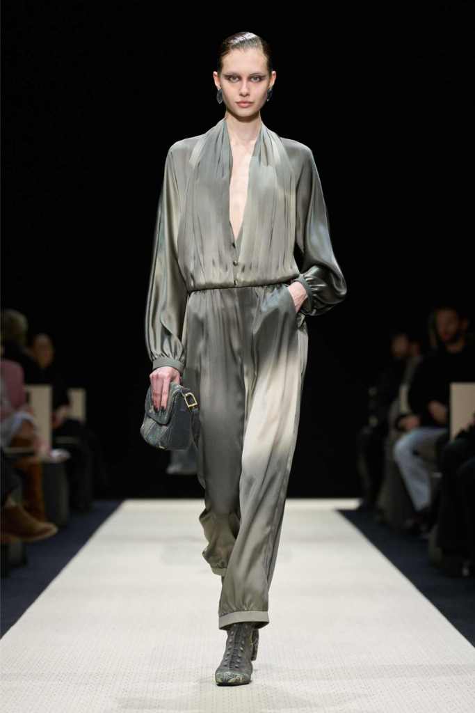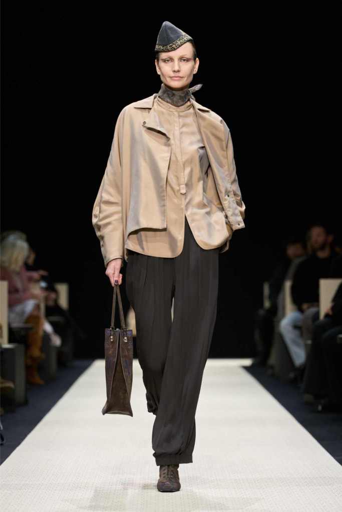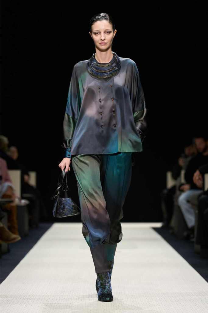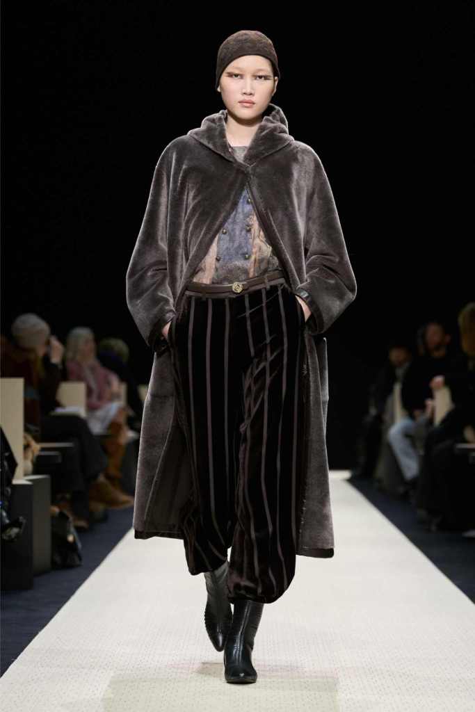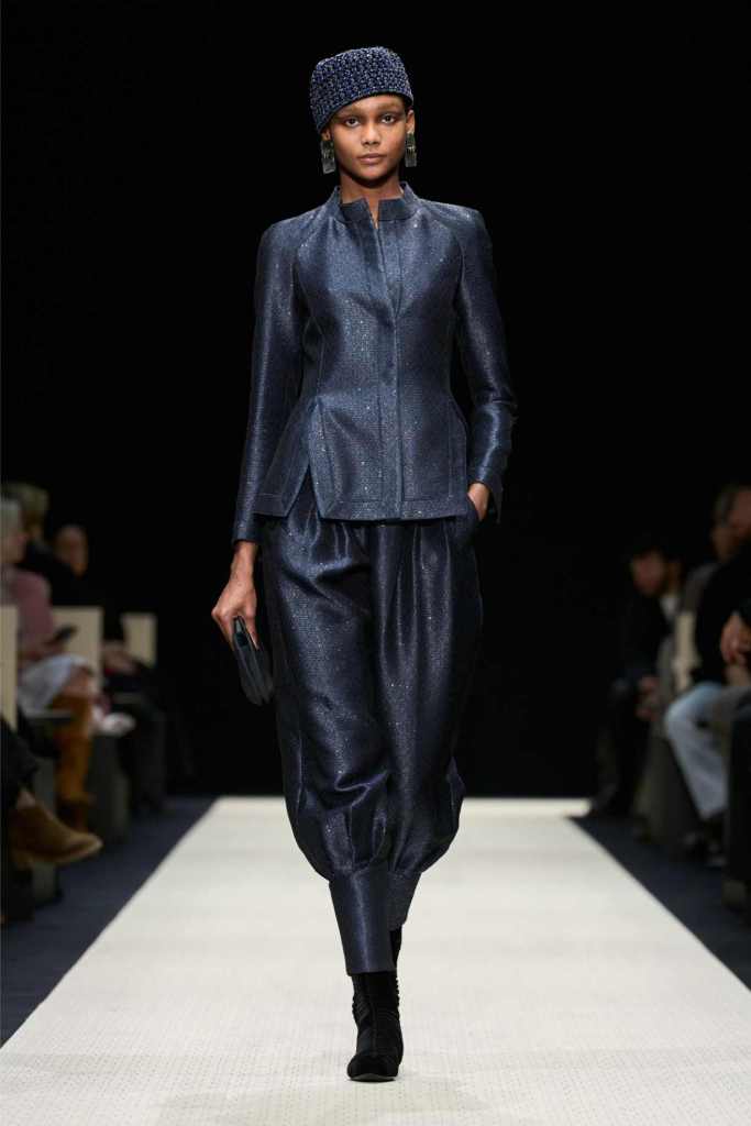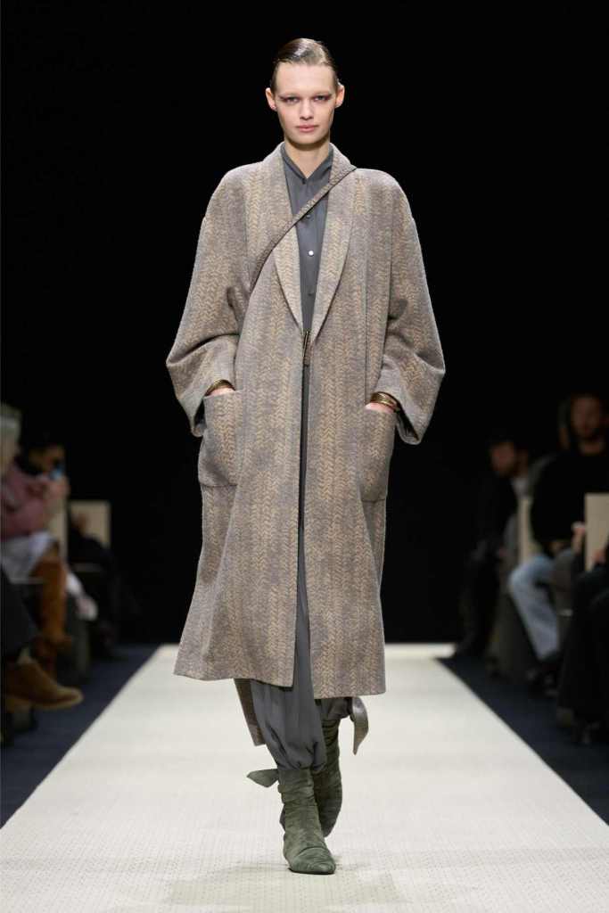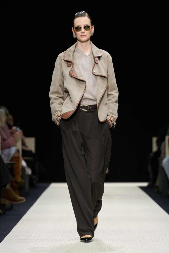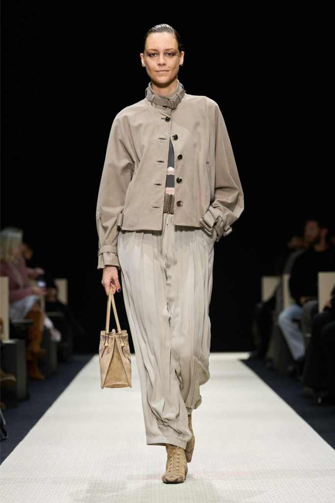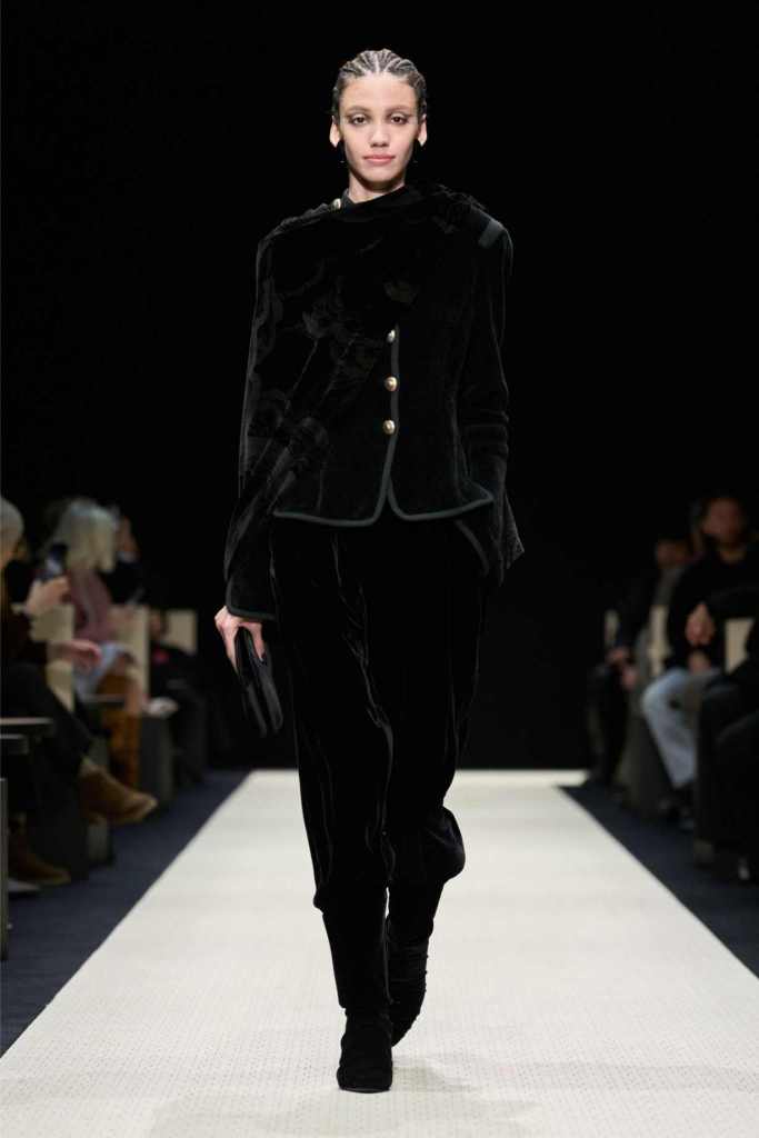 Armani’s signature tailoring was ever-present but reimagined in softer, more relaxed forms. Jackets had a deconstructed ease, often belted at the waist or cut in wrap styles inspired by global influences. The trousers, a standout feature, flowed effortlessly—some cinched at the ankle, others draped in elegant pleats, all moving with quiet confidence.