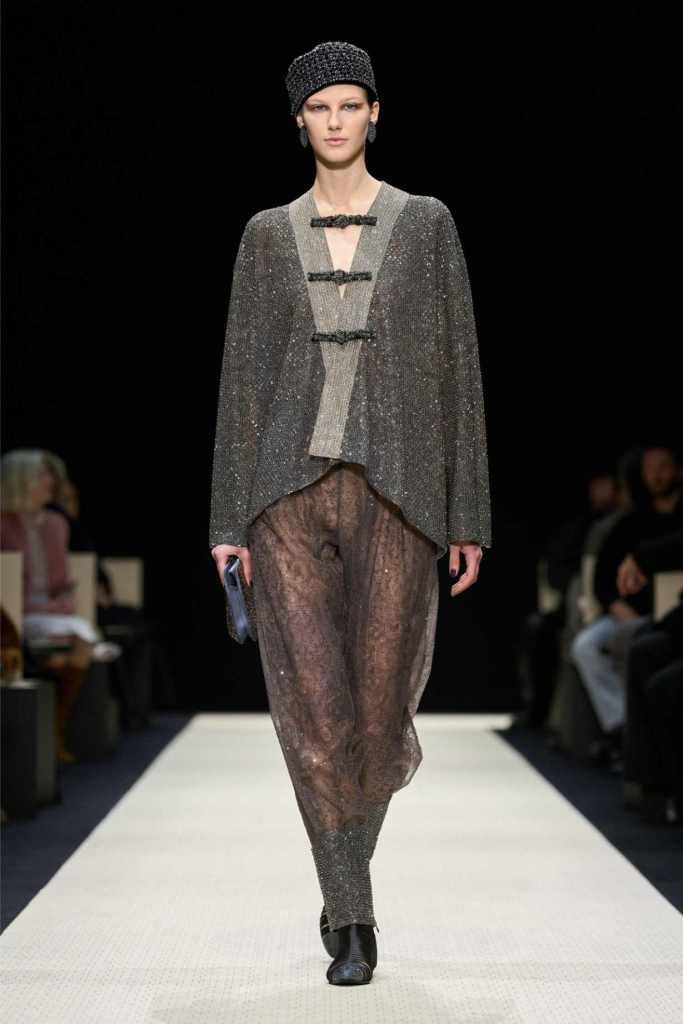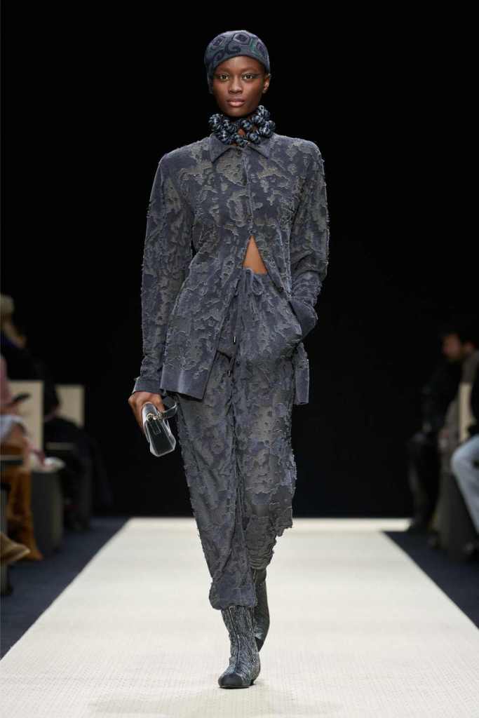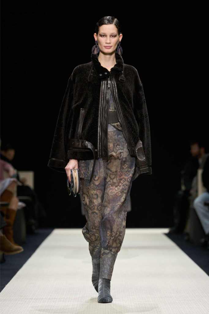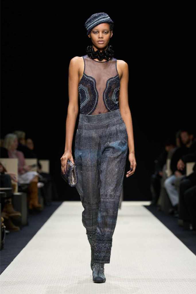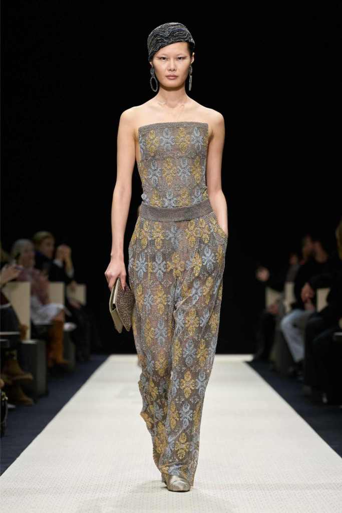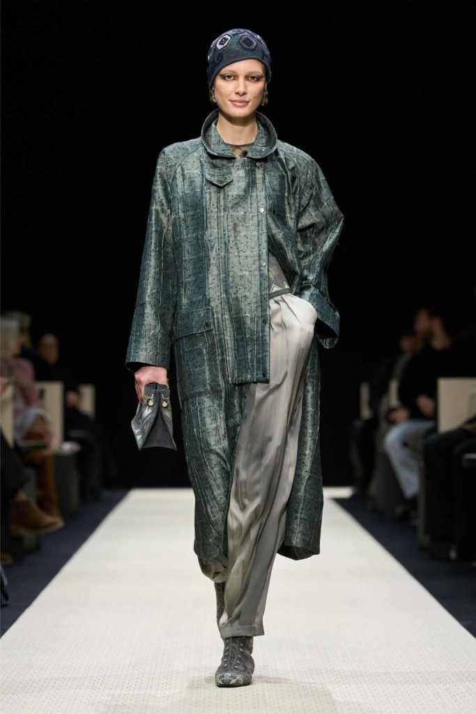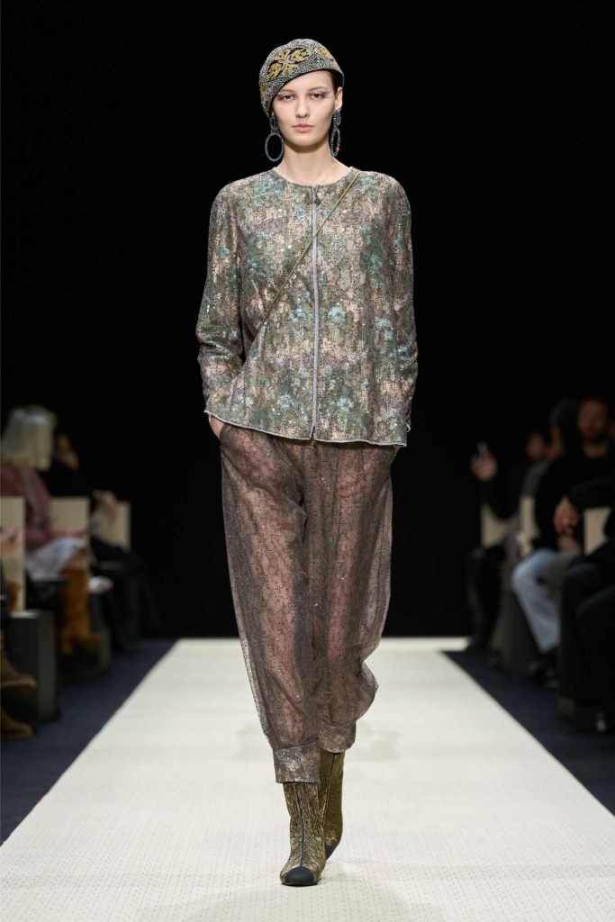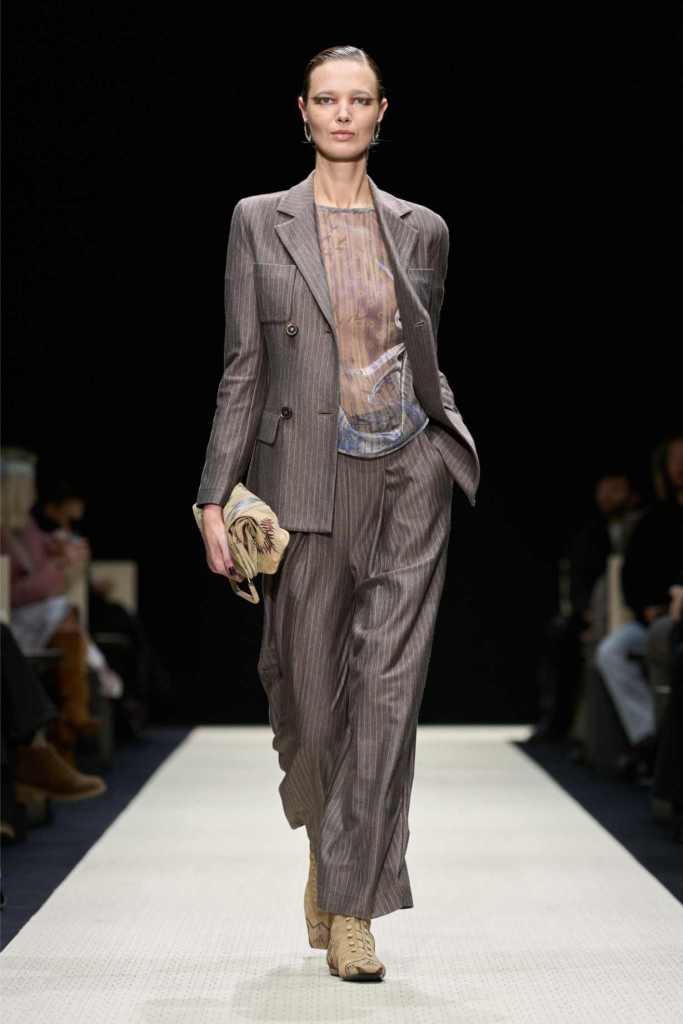 Armani’s signature tailoring was ever-present but reimagined in softer, more relaxed forms. Jackets had a deconstructed ease, often belted at the waist or cut in wrap styles inspired by global influences. The trousers, a standout feature, flowed effortlessly—some cinched at the ankle, others draped in elegant pleats, all moving with quiet confidence.