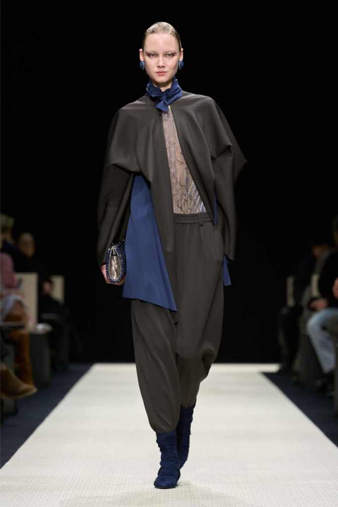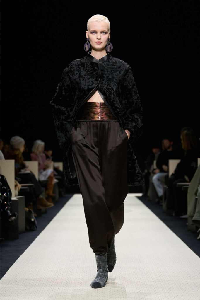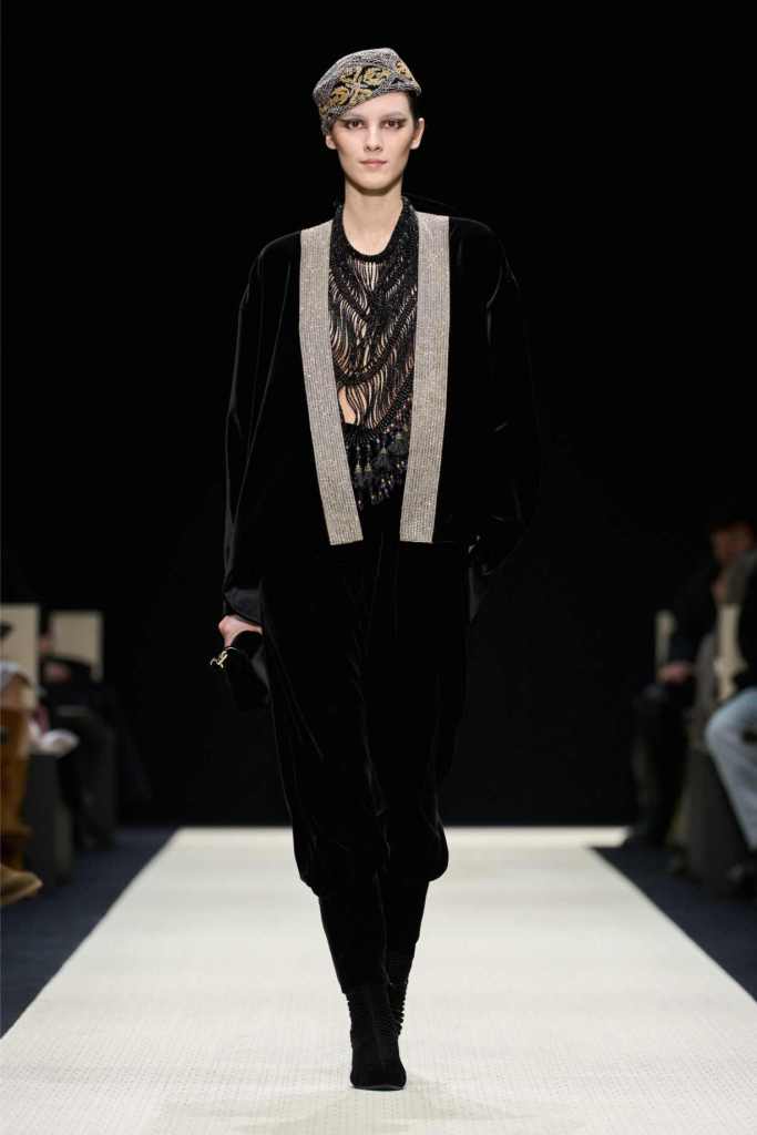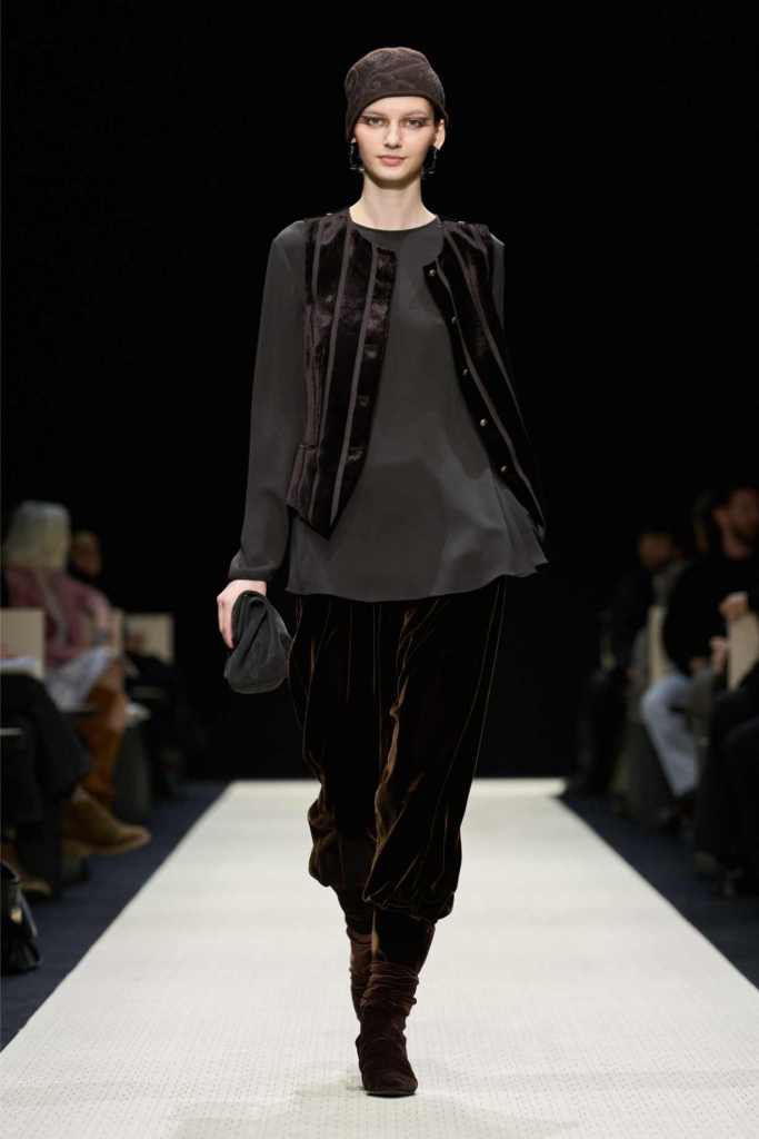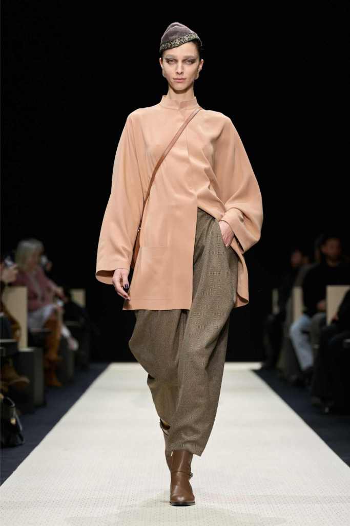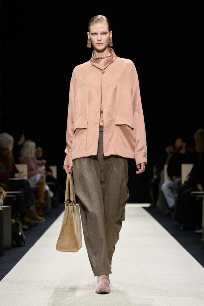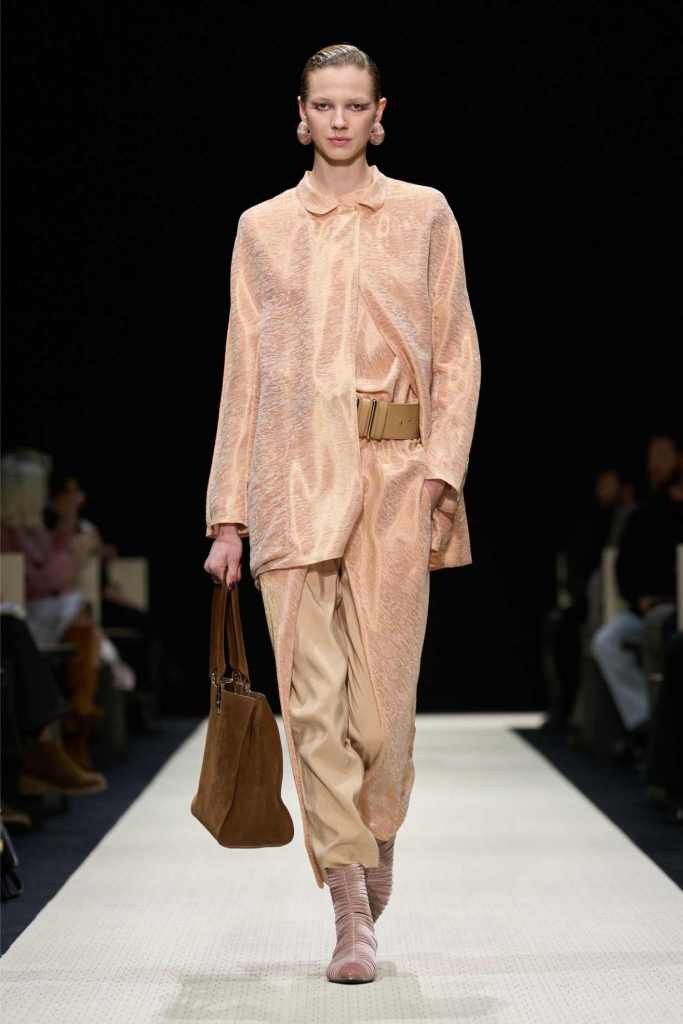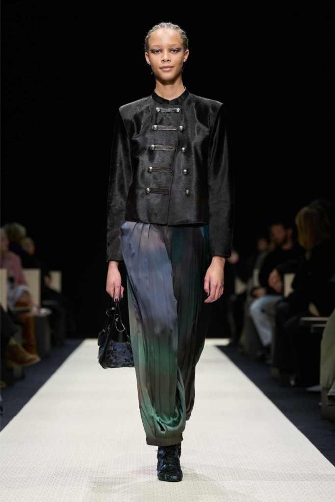 Armani’s signature tailoring was ever-present but reimagined in softer, more relaxed forms. Jackets had a deconstructed ease, often belted at the waist or cut in wrap styles inspired by global influences. The trousers, a standout feature, flowed effortlessly—some cinched at the ankle, others draped in elegant pleats, all moving with quiet confidence.